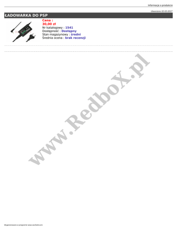Informacje o produkcie Utworzono 02-03-2017 ŁADOWARKA DO PSP Cena : 30,00 zł w w w .R ed b oX .p l Nr katalogowy : 1541 Dostępność : Dostępny Stan magazynowy : średni Średnia ocena : brak recenzji Wygenerowano w programie www.oscGold.com