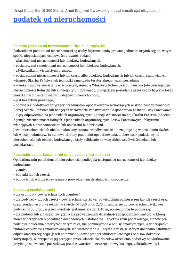 Urząd Gminy Ełk 19-300 Ełk, ul. Armii Krajowej 3 www.elk.gmina.pl e-mail: [email protected] podatek od nieruchomości Podmiot podatku od nieruchomości (kto musi zapłacić) Podatnikami podatku od nieruchomości są osoby fizyczne, osoby prawne, jednostki organizacyjne, w tym spółki, nieposiadające osobowości prawnej, będące: – właścicielami nieruchomości lub obiektów budowlanych, – posiadaczami samoistnymi nieruchomości lub obiektów budowlanych, – użytkownikami wieczystymi gruntów, – posiadaczami nieruchomości lub ich części albo obiektów budowlanych lub ich części, stanowiących własność Skarbu Państwa lub jednostki samorządu terytorialnego, jeżeli posiadanie: – wynika z umowy zawartej z właścicielem, Agencją Własności Rolnej Skarbu Państwa (obecnie Agencja Nieruchomości Rolnych) lub z innego tytułu prawnego, z wyjątkiem posiadania przez osoby fizyczne lokali mieszkalnych niestanowiących odrębnych nieruchomości, – jest bez tytułu prawnego, – obowiązek podatkowy dotyczący przedmiotów opodatkowania wchodzących w skład Zasobu Własności Rolnej Skarbu Państwa lub będących w zarządzie Państwowego Gospodarstwa Leśnego Lasy Państwowe – ciąży odpowiednio na jednostkach organizacyjnych Agencji Własności Rolnej Skarbu Państwa (obecnie Agencja Nieruchomości Rolnych) i jednostkach organizacyjnych Lasów Państwowych, faktycznie władających nieruchomościami lub obiektami budowlanymi. Jeżeli nieruchomość lub obiekt budowlany stanowi współwłasność lub znajduje się w posiadaniu dwóch lub więcej podmiotów, to stanowi odrębny przedmiot opodatkowania, a obowiązek podatkowy od nieruchomości lub obiektu budowlanego ciąży solidarnie na wszystkich współwłaścicielach lub posiadaczach. Przedmiot opodatkowania (od czego płacony jest podatek) Opodatkowaniu podatkiem od nieruchomości podlegają następujące nieruchomości lub obiekty budowlane: – grunty, – budynki lub ich części, – budowle lub ich części związane z prowadzeniem działalności gospodarczej. Podstawa opodatkowania – dla gruntów – powierzchnia tych gruntów, – dla budynków lub ich części – powierzchnia użytkowa (powierzchnia pomieszczeń lub ich części oraz część kondygnacji o wysokości w świetle od 1,40 m do 2,20 m zalicza się do powierzchni użytkowej budynku w 50 proc., a jeżeli wysokość jest mniejsza niż 1,40 m, powierzchnię tę pomija się) – dla budowli lub ich części związanych z prowadzeniem działalności gospodarczej- wartość, o której mowa w przepisach o podatkach dochodowych, ustalona na 1 stycznia roku podatkowego, stanowiąca podstawę obliczania amortyzacji w tym roku, nie pomniejszona o odpisy amortyzacyjne, a w przypadku budowli całkowicie zamortyzowanych- ich wartość z dnia 1 stycznia roku, w którym dokonano ostatniego odpisu amortyzacyjnego. Jeżeli natomiast budowla jest przedmiotem leasingu i odpisów dokonuje korzystający, w przypadku jej przejęcia przez właściciela, do celów określenia podstawy opodatkowania przyjmuje się wartość początkową przed zawarciem pierwszej umowy leasingu, zaktualizowaną i Urząd Gminy Ełk 19-300 Ełk, ul. Armii Krajowej 3 www.elk.gmina.pl e-mail: [email protected] powiększoną o dokonane ulepszenia oraz niepomniejszoną o spłatę wartości początkowej. W przypadku kiedy od budowli lub ich części nie dokonuje się odpisów amortyzacyjnych, podstawę opodatkowania stanowi ich wartość rynkowa określona przez podatnika na dzień powstania obowiązku podatkowego. Co zrobić, by opłacić podatek od osób fizycznych Osoby fizyczne, są obowiązane złożyć właściwemu organowi podatkowemu informację o nieruchomościach i obiektach budowlanych, sporządzoną na formularzu według ustalonego przez Radę Gminy Ełk wzoru INRL – 1 – pobierz tutaj , w terminie 14 dni od dnia wystąpienia okoliczności uzasadniających powstanie albo wygaśnięcie obowiązku podatkowego w zakresie podatku od nieruchomości lub od dnia zaistnienia zmian mających wpływ na wysokość zobowiązania podatkowego oraz załączyć następujące dokumenty: – akt notarialny, – umowa dzierżawy, najmu, użyczenia, – postanowienie Sądu, – pozwolenie na użytkowanie, zawiadomienie o zakończeniu budowy lub odbiór budynku (oryginał lub kopia potwierdzona za zgodność z oryginałem). Podatek od nieruchomości na rok podatkowy od osób fizycznych, ustala w drodze decyzji organ podatkowy właściwy ze względu na miejsce położenia przedmiotów opodatkowania. UWAGA! Jeżeli nieruchomość lub obiekt budowlany stanowi współwłasność lub znajduje się w posiadaniu osób fizycznych oraz osób prawnych, jednostek organizacyjnych nieposiadających osobowości prawnej lub spółek nieposiadających osobowości prawnej, z wyjątkiem osób tworzących wspólnotę mieszkaniową, osoby fizyczne składają deklarację na podatek od nieruchomości oraz opłacają podatek na zasadach obowiązujących osoby prawne. Co zrobić, by opłacać podatek od osób prawnych Osoby prawne, jednostki organizacyjne oraz spółki niemające osobowości prawnej, jednostki organizacyjne Agencji Nieruchomości Rolnych, a także jednostki organizacyjne Państwowego Gospodarstwa Leśnego Lasy Państwowe są obowiązane: – składać, w terminie do dnia 31 stycznia, organowi podatkowemu właściwemu ze względu na miejsce położenia przedmiotów opodatkowania, deklaracje na podatek od nieruchomości na dany rok podatkowy, sporządzone na formularzu według ustalonego przez Radę Gminy Ełk wzoru, a jeżeli obowiązek podatkowy powstał po tym dniu – w terminie 14 dni od dnia zaistnienia okoliczności uzasadniających powstanie tego obowiązku, – odpowiednio skorygować deklaracje w razie zaistnienia zdarzenia, o którym mowa w ust. 3, w terminie 14 dni od dnia zaistnienia tego zdarzenia, – deklaracja na podatek od nieruchomości na formularzu DN – 1 – pobierz tutaj, a w 