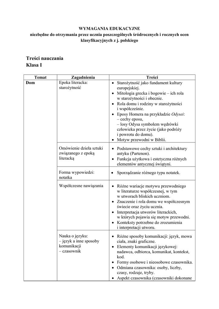 WYMAGANIA EDUKACYJNE niezbędne do otrzymania przez ucznia poszczególnych śródrocznych i rocznych ocen klasyfikacyjnych z j. polskiego Treści nauczania Klasa I Temat Dom Zagadnienia Epoka literacka: starożytność Treści Starożytność jako fundament kultury europejskiej. Mitologia grecka i bogowie ‒ ich rola w starożytności i obecnie. Rola domu i rodziny w starożytności i współcześnie. Eposy Homera na przykładzie Odysei: ‒ cechy eposu, ‒ losy Odysa symbolem wędrówki człowieka przez życie (jako podróży i powrotu do domu). Motyw przewodni w Biblii. Omówienie dzieła sztuki związanego z epoką literacką Podstawowe cechy sztuki i architektury antyku (Partenon). Funkcja użytkowa i estetyczna różnych elementów antycznej świątyni. Forma wypowiedzi: notatka Sporządzanie różnego typu notatek. Współczesne nawiązania Różne wariacje motywu przewodniego w literaturze współczesnej, w tym w utworach bliskich uczniom. Znaczenie i rola domu we współczesnym świecie oraz życiu ucznia. Interpretacja utworów literackich, w których pojawia się motyw przewodni. Konteksty potrzebne do zrozumienia i interpretacji utworu. Nauka o języku: ‒ język a inne sposoby komunikacji ‒ czasownik Różne sposoby komunikacji: język, mowa ciała, znaki graficzne. Elementy komunikacji językowej: nadawca, odbiorca, komunikat, kontekst, kod. Formy osobowe i nieosobowe czasownika. Odmiana czasownika: osoby, liczby, czasy, rodzaje, tryby. Aspekt czasownika (czasowniki dokonane Wzorce Korzenie kultury: Ewangelia według św. Łukasza ‒ Miłosierny Samarytanin Epoka literacka: średniowiecze Omówienie dzieła sztuki związanego z epoką literacką Forma wypowiedzi: opis Współczesne nawiązania Nauka o języku: ‒ różne cele wypowiedzi ‒ strona czynna i bierna czasownika Radość życia Korzenie kultury: mitologia ‒ Hermes Epoka literacka: renesans i niedokonane). Reguły poprawnego używania czasowników. Motyw przewodni w Biblii. Średniowieczne wzorce osobowe: władca, rycerz, święty. Hierarchia świata w średniowieczu. Wiara w Boga jako najwyższa wartość w kulturze tego okresu. Ideał władcy na przykładzie kroniki Jana z Czarnkowa. Wzór rycerza w Pieśni o Rolandzie. Cechy świętego na przykładzie Kwiatków św. Franciszka z Asyżu. Podstawowe cechy sztuki średniowiecza. Wizerunek świętego i światopogląd ludzi średniowiecza w malarstwie (Paolo Uccello Święty Jerzy i smok). Sporządzanie opisu: przedmiotu, postaci, krajobrazu. Różne wariacje motywu przewodniego w literaturze współczesnej, w tym w utworach bliskich uczniom. Znaczenie i rola wzorców osobowych we współczesnym świecie oraz życiu ucznia. Interpretacja utworów literackich, w których pojawia się motyw przewodni. Konteksty potrzebne do zrozumienia i interpretacji utworu. Główne funkcje wypowiedzi: informatywna, perswazyjna, ekspresywna, fatyczna. Stosowanie strony czynnej i biernej. Czasowniki przechodnie i nieprzechodnie. Motyw przewodni w mitologii. Renesansowy humanizm i jego przejawy. Wzorce osobowe w kulturze epoki: szlachcic ziemianin, humanista. Różne aspekty ludzkiego życia na przykładzie wybranych fraszek Jana Omówienie dzieła sztuki związanego z epoką literacką Forma wypowiedzi: opis dzieła sztuki Współczesne nawiązania Nauka o języku: ‒ rozpoznawanie intencji wypowiedzi ‒ imiesłowy Niepokój i strach Korzenie kultury: Stary Testament ‒ Księga Mądrości Epoka literacka: barok Kochanowskiego. Podstawowe cechy sztuki renesansu. Funkcjonowanie motywu przewodniego w malarstwie renesansowym na przykładzie Zabaw dziecięcych Pietera Bruegla. Sporządzanie opisu dzieła sztuki. Różne wariacje motywu przewodniego w literaturze współczesnej, w tym w utworach bliskich uczniom. Doświadczanie radości życia we współczesnym świecie oraz w środowisku ucznia. Interpretacja utworów literackich, w których pojawia się motyw przewodni. Konteksty potrzebne do zrozumienia i interpretacji utworu. Główne intencje wypowiedzi: aprobata, prośba, przeprosiny, odmowa. Imiesłowy jako nietypowe formy czasownika. Rodzaje imiesłowów: przymiotnikowe (czynne, bierne), przysłówkowe (współczesne, uprzednie). Równoważnik zdania – budowa i reguły stosowania. Motyw przewodni w Biblii. Omówienie dzieła sztuki związanego z epoką literacką Forma wypowiedzi: opis przeżyć wewnętrznych Współczesne nawiązania Motyw strachu w kulturze baroku. Obraz światopoglądu ludzi baroku na przykładzie wiersza Marność Daniela Naborowskiego i Sonetu X Johna Donne’a. Podstawowe cechy sztuki baroku. Funkcjonowanie motywu przewodniego w malarstwie barokowym (Juan de Valdés Leal In ictu oculi). Sporządzanie opisu przeżyć wewnętrznych (stanów, uczuć) własnych lub innej osoby. Różne wariacje motywu przewodniego w literaturze współczesnej, w tym w utworach bliskich uczniom. Doświadczanie niepokoju i strachu we współczesnym świecie oraz w życiu Nauka o języku: ‒ język mówiony a język pisany ‒ rzeczownik Charaktery Korzenie kultury: mitologia ‒ mit o Atenie i Arachne Epoka literacka: oświecenie Omówienie dzieła sztuki związanego z epoką literacką Forma wypowiedzi: charakterystyka Współczesne nawiązania Nauka o języku: ‒ szukanie informacji i środowisku ucznia. Interpretacja utworów literackich, w których pojawia się motyw przewodni. Konteksty potrzebne do zrozumienia i interpretacji utworu. Cechy języka mówionego. Cechy języka pisanego. Podział rzeczowników: własne, pospolite, żywotne, nieżywotne, osobowe i nieosobowe. Rodzaj rzeczownika: męski, żeński, nijaki. Odmiana rzeczownika: przypadek, liczba (deklinacja). Temat fleksyjny końcówka. Rzeczowniki nieodmienne i kłopotliwe (wyjątki). Motyw przewodni w mitologii. Obraz człowieka w oświeceniu. Ideały oświeceniowe: nauka, rozum, tolerancja, wolność, wychowanie, poprawa świata. Funkcje sztuki w oświeceniu: dydaktyzm. Motywy i tematy oświeceniowe