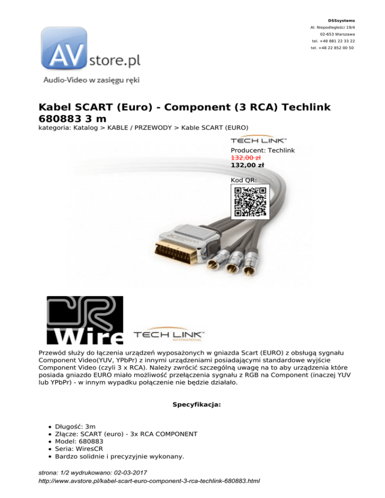 DSSsystems Al. Niepodległości 19/4 02-653 Warszawa tel. +48 881 22 33 22 tel. +48 22 852 00 50 Kabel SCART (Euro) - Component (3 RCA) Techlink 680883 3 m kategoria: Katalog > KABLE / PRZEWODY > Kable SCART (EURO) Producent: Techlink 132,00 zł 132,00 zł Kod QR: Przewód służy do łączenia urządzeń wyposażonych w gniazda Scart (EURO) z obsługą sygnału Component Video(YUV, YPbPr) z innymi urządzeniami posiadającymi standardowe wyjście Component Video (czyli 3 x RCA). Należy zwrócić szczególną uwagę na to aby urządzenia które posiada gniazdo EURO miało możliwość przełączenia sygnału z RGB na Component (inaczej YUV lub YPbPr) - w innym wypadku połączenie nie będzie działało. Specyfikacja: Długość: 3m Złącze: SCART (euro) - 3x RCA COMPONENT Model: 680883 Seria: WiresCR Bardzo solidnie i precyzyjnie wykonany. strona: 1/2 wydrukowano: 02-03-2017 http://www.avstore.pl/kabel-scart-euro-component-3-rca-techlink-680883.html Pozłacane 24 karatowym złotem końcówki Wysokiej jakości przewodnik: OFC 99.96% Przewód jest ekranowany. Jest to oryginalny przewód marki Tech+link, pochodzący bezpośrednio od polskiego dystrybutora. Przewód dostępny jest w innych długościach: 1,5m (129zł) | 3m (149zł) | Wszystkie podane ceny (zawierają podatek VAT 22%). Klientów zainteresowanych większymi zakupami lub współpracą prosimy o kontakt: (22) 852 00 50, lub [email protected] Wszystkie loga oraz znaki firmowe wykorzystane w opisach na stronie AVstore.pl . należą do ich prawnych właścicieli i mają wyłącznie charakter informacyjny strona: 2/2 wydrukowano: 02-03-2017 http://www.avstore.pl/kabel-scart-euro-component-3-rca-techlink-680883.html