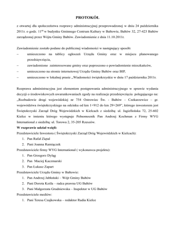 PROTOKÓŁ z otwartej dla społeczeństwa rozprawy administracyjnej przeprowadzonej w dniu 24 października 2011r. o godz. 1100 w budynku Gminnego Centrum Kultury w Bałtowie, Bałtów 32, 27-423 Bałtów zarządzonej przez Wójta Gminy Bałtów. Zawiadomienie z dnia 11.10.2011r. Zawiadomienie zostało podane do publicznej wiadomości w następujący sposób: − umieszczono na tablicy ogłoszeń Urzędu Gminy oraz w miejscu planowanego przedsięwzięcia, − zawiadomiono zainteresowane gminy oraz poproszono o powiadomienie mieszkańców, − umieszczono na stronie internetowej Urzędu Gminy Bałtów oraz BIP, − umieszczono w lokalnej prasie ,,Wiadomości świętokrzyskie w dniu 17 października 2011r. Rozprawa administracyjna jest elementem postępowania administracyjnego w sprawie wydania decyzji o środowiskowych uwarunkowaniach zgody na realizacje przedsięwzięcia polegającego na: ,,Rozbudowie drogi wojewódzkiej nr 754 Ostrowiec Św. - Bałtów – Czekarzewice – gr. województwa świętokrzyskiego na odcinku od km 1+912 do km 29+269”, którego inwestorem jest Świętokrzyski Zarząd Dróg Wojewódzkich w Kielcach z siedzibą: ul. Jagiellońska 72, 25-602 Kielce w imieniu którego występuje Pełnomocnik Pan Andrzej Kochman z Firmy WYG International z siedzibą: ul. Torowa 2, 35-205 Rzeszów. W rozprawie udział wzięli: Przedstawiciele Inwestora ( Świętokrzyski Zarząd Dróg Wojewódzkich w Kielcach): 1. Pan Rafał Ziętal 2. Pani Joanna Ramiączek Przedstawiciele firmy WYG International ( wykonawca projektu): 1. Pan Grzegorz Dyląg 2. Pan Maciej Kaczmarski 3. Pan Łukasz Zapart Przedstawiciele Urzędu Gminy w Bałtowie: 1. Pan Andrzej Jabłoński – Wójt Gminy Bałtów 2. Pani Dorota Kośla – radca prawna UG Bałtów 3. Pani Małgorzata Grudniewska – Inspektor w UG Bałtów Przedstawiciele mediów: 1. Pani Teresa Czajkowska – redaktor Radia Kielce Na wstępie rozprawy, zebranych powitał Wójt Gminy Bałtów - Pan Andrzej Jabłoński, wyjaśniając cel, rangę i potrzebę dzisiejszego spotkania. Następnie, Wójt omówił dotychczasowy przebieg i wszystkie etapy postępowania administracyjnego, zmierzającego do wydania decyzji o środowiskowych uwarunkowaniach zgody na realizacje przedsięwzięcia, przedstawił informacje zawarte w raporcie oddziaływania na środowisko oraz poinformował jaki wpływ będzie miała przebudowa drogi na uwarunkowania środowiskowe. Po zakończeniu wystąpienia udzielono głosu zebranej społeczności. Pytanie 1, Pani Regina Choinka - Okół Czy nie ma odwołania od tego projektu, ponieważ mieszkańcy Okołu nie zgadzają się na przebudowę tej drogi ze względu na hałas oraz związaną z tym przebudowę mieszkań, ogrodzeń, Czy nie można tej drogi inaczej poprowadzić? Odpowiedzi udzielił: Pan Rafał Ziętal – ŚZDW w Kielcach Realizujemy przedmiotową inwestycję po śladzie istniejącym, taki jest projekt i możliwości finansowe ŚZDW. Nasze działania mają na celu poprawę bezpieczeństwa, wzmocnienie oraz przebudowę nawierzchni, wyeliminowanie różnych kolizji, poprawę warunków korzystania z tej drogi, które są obecnie mało satysfakcjonujące. Po zakończeniu rozbudowy tej drogi niebezpieczeństwo dla mieszkańców, hałas, oddziaływanie spalin, drgań, uciążliwość zamieszkiwania w sąsiedztwie tej drogi będą na pewno mniejsze niż obecnie. My nie możemy projektować tak jak chcemy ponieważ wiąże nasz szereg przepisów, ale jesteśmy otwarci na wszelkie uwagi i wszystkie je szczegółowo analizujemy, chociaż nie wszystkie możemy uwzględnić, ponieważ wiążą nas obowiązujące ustawy. Poprzez wszelkie konsultacje z gminą i jej mieszkańcami staramy się te problemy rozwiązywać. Pytanie 2, Pan Józef Zięba - Bałtów Uczestniczyłem w wielu spotkaniach i doszedłem do wniosku, ze jestem niewłaściwie traktowany. Uważam, że ścieżka rowerowa oraz 2m chodnik w Bałtowie jest zbędny. Pisałem w tej sprawie do Urzędu Gminy , ale odpowiedź Pana wójta nie satysfakcjonuje mnie. Czy nie można zrobić ścieżki i chodnika razem 1,5m, oszczędzić jak najwięcej Bałtowa? Nie jestem wrogiem zmian ale spróbujmy w Bałtowie oszczędzić każdy cm tych działek które są, usiądźmy solidnie jak równi partnerzy i porozmawiajmy, zatrzymałem się kiedyś w Bielinach, bo była tam nie tak dawno przebudowywana droga i nigdzie nie spotkałem tam chodnika 2m. Odpowiedzi udzielił: Pan Grzegorz Dyląg – projektant, firma WYG International Chodniki w stanie istniejącym nie spełniają wymagań technicznych ani obowiązujących norm, dlatego musimy zaprojektować nowe. Wystąpiliśmy do Ministra Infrastruktury o zmianę warunków, ale ze względu na bezpieczeństwo pieszych otrzymaliśmy negatywną odpowiedź. Na zawężenie obowiązujących szerokości otrzymaliśmy zgodę tylko w okolicy cmentarza w Bałtowie. Na tym odcinku nie będzie ścieżki rowerowej. Minimalna szerokość chodnika bezpośrednio przy jezdni wynosi 2m, ścieżka rowerowa dwukierunkowa 2,5m, jednokierunkowa 1,5 +0,5m Inwestor zarządza pasem drogowym i może projektować tylko w tym pasie którym zarządza i nie może inwestycji przeprowadzić gdzie indziej. Jako biuro projektowe zrobiliśmy wszystko, żeby zająć jak najmniejszą ilość powierzchni działek prywatnych. W Okole występuje problem z zalewaniem i tam wszędzie zaprojektowaliśmy rów odwadniający i chodnik. Niestety w część działek musimy wejść, ale ten chodnik jak i ścieżka jest dla państwa, dla poprawy bezpieczeństwa miejscowych użytkowników drogi, tych którzy przy niej mieszkają. Pytanie 3, Pan Józef Zięba - Bałtów Czy w Bielinach chodnik 1,5 m jest niezgodny z przepisami? Odpowiedzi udzielił: Pan Grzegorz Dyląg – projektant, firma WYG International Bezpośrednio przy jezdni chodnik musi być 2m, poza jezdnią może być 1,5m Pan Adam Kowalczyk- Okół Geodeci, którzy robili pomiary zaznaczyli mi przy samej ścianie znak geodezyjny