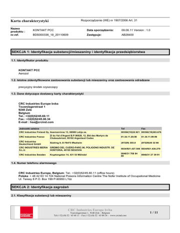 Rozporządzenie (WE) nr 1907/2006 Art. 31 Karta charakterystyki Nazwa produktu : nr.ref. KONTAKT PCC Data sporządzenia: 09.06.11 Version : 1.0 BDS000336_18_20110609 Zastępuje: AB28400 SEKCJA 1: Identyfikacja substancji/mieszaniny i identyfikacja przedsiębiorstwa 1.1. Identyfikator produktu KONTAKT PCC Aerozol 1.2. Istotne zidentyfikowane zastosowania substancji lub mieszaniny oraz zastosowania odradzane precyzyjny środek czyszczący 1.3. Dane dotyczące dostawcy karty charakterystyki CRC Industries Europe bvba Touwslagerstraat 1 9240 Zele Belgium Tel.: +32(0)52/45.60.11 Fax.: +32(0)52/45.00.34 E-mail : [email protected] Jednostki zależne Tel CRC Industries Finland Oy Asemanrinne 13, 08500 Lohja as. 00358/(19)32.921 00358/(19)383.676 Fax CRC Industries France ZI du Val d'Argent B.P.90028, 12, Bld des Martyrs de Chateaubriant, 95102 Argenteuil Cedex 01.34.11.20.00 01.34.11.09.96 CRC Industries Deutschland GmbH Südring 9, D-76473 Iffezheim (07229) 303.0 (07229)30 32 66 CRC INDUSTRIES IBERIA GREMIO DEL CUERO-PARC.96, POLIGONO INDUSTR. DE S.L.U. HONTORIA, 40195 SEGOVIA 0034/921.427.546 0034/921.436.270 CRC Industries Sweden 0046/31 706 84 80 Kryptongatan 14, 431 53 Mölndal 0046/31 27 39 91 1.4. Numer telefonu alarmowego CRC Industries Europe, Belgium: Tel.: +32(0)52/45.60.11 (office hours) Polska: + 48 42 63 14 724 National Poisons Information Centre The Nofer Institute of Occupational Medicine Ul. Teresy 8 P.O. Box 199 P-90950 L?dz SEKCJA 2: Identyfikacja zagrożeń 2.1. Klasyfikacja substancji lub mieszaniny CRC Industries Europe bvba Touwslagerstraat 1, 9240 Zele – Belgium Tel (+32) (0) 52 / 45 60 11 – Fax (+32) (0) 52 / 45 00 34 – www.crcind.com 1 / 11 Rozporządzenie (WE) nr 1907/2006 Art. 31 Karta charakterystyki Nazwa produktu : nr.ref. KONTAKT PCC Data sporządzenia: 09.06.11 Version : 1.0 BDS000336_18_20110609 Zastępuje: AB28400 Klasyfikacja zgodnie z przepisami 67/548/EWG lub 1999/45/WE: Zdrowie: Parametry fizyczne: Środowisko Naturalne : R36/38: Działa drażniąco na oczy i skórę. R67: Pary mogą wywoływać uczucie senności i zawroty głowy. SKRAJNIE ŁATWOPALNY R52/53: Działa szkodliwie na organizmy wodne; może powodować długotrwałe niekorzystne zmiany w środowisku. 2.2. Elementy oznakowania Znaki ostrzegawcze : SKRAJNIE ŁATWOPALNY Xi : DRAŻNIĄCY Zwroty wskazujące na rodzaj R36/38: Działa drażniąco na oczy i skórę. zagrożenia: R52/53: Działa szkodliwie na organizmy wodne; może powodować długotrwałe niekorzystne zmiany w środowisku. R67: Pary mogą wywoływać uczucie senności i zawroty głowy. Zwroty określające warunki S2: Chronić przed dziećmi. bezpiecznego stosowania: S16: Nie przechowywać w pobliżu źrodeł zapłonu – nie palić tytoniu. S23: Nie wdychać pary/rozpylonej cieczy. S35: Usuwać produkt i jego opakowanie w sposób bezpieczny. S51: Stosować wyłącznie w dobrze wentylowanych pomieszczeniach. Dodatkowe elementy umieszczane na etykietach Pojemnik pod ciśnieniem. Chronić przed słońcem i temperaturą powyżej 50 zgodnie z postanowieniami °C. Nie przekłuwać i nie palić – nawet po zużyciu. Nie rozpylać w kierunku Dyrektywy dotyczącej płomienia lub rozgrzanych materiałów rozpylaczy aerozolowych 75/324/WE: Przy braku właściwej wentylacji możliwe jest powstanie mieszanek wybuchowych. Preparaty, które zgodnie z kryteriami klasyfikacji zaklasyfikowano jako szkodliwe na podstawie szkodliwości wdychania nie wymagają etykietowania jako szkodliwe za pomocą R65, jeżeli są wprowadzane do obrotu w pojemnikach aerozolowych lub są wyposażone w szczelne urządzenie do wytwarzania aerozolu (dyrektywa Rady 67/548/EWG 9.4 ZAŁĄCZNIK VI) 2.3. Inne zagrożenia brak SEKCJA 3: Skład/informacja o składnikach CRC Industries Europe bvba Touwslagerstraat 1, 9240 Zele – Belgium Tel (+32) (0) 52 / 45 60 11 – Fax (+32) (0) 52 / 45 00 34 – www.crcind.com 2 / 11 Rozporządzenie (WE) nr 1907/2006 Art. 31 Karta charakterystyki Nazwa produktu : nr.ref. KONTAKT PCC Data sporządzenia: 09.06.11 Version : 1.0 BDS000336_18_20110609 Zastępuje: AB28400 3.1. Substancje Nie ma zastosowania. 3.2. Mieszaniny w/w symbol zwroty R* % Noty 200661-7 3060 F,Xi 11-36-67 B 64-17-5 200578-6 1030 F 11 B Solwent nafta (ropa naftowa), węglowodory lekkie naftenowe obrabiane wodorem; Niskowrząca frakcja naftowa obrabiana wodorem 9206215-2 295529-9 <25 F,Xn,N 11-38-51/53-6567 B,P Dimetoksymetan 109-87-5 203714-2 5-10 F 11 B 1-ethoxypropan-2-ol 1569-02- 2164 374-5 5-10 10-67 ditlenek węgla 124-38-9 204696-9 1-5 - - A,G metanol; alkohol metylowy 67-56-1 200659-6 0-1 F,T 11-23/24/2539/23/24/25 A niebezpieczny składnik CAS - nr EC-nr propan-2-ol; izopropanol; alkohol izopropylowy 67-63-0 etanol; alkohol etylowy Objaśnienie not A : substancja, której używanie jest ograniczone w ogólnym miejscu pracy B : substancja, której używanie jest ograniczone w miejscu pracy, jak ustalono w państwie G : exempted from the obligation to register in accordance with art.2(7)(a)of REACH Regulation No 1907/2006 P : nie klasyfikuje się jako rakotwórcza, mniej niż 0.1% w/w benzenu (Einecs-nr 200-753-7) CAS w/w Zwrot wskazujący rodzaj EC-nr Klasa zagrożenia i kategoria nr % zagrożenia Noty propan-2-ol; izopropanol; alkohol izopropylowy 67-63- 200- 300 661-7 60 Flam. Liq. 2,Eye Irrit. 2,STOT H225,H319,H336 SE 3 B etanol; alkohol etylowy 64-17- 200- 105 578-6 30 Flam. Liq. 2 B 1-ethoxypropan-2-ol 156902-4 2165-10 Flam. Liq. 3,STOT SE 3 374-5 H226,H336 ditlenek węgla 12438-9 2041-5 696-9 Press. Gas H280 A,G metanol; alkohol metylowy 67-56- 2000-1 1 659-6 Flam. Liq. 2,Acute Tox. 3,Acute Tox. 3,Acute Tox. 3,STOT SE 1 H225,H331,H311,H301,H370 A niebezpieczny składnik Numer rejestracyjny H225 Objaśnienie not A : substancja, której używanie jest ograniczone w ogólnym miejscu pracy B : substancja, której używanie jest ograniczone w miejscu pracy, jak ustalono w państwie G : exempted from the obligation to register in accordance with art.2(7)(a)of REA