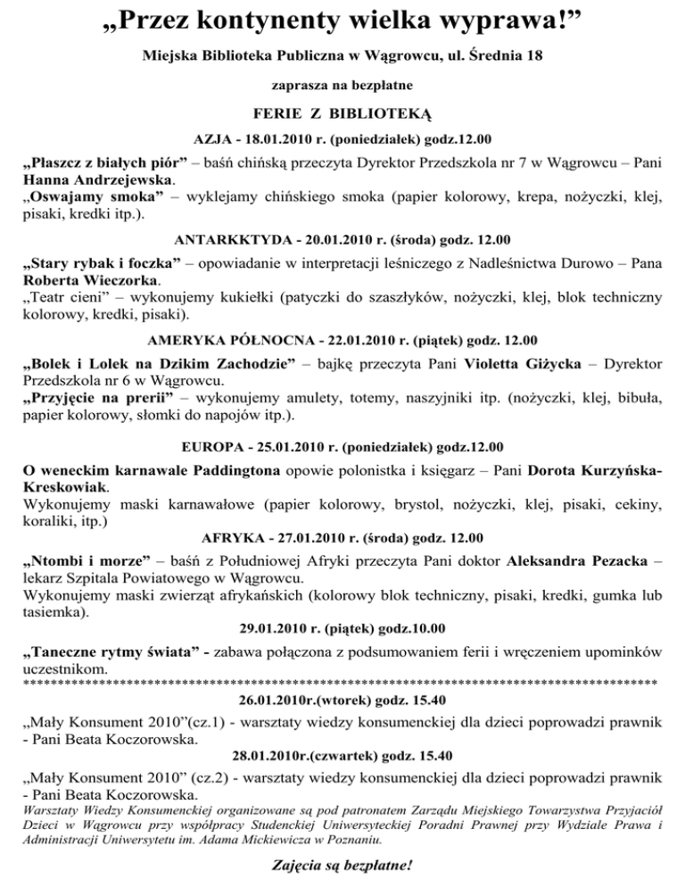 „Przez kontynenty wielka wyprawa!” Miejska Biblioteka Publiczna w Wągrowcu, ul. Średnia 18 zaprasza na bezpłatne FERIE Z BIBLIOTEKĄ AZJA - 18.01.2010 r. (poniedziałek) godz.12.00 „Płaszcz z białych piór” – baśń chińską przeczyta Dyrektor Przedszkola nr 7 w Wągrowcu – Pani Hanna Andrzejewska. „Oswajamy smoka” – wyklejamy chińskiego smoka (papier kolorowy, krepa, nożyczki, klej, pisaki, kredki itp.). ANTARKKTYDA - 20.01.2010 r. (środa) godz. 12.00 „Stary rybak i foczka” – opowiadanie w interpretacji leśniczego z Nadleśnictwa Durowo – Pana Roberta Wieczorka. „Teatr cieni” – wykonujemy kukiełki (patyczki do szaszłyków, nożyczki, klej, blok techniczny kolorowy, kredki, pisaki). AMERYKA PÓŁNOCNA - 22.01.2010 r. (piątek) godz. 12.00 „Bolek i Lolek na Dzikim Zachodzie” – bajkę przeczyta Pani Violetta Giżycka – Dyrektor Przedszkola nr 6 w Wągrowcu. „Przyjęcie na prerii” – wykonujemy amulety, totemy, naszyjniki itp. (nożyczki, klej, bibuła, papier kolorowy, słomki do napojów itp.). EUROPA - 25.01.2010 r. (poniedziałek) godz.12.00 O weneckim karnawale Paddingtona opowie polonistka i księgarz – Pani Dorota KurzyńskaKreskowiak. Wykonujemy maski karnawałowe (papier kolorowy, brystol, nożyczki, klej, pisaki, cekiny, koraliki, itp.) AFRYKA - 27.01.2010 r. (środa) godz. 12.00 „Ntombi i morze” – baśń z Południowej Afryki przeczyta Pani doktor Aleksandra Pezacka – lekarz Szpitala Powiatowego w Wągrowcu. Wykonujemy maski zwierząt afrykańskich (kolorowy blok techniczny, pisaki, kredki, gumka lub tasiemka). 29.01.2010 r. (piątek) godz.10.00 „Taneczne rytmy świata” - zabawa połączona z podsumowaniem ferii i wręczeniem upominków uczestnikom. ******************************************************************************************** 26.01.2010r.(wtorek) godz. 15.40 „Mały Konsument 2010”(cz.1) - warsztaty wiedzy konsumenckiej dla dzieci poprowadzi prawnik - Pani Beata Koczorowska. 28.01.2010r.(czwartek) godz. 15.40 „Mały Konsument 2010” (cz.2) - warsztaty wiedzy konsumenckiej dla dzieci poprowadzi prawnik - Pani Beata Koczorowska. Warsztaty Wiedzy Konsumenckiej organizowane są pod patronatem Zarządu Miejskiego Towarzystwa Przyjaciół Dzieci w Wągrowcu przy współpracy Studenckiej Uniwersyteckiej Poradni Prawnej przy Wydziale Prawa i Administracji Uniwersytetu im. Adama Mickiewicza w Poznaniu. Zajęcia są bezpłatne!