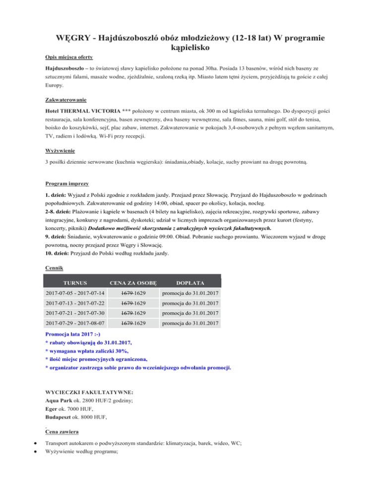 WĘGRY - Hajdúszoboszló obóz młodzieżowy (12-18 lat) W programie kąpielisko Opis miejsca oferty Hajduszoboszlo – to światowej sławy kapielisko położone na ponad 30ha. Posiada 13 basenów, wśród nich baseny ze sztucznymi falami, masaże wodne, zjeżdżalnie, szaloną rzeką itp. Miasto latem tętni życiem, przyjeżdżają tu goście z całej Europy. Zakwaterowanie Hotel THERMAL VICTORIA *** położony w centrum miasta, ok 300 m od kąpieliska termalnego. Do dyspozycji gości restauracja, sala konferencyjna, basen zewnętrzny, dwa baseny wewnętrzne, sala fitnes, sauna, mini golf, stół do tenisa, boisko do koszykówki, sejf, plac zabaw, internet. Zakwaterowanie w pokojach 3,4-osobowych z pełnym węzłem sanitarnym, TV, radiem i lodówką. Wi-Fi przy recepcji. Wyżywienie 3 posiłki dziennie serwowane (kuchnia węgierska): śniadania,obiady, kolacje, suchy prowiant na drogę powrotną. Program imprezy 1. dzień: Wyjazd z Polski zgodnie z rozkładem jazdy. Przejazd przez Słowację. Przyjazd do Hajduszoboszlo w godzinach popołudniowych. Zakwaterowanie od godziny 14:00, obiad, spacer po okolicy, kolacja, nocleg. 2-8. dzień: Plażowanie i kąpiele w basenach (4 bilety na kąpielisko), zajęcia rekreacyjne, rozgrywki sportowe, zabawy integracyjne, konkursy z nagrodami, dyskoteki; udział w licznych imprezach organizowanych przez kurort (festyny, koncerty, pikniki) Dodatkowo możliwość skorzystania z atrakcyjnych wycieczek fakultatywnych. 9. dzień: Śniadanie, wykwaterowanie o godzinie 09:00. Obiad. Pobranie suchego prowiantu. Wieczorem wyjazd w drogę powrotną, nocny przejazd przez Węgry i Słowację. 10. dzień: Przyjazd do Polski według rozkładu jazdy. Cennik TURNUS CENA ZA OSOBĘ DOPŁATA 2017-07-05 - 2017-07-14 1679 1629 promocja do 31.01.2017 2017-07-13 - 2017-07-22 1679 1629 promocja do 31.01.2017 2017-07-21 - 2017-07-30 1679 1629 promocja do 31.01.2017 2017-07-29 - 2017-08-07 1679 1629 promocja do 31.01.2017 Promocja lata 2017 :-) * rabaty obowiązują do 31.01.2017, * wymagana wpłata zaliczki 30%, * ilość miejsc promocyjnych ograniczona, * organizator zastrzega sobie prawo do wcześniejszego odwołania promocji. WYCIECZKI FAKULTATYWNE: Aqua Park ok. 2800 HUF/2 godziny; Eger ok. 7000 HUF, Budapeszt ok. 8000 HUF, Cena zawiera Transport autokarem o podwyższonym standardzie: klimatyzacja, barek, wideo, WC; Wyżywienie według programu; Zakwaterowanie: 8 noclegów w hotelu; 4 bilety na kąpielisko, Opiekę: pilota, kierownika obozu, wychowawców, miejscowego ratownika i miejscową opiekę medyczną na wezwanie, Ubezpieczenie: KL (10 000 EUR), NNW (15 000 PLN), bagaż (800 PLN) w Signal Iduna, Składkę na Turystyczny Fundusz Gwarancyjny, Podatek VAT. Cena nie zawiera * Biletów wstępów do zwiedzanych obiektów, * Świadczeń nie wymienionych w ofercie Ważne informacje Uczestnik zobowiązany jest do posiadania dowodu tożsamości (paszport, dowód osobisty) ważnego minimum pół roku od daty powrotu z imprezy, zalecana karta EKUZ, Obowiązkowa kaucja zwrotna w wysokości 25 EUR pobierana w dniu przyjazdu do hotelu na poczet ewentualnych szkód wyrządzonych przez uczestnika obozu w hotelu; kaucja zwrotna w dniu wyjazdu po sprawdzeniu pokoi. Wskazane jest zabranie kremów z filtrami UV, nakryć głowy, okularów przeciwsłonecznych, maści na oparzenia słoneczne, obuwia sportowego, Sugerowane kieszonkowe na prywatne wydatki: 10000 HUF (podczas pobytu), Na miejscu możliwość skorzystania z wycieczek fakultatywnych, płatnych dodatkowo u opiekunów (organizowane przez lokalne biuro podróży, realizowane przy odpowiedniej liczbie uczestników). Adres i numer telefonu do hotelu będą rozdawane przy autokarze w dniu wyjazdu, Godziny powrotów oraz ceny wycieczek fakultatywnych są orientacyjne i mogą ulec zmianie z przyczyn niezależnych od organizatora, Informacje o godzinie odjazdu i powrotu klient jest zobowiązany potwierdzić na 48 godzin przed wyjazdem. Rozkład jazdy GODZINA WYJAZDU 04:00 MIEJSCE DOPŁATA CZĘSTOCHOWA: Mc Donald’s trasa nr 1, od hotelu 100.00 PLN Etap GODZINA POWROTU 07:00 08:15 DĘBICA: Mc Donald’s przy trasie nr 4 03:45 05:30 KATOWICE: Parking CGF, ul. Mickiewicza 25-27 06:30 03:00 KIELCE: Dworzec PKP, ul. Żelazna 07:30 06:30 KRAKÓW: Parking przy Stadionie Wisły, ul. Reymonta 05:30 00:05 ŁÓDŹ: Dworzec PKP Łódź Kaliska, al.Włókniarzy 150.00 PLN 09:15 03:45 OPOLE: Supermarket Biedronka, ul. 1 Maja 100.00 PLN 08:00 01:15 PIOTRKÓW TRYBUNALSKI: Orlen, ul. Sikorskiego 120.00 PLN 09:15 01:30 RADOM: McDonald's stacja Lukoil trasa E7 90.00 PLN 09:00 09:00 RZESZÓW: Hala Podpromie, ul. Podpromie 10 (parking dolny) 03:00 07:45 TARNÓW : Hotel Tarnovia, ul. Kościuszki 04:15 00:05 WARSZAWA: Parking przy PKiN, Muzeum Techniki 02:30 150.00 PLN 10:30 WROCŁAW: Mc Donald's/stacja BP, ul. Karkonoska 150.00 PLN 09:30 UWAGA !!! Połączenia antenowe, pod opieką konwojenta, będą realizowane autobusem liniowym (np. Polski Bus) lub pociągiem za dopłatą przy minimum 6 uczestnikach. Pozostałe miasta na trasie głównej na zapytanie. Biuro zastrzega sobie możliwość odwołania bez żadnych konsekwencji transportu z danej miejscowości z powodu zbyt małej ilości uczestników. Więcej informacji w Biurze Podróży ADAMIS TOURS ul. Kolejowa 16 38-400 Krosno tel. 13 43 651 85
