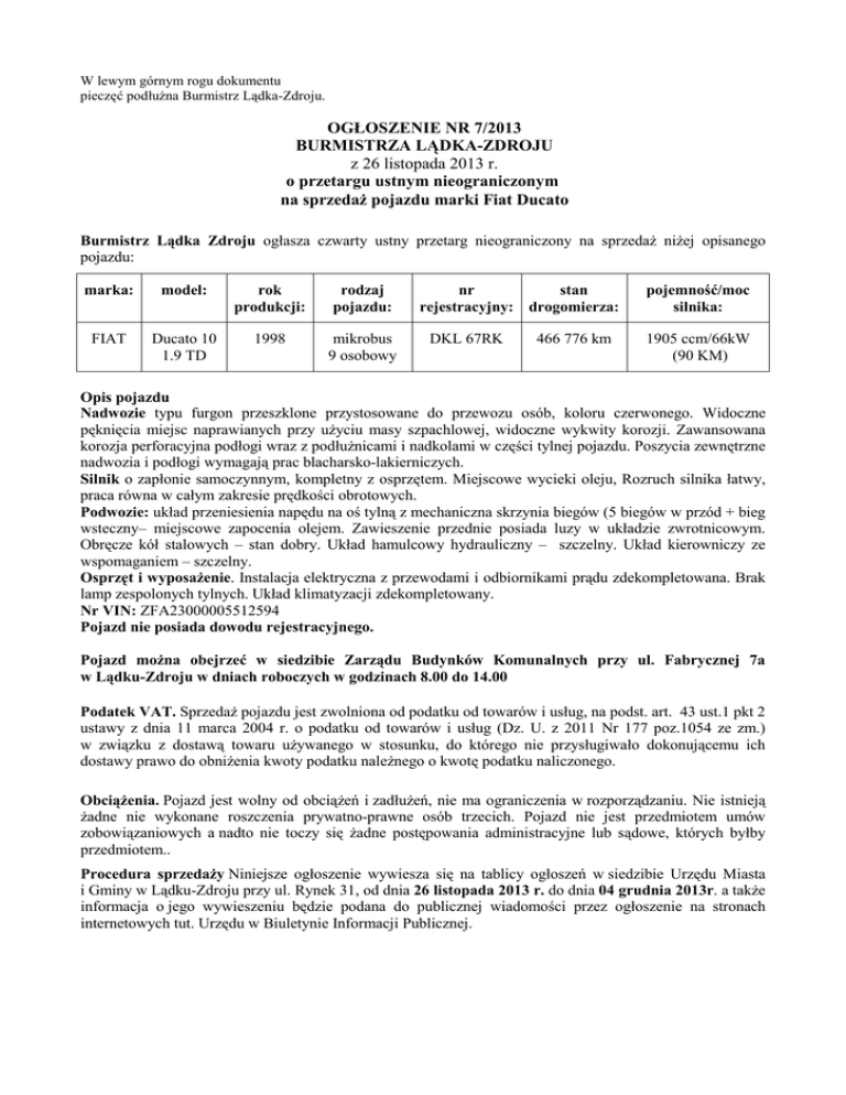W lewym górnym rogu dokumentu pieczęć podłuŜna Burmistrz Lądka-Zdroju. OGŁOSZENIE NR 7/2013 BURMISTRZA LĄDKA-ZDROJU z 26 listopada 2013 r. o przetargu ustnym nieograniczonym na sprzedaŜ pojazdu marki Fiat Ducato Burmistrz Lądka Zdroju ogłasza czwarty ustny przetarg nieograniczony na sprzedaŜ niŜej opisanego pojazdu: marka: model: rok produkcji: rodzaj pojazdu: FIAT Ducato 10 1.9 TD 1998 mikrobus 9 osobowy nr stan rejestracyjny: drogomierza: DKL 67RK 466 776 km pojemność/moc silnika: 1905 ccm/66kW (90 KM) Opis pojazdu Nadwozie typu furgon przeszklone przystosowane do przewozu osób, koloru czerwonego. Widoczne pęknięcia miejsc naprawianych przy uŜyciu masy szpachlowej, widoczne wykwity korozji. Zawansowana korozja perforacyjna podłogi wraz z podłuŜnicami i nadkolami w części tylnej pojazdu. Poszycia zewnętrzne nadwozia i podłogi wymagają prac blacharsko-lakierniczych. Silnik o zapłonie samoczynnym, kompletny z osprzętem. Miejscowe wycieki oleju, Rozruch silnika łatwy, praca równa w całym zakresie prędkości obrotowych. Podwozie: układ przeniesienia napędu na oś tylną z mechaniczna skrzynia biegów (5 biegów w przód + bieg wsteczny– miejscowe zapocenia olejem. Zawieszenie przednie posiada luzy w układzie zwrotnicowym. Obręcze kół stalowych – stan dobry. Układ hamulcowy hydrauliczny – szczelny. Układ kierowniczy ze wspomaganiem – szczelny. Osprzęt i wyposaŜenie. Instalacja elektryczna z przewodami i odbiornikami prądu zdekompletowana. Brak lamp zespolonych tylnych. Układ klimatyzacji zdekompletowany. Nr VIN: ZFA23000005512594 Pojazd nie posiada dowodu rejestracyjnego. Pojazd moŜna obejrzeć w siedzibie Zarządu Budynków Komunalnych przy ul. Fabrycznej 7a w Lądku-Zdroju w dniach roboczych w godzinach 8.00 do 14.00 Podatek VAT. SprzedaŜ pojazdu jest zwolniona od podatku od towarów i usług, na podst. art. 43 ust.1 pkt 2 ustawy z dnia 11 marca 2004 r. o podatku od towarów i usług (Dz. U. z 2011 Nr 177 poz.1054 ze zm.) w związku z dostawą towaru uŜywanego w stosunku, do którego nie przysługiwało dokonującemu ich dostawy prawo do obniŜenia kwoty podatku naleŜnego o kwotę podatku naliczonego. ObciąŜenia. Pojazd jest wolny od obciąŜeń i zadłuŜeń, nie ma ograniczenia w rozporządzaniu. Nie istnieją Ŝadne nie wykonane roszczenia prywatno-prawne osób trzecich. Pojazd nie jest przedmiotem umów zobowiązaniowych a nadto nie toczy się Ŝadne postępowania administracyjne lub sądowe, których byłby przedmiotem.. Procedura sprzedaŜy Niniejsze ogłoszenie wywiesza się na tablicy ogłoszeń w siedzibie Urzędu Miasta i Gminy w Lądku-Zdroju przy ul. Rynek 31, od dnia 26 listopada 2013 r. do dnia 04 grudnia 2013r. a takŜe informacja o jego wywieszeniu będzie podana do publicznej wiadomości przez ogłoszenie na stronach internetowych tut. Urzędu w Biuletynie Informacji Publicznej. PRZETARG ODBĘDZIE SIĘ 04 grudnia 2013 r. w Urzędzie Miasta i Gminy w Lądku-Zdroju pokój nr 26, II p, o godz. 11.00 Cena wywoławcza: 600 zł. (sześćset złotych) Wadium: 100 zł. (sto złotych) Postąpienie minimalne: o wysokości postąpienia decydują uczestnicy przetargu, z tym Ŝe postąpienie nie moŜe wynosić mniej niŜ 1% ceny wywoławczej z zaokrągleniem w górę do pełnych dziesiątek złotych, tj. 10 zł. (dziesięć złotych). 1. Warunkiem przystąpienia do przetargu jest wpłacenie określonego w ogłoszeniu wadium w pieniądzu, z takim rozliczeniem, aby naleŜna kwota znalazła się na koncie Urzędu Miasta i Gminy Lądek-Zdrój w GBS w Strzelinie Oddział w Lądku-Zdroju nr konta 39 9588 0004 3900 1111 2000 0060 w nieprzekraczalnym terminie do dnia 03 grudnia 2013 r.- włącznie. Na dowodzie wpłaty naleŜy zaznaczyć " Przetarg – Fiat Ducato”. Dowód wniesienia wadium przez uczestnika przetargu podlega przedłoŜeniu komisji przetargowej przed otwarciem przetargu. 2. Wadium uczestnika, który wygrał przetarg zostanie zaliczone na poczet ceny sprzedaŜy. Pozostałym uczestnikom wadium zostanie zwrócone niezwłocznie, jednak nie później niŜ w ciągu 3 dni od dnia odpowiednio: odwołania, zamknięcia, uniewaŜnienia przetargu lub jego zakończenia wynikiem negatywnym. Wadium przepada na rzecz Gminy Lądek-Zdrój, w razie uchylenia się uczestnika przetargu, który wygrał przetarg od zawarcia umowy sprzedaŜy w terminie podanym w zawiadomieniu. 3. W celu ustalenia listy uczestników przetargu osoby fizyczne zobowiązane są przedstawić komisji przetargowej dokument stwierdzający ich toŜsamość i obywatelstwo, osoby fizyczne prowadzące działalność gospodarczą – aktualny wydruk z centralnej ewidencji i informacji o działalności gospodarczej, umowę spółki cywilnej, podmioty, na które przepisy ustaw nakładają obowiązek uzyskania wpisu do Krajowego Rejestru Sądowego – aktualny odpis z Krajowego Rejestru Sądowego; pełnomocnicy – pełnomocnictwo oraz dokument stwierdzający ich toŜsamość (w przypadku kserokopii dokumentów wymagane będzie ich urzędowe poświadczenie). 4. Przetarg moŜe się odbyć, chociaŜby zakwalifikowano do przetargu tylko jednego oferenta spełniającego warunki określone w ogłoszeniu i jeŜeli choć jeden uczestnik zaoferuje co najmniej jedno postąpienie powyŜej ceny wywoławczej. Po ustaniu zgłaszania postąpień przewodniczący komisji przetargowej wywołuje trzykrotnie ostatnią, najwyŜszą cenę i zamyka przetarg, a następnie ogłasza imię i nazwisko albo nazwę lub firmę osoby, która przetarg wygrała. 5. Burmistrz Lądka-Zdroju zastrzega sobie moŜliwość odwołania przetargu z uzasadnionej przyczyny oraz odstąpienia od zawarcia umowy w razie stwierdzenia, Ŝe przetarg został przeprowadzony z naruszeniem prawa. 6. Cena ruchomości sprzedawanej w drodze przetargu podlega zapłacie nie później niŜ do dnia zawarcia umowy przenoszącej własność pojazdu. Dodatkowe informacje dotyczące ruchomości oraz warunków jej sprzedaŜy jak równieŜ pe