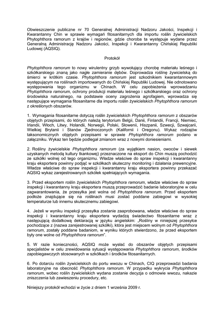 Obwieszczenie publiczne nr 70 Generalnej Administracji Nadzoru Jakości, Inspekcji i Kwarantanny Chin w sprawie wymagań fitosanitarnych dla importu roślin żywicielskich Phytophthora ramorum z krajów i regionów, gdzie choroba ta występuje wydane przez Generalną Administrację Nadzoru Jakości, Inspekcji i Kwarantanny Chińskiej Republiki Ludowej (AQSIQ). Protokół Phytophthora ramorum to nowy wirulentny grzyb wywołujący chorobę materiału leśnego i szkółkarskiego znaną jako nagłe zamieranie dębów. Doprowadza roślinę żywicielską do śmierci w krótkim czasie. Phytophthora ramorum jest szkodnikiem kwarantannowym występującym na roślinach importowanych do Chińskiej Republiki Ludowej. Nie odnotowano występowania tego organizmu w Chinach. W celu zapobieżenia wprowadzaniu Phytophthora ramorum, ochrony produkcji materiału leśnego i szkółkarskiego oraz ochrony środowiska naturalnego, na podstawie oceny zagrożenia agrofagiem, wprowadza się następujące wymagania fitosanitarne dla importu roślin żywicielskich Phytophthora ramorum z określonych obszarów. 1. Wymagania fitosanitarne dotyczą roślin żywicielskich Phytophthora ramorum z obszarów objętych przepisami, do których należą terytorium Belgii, Danii, Finlandii, Francji, Niemiec, Irlandii, Włoch, Litwy, Holandii, Norwegii, Polski, Słowenii, Hiszpanii, Szwecji, Szwajcarii, Wielkiej Brytanii i Stanów Zjednoczonych (Kalifornii i Oregonu). Wykaz rodzajów taksonomicznych objętych przepisami w sprawie Phytophthora ramorum podano w załączniku. Wykaz ten będzie podlegał zmianom wraz z nowymi doniesieniami. 2. Rośliny żywicielskie Phytophthora ramorum (za wyjątkiem nasion, owoców i siewek uzyskanych metodą kultury tkankowej) przeznaczone na eksport do Chin muszą pochodzić ze szkółki wolnej od tego organizmu. Władze właściwe do spraw inspekcji i kwarantanny kraju eksportera powinny podjąć w szkółkach skuteczny monitoring i działania prewencyjne. Władze właściwe do spraw inspekcji i kwarantanny kraju eksportera powinny przekazać AQSIQ wykaz zarejestrowanych szkółek spełniających wymagania. 3. Przed eksportem roślin żywicielskich Phytophthora ramorum, władze właściwe do spraw inspekcji i kwarantanny kraju eksportera muszą przeprowadzić badanie laboratoryjne w celu zagwarantowania, że przesyłka jest wolna od Phytophthora ramorum. Przed eksportem podłoże znajdujące się na roślinach musi zostać poddane zabiegowi w wysokiej temperaturze lub innemu skutecznemu zabiegowi. 4. Jeżeli w wyniku inspekcji przesyłka zostanie zaaprobowana, władze właściwe do spraw inspekcji i kwarantanny kraju eksportera wydadzą świadectwo fitosanitarne wraz z następującą dodatkową deklaracją w języku angielskim: „Rośliny w niniejszej przesyłce pochodzące z (nazwa zarejestrowanej szkółki), która jest miejscem wolnym od Phytophthora ramorum, zostały poddane badaniom, w wyniku których stwierdzono, że przed eksportem były one wolne od Phytophthora ramorum”. 5. W razie konieczności, AQSIQ może wysłać do obszarów objętych przepisami specjalistów w celu zrewidowania sytuacji występowania Phytophthora ramorum, środków zapobiegawczych stosowanych w szkółkach i środków fitosanitarnych. 6. Po dotarciu roślin żywicielskich do portu wwozu w Chinach, CIQ przeprowadzi badania laboratoryjne na obecność Phytophthora ramorum. W przypadku wykrycia Phytophthora ramorum, wobec roślin żywicielskich wydana zostanie decyzja o odmowie wwozu, nakazie zniszczenia lub zawieszeniu procedury, etc. Niniejszy protokół wchodzi w życie z dniem 1 września 2009 r. Załącznik Wykaz rodzajów taksonomicznych objętych przepisami w sprawie Phytophthora ramorum 1. Abies 2. Acer 3. Adiantum 40. Magnolia 41. Maianthemum 42. Manglietia 4. Aesculus 5. Arbutus 6. Arctostaphylos 43. Michelia 44. Nerium 45. Nothofagus 7. Ardisia 8. Berber is 9. Calluna 10. Calycanthus 46. Osmanthus 47. Osmorhiza 48. Parakmeria 49. Parrotia 11. Camellia 12. Castanea 50. Photinia 51. Physocarpus 13. Castanopsis 14. Cercis 15. Ceanothus 16. Cinnamomum 17. Clintonia 18. Cornus 19. Corylopsis 20. Corylus 21. Distylium 22. Drimys 23. Dryopteris 24. Eucalyptus 25. Euonymus 26. Fagus 27. Fraxinus 28. Garrya 52. Pieris 53. Pittosporum 54. Prunus 55. Pseudotsuga 56. Pyracantha 57. Quercus 58. Rhamnus 59. Rhododendron 60. Rosa 61. Rubus 62. Salix 63. Schima 64. Sequoia 65. Syringa 66. Taxus 67. Torreya 29. Gaultheria 30. Griselinia 31. Hamamelis 32. Heteromeles 33. Ilex 34. Kalmia 35. Laurus 36. Leucothoe 37. Lithocarpus 68. Toxicodendron 69. Trientalis 70. Umbellularia 71. Vaccinium 72. Vancouveria 73. Viburnum 38. Lonicera 39. Loropetalum