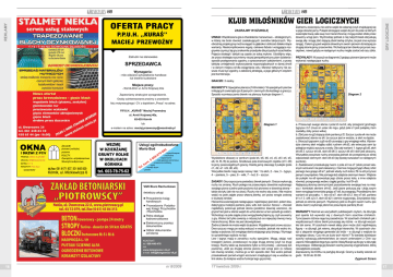 P.P.U.H. „KURAŚ” MACIEJ PRZEWOŹNY Zatrudni na stanowisko SPRZEDAWCA Wymagania: - mile widziane wykształcenie handlowe lub średnie budowlane Miejsce pracy: - Kórnik-Bnin ul. Armii Krajowej 40a Zapewniamy atrakcyjne wynagrodzenie. ZAGRAJMY W DŻUNGLĘ UWAGI: Współczesna gra o charakterze manewrowo – strategicznym, w której nie brak również zaskakujących zwrotów taktycznych. Wyobraźnią projekcyjną można sięgać tu głęboko i obliczać daleko idące warianty. Nieskomplikowane reguły, ciekawa fabuła i wciągająca rozgrywka czynią z tej gry znakomite przedpole dla przyszłych szachistów. Pojęcia strategii i taktyki są często ze sobą mylone. Uściślijmy więc, że przez strategię rozumiemy raczej perspektywiczny plan działania i sposób postępowania zgodny z opracowanymi założeniami, a przez taktykę umiejętność wykorzystania rozporządzalnych w danej chwili i w danym miejscu sił dla osiągnięcia celu. Manewr taktyczny nie zawsze musi być zgodny z założoną strategią, a jego głównym orężem jest kombinacja. Żadnemu zwierzęciu nie wolno wejść do własnej (czyli znajdującej się w jego obozie) jamy. Pułapki strzegące wejść do jam to pola na których zwierzęta tracą cała swą moc hierarchiczną i mogą zostać zbite przez dowolny wrogi pion. Wychodząc jednak z niej natychmiast odzyskują swoją siłę i mogą zbić stojącą obok bierkę (chyba, że jest ona wyższa rangą). Celem gry jest wejście dowolnym swoim pionem do leżącej po drugiej stronie jamy przeciwnika. Wchodząca tam bierka przynosi zwycięstwo, nawet gdyby w następnym ruchu mogła zostać od razu zbita. GRY LOGICZNE REKLAMY OFERTA PRACY KLUB MIŁOŚNIKÓW GIER LOGICZNYCH PRZYKŁADY: W pozycji na diagramie 2 grający pionami jasnymi może wykonać następujące ruchy: GRACZE: 2 osoby. REKWIZYTY: Specjalna plansza (7x9 kratek) i 16 specjalnych pionów imitujących zwierzęta (po 8 jasnych i ciemnych dla każdego z graczy). Sposób rozmieszczenia bierek na planszy ilustruje diagram 1. Diagram 2 Osoby zainteresowane prosimy o przesłanie listu motywacyjnego i CV z dopiskiem „Praca” na adres: P.P.U.H. „KURAŚ” Maciej Przewoźny ul. Armii Krajowej 40a, 62-035 Kórnik lub Diagram 1 e-mailem na adres: [email protected] WEZMĘ W DZIERŻAWĘ grunty rolne w okolicach Kórnika tel. 603-78-75-62 Usługi ogólnobudowlane Mario Bud 5 59- szpachlowanie 0- 7 -0 . - malowanie 08 - tapetowanie 0 6 - nida gipsowo-kartonowa m - ocieplanie poddaszy - płytki - montaż drzwi - panele l. Te ko V&K Biuro Rachunkowe świadczy usługi: ■ Prowadzenie ksiąg handlowych ■ Prowadzenie Podatkowej Księgi Przychodów i Rozchodów ■ Pełna obsługa kadrowo-płacowa ■ Elektroniczny przekaz dokumentów ■ Odbiór dokumentów od klienta KONTAKT: tel. 608-440-478 lub www.ksiegowosc-vk.pl e-mail: [email protected] 16 nr 8/2009 Wydzielone obszary w centrum (pola b4, b5, b6, c4, c5, c6 i e4, e5, e6, f4, f5, f6) to jeziora. Środkowe pola krańcowych rzędów (d1 i d9) to jamy poszczególnych graczy. Każdą jamę otaczają 3 pułapki (pola c1, d2, e1 i c9, d8, e9). Wszystkie bierki mają swoje nazwy i tak: 1 to słoń, 2 – lew, 3 – tygrys, 4 – pantera, 5 – pies, 6 – wilk, 7 – kot, 8 – szczur. ZASADY: Grę rozpoczyna posiadacz bierek jasnych. Gracze wykonują ruchy na zmianę. Ruch polega na przesunięciu dowolnie wybranego swojego piona o jedno pole poziomo lub pionowo w dowolną stronę – także do tyłu (ale nie na ukos). Ruchu nie wolno się zrzec. Nie można wejść na pole zajęte przez własną bierkę, ani przez wrogie zwierzę o wyższej randze. Hierarchia zwierząt jest następująca: najsilniejszy jest słoń, potem lew, dalej tygrys i kolejno pantera, pies, wilk, kot i szczur. Szczur – chociaż najsłabszy pokonuje jednak słonia (podobno dawniej wierzono, że gryzoń ten jest w stanie wejść do ucha słonia i w ten sposób go zabić). Wchodząc na pole zajęte przez wrogą bierkę bijemy ją, czyli usuwamy z gry. Wolno bić tylko zwierzę o niższej lub co najwyżej równej mocy hierarchicznej. Bicie nie jest obowiązkowe. Żadna z bierek nie może wejść do jeziora. Wyjątkiem jest znowu szczur. Dwa szczury mogą ze sobą walczyć w wodzie, jednak nie wolno im, będąc w jeziorze, bić wrogiego słonia stojącego przy brzegu. Wymaga to uprzedniego wyjścia na ląd. Lew i tygrys mają w zanadrzu ruchy specjalne. Mogą, stojąc nad brzegiem jeziora, przeskoczyć na jego drugą stronę (czyli na drugi brzeg). Ruchy takie są dozwolone tylko w linii prostej – pionowej lub poziomej. Jeśli po drugiej stronie jeziora stoi wrogi pion (o niższej lub równej randze), można go w ten sposób zbić. Nie wolno jednak przeskakiwać ponad wrogim szczurem znajdującym się w wodzie na linii skoku (to kolejna ważna funkcja tego gryzonia). 17 kwietnia 2009 r. a. Przesunąć swego słonia z pola b3 na b2, aby przegonić groźnego tygrysa z b1 (musi on uciec do rogu, gdyż pole c1 jest pułapką i tam zostałby zbity przez wilka). b. Zbić psa na g2 stojącą obok panterą z f2. Szczur z pola e4 nie może zaatakować słonia na d4, bo szczur jest w wodzie, a słoń na lądzie. c. Skoczyć tygrysem z g5 na d5 usuwając z gry wrogiego wilka. Wprawdzie ciemny słoń mógłby odbić ruchem d4:d5, ale wówczas sam by poległ po wyjściu szczura z wody. Oto cały wariant: 1. tygrys g5:d5, słoń d4:d5 2. szczur e4-d4, słoń d5-d6 3. szczur d4-d5 i słoń jest stracony. Wszystkie powyższe ruchy prowadzą jednak do przegranej po silnej odpowiedzi ciemnych: słoń d4-d3 (tą ripostę rozważam w następnym punkcie). d. Zaatakować przeskakując lwem z pola e3 na e7 (skok ponad własnym szczurem nie jest zakazany). Ciemne mogą przyjąć ofiarę i zbić jasnego lwa grając e8:e7, jednak wtedy ruch kota z f9 na e9 przynosi jasnym zwycięstwo. Nie pomaga też odejście ciemnym lwem. Wejście do pułapki na e9 spowoduje jego zbicie przez kota, a inne odejścia również przegrywają