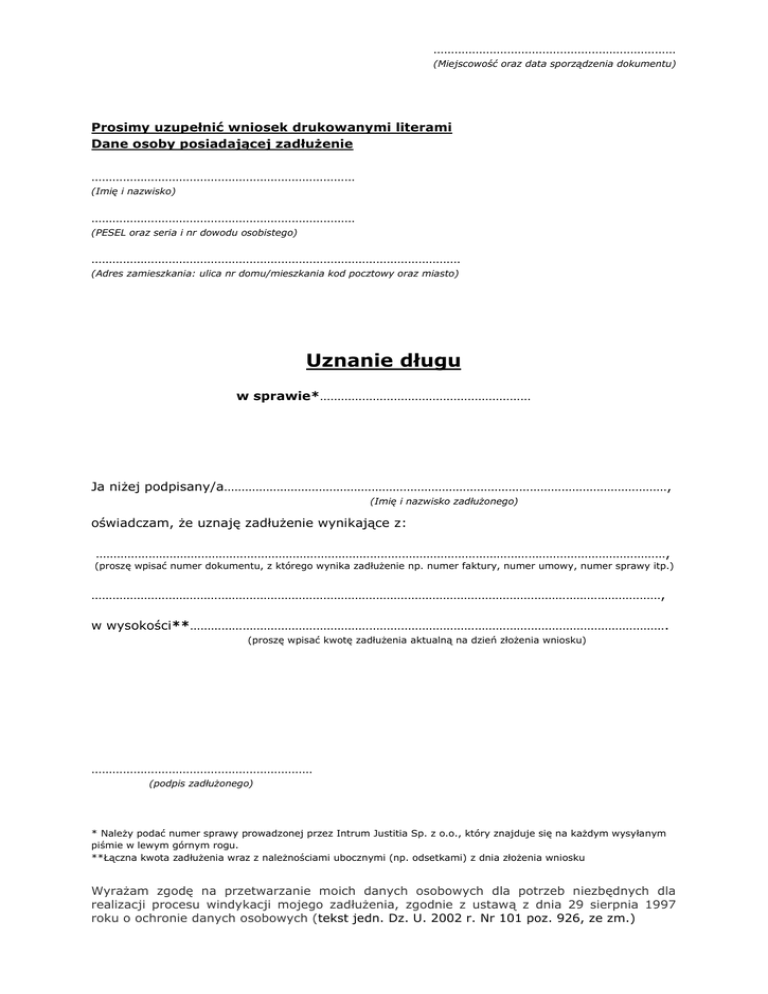 …………………………………………………………… (Miejscowość oraz data sporządzenia dokumentu) Prosimy uzupełnić wniosek drukowanymi literami Dane osoby posiadającej zadłużenie ………………………………………………………………… (Imię i nazwisko) ………………………………………………………………… (PESEL oraz seria i nr dowodu osobistego) …………………………………………………………………………………………… (Adres zamieszkania: ulica nr domu/mieszkania kod pocztowy oraz miasto) Uznanie długu w sprawie*…………………………………………………… Ja niżej podpisany/a………………………………………………………………………………………………………………, (Imię i nazwisko zadłużonego) oświadczam, że uznaję zadłużenie wynikające z: ………………………………………………………………………………………………………………………………………………, (proszę wpisać numer dokumentu, z którego wynika zadłużenie np. numer faktury, numer umowy, numer sprawy itp.) ………………………………………………………………………………………………………………………………………………, w wysokości**………………………………………………………………………………………………………………………. (proszę wpisać kwotę zadłużenia aktualną na dzień złożenia wniosku) ……………………………………………………… (podpis zadłużonego) * Należy podać numer sprawy prowadzonej przez Intrum Justitia Sp. z o.o., który znajduje się na każdym wysyłanym piśmie w lewym górnym rogu. **Łączna kwota zadłużenia wraz z należnościami ubocznymi (np. odsetkami) z dnia złożenia wniosku Wyrażam zgodę na przetwarzanie moich danych osobowych dla potrzeb niezbędnych dla realizacji procesu windykacji mojego zadłużenia, zgodnie z ustawą z dnia 29 sierpnia 1997 roku o ochronie danych osobowych (tekst jedn. Dz. U. 2002 r. Nr 101 poz. 926, ze zm.)