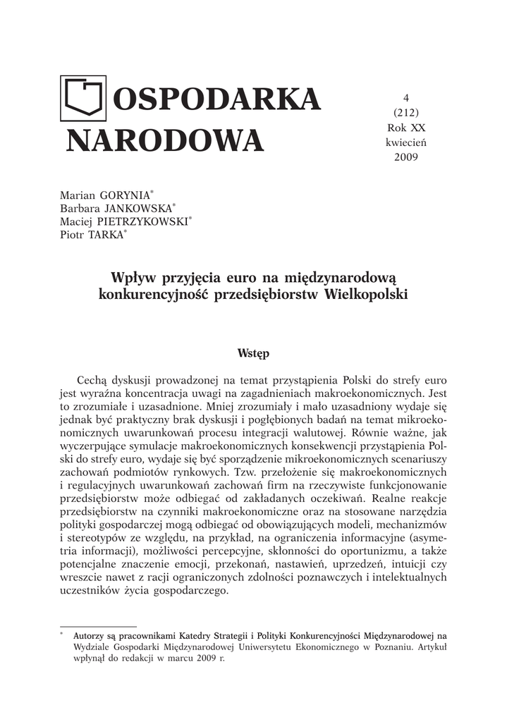 OSPODARKA NARODOWA 4 (212) Rok XX kwiecień 2009 Marian GORYNIA* Barbara JANKOWSKA* Maciej PIETRZYKOWSKI* Piotr TARKA* Wpływ przyjęcia euro na międzynarodową konkurencyjność przedsiębiorstw Wielkopolski Wstęp Cechą dyskusji prowadzonej na temat przystąpienia Polski do strefy euro jest wyraźna koncentracja uwagi na zagadnieniach makroekonomicznych. Jest to zrozumiałe i uzasadnione. Mniej zrozumiały i mało uzasadniony wydaje się jednak być praktyczny brak dyskusji i pogłębionych badań na temat mikroekonomicznych uwarunkowań procesu integracji walutowej. Równie ważne, jak wyczerpujące symulacje makroekonomicznych konsekwencji przystąpienia Polski do strefy euro, wydaje się być sporządzenie mikroekonomicznych scenariuszy zachowań podmiotów rynkowych. Tzw. przełożenie się makroekonomicznych i regulacyjnych uwarunkowań zachowań firm na rzeczywiste funkcjonowanie przedsiębiorstw może odbiegać od zakładanych oczekiwań. Realne reakcje przedsiębiorstw na czynniki makroekonomiczne oraz na stosowane narzędzia polityki gospodarczej mogą odbiegać od obowiązujących modeli, mechanizmów i stereotypów ze względu, na przykład, na ograniczenia informacyjne (asymetria informacji), możliwości percepcyjne, skłonności do oportunizmu, a także potencjalne znaczenie emocji, przekonań, nastawień, uprzedzeń, intuicji czy wreszcie nawet z racji ograniczonych zdolności poznawczych i intelektualnych uczestników życia gospodarczego. * Autorzy ������������������������ są pracownikami Katedry �������� Strategii ��������������������� i Polityki Konkurencyjności ������������������������������������ Międzynarodowej na Wydziale Gospodarki Międzynarodowej Uniwersytetu Ekonomicznego w Poznaniu. Artykuł wpłynął do redakcji w marcu 2009 r. GOSPODARKA NARODOWA Nr 4/2009 Autorzy badania zdają sobie sprawę z tego, że percepcja przyszłego świata gospodarczego przez menedżerów obciążona jest licznymi ograniczeniami i nie wnioskują o to, aby absolutyzować wyniki przeprowadzonych poszukiwań badawczych. Wydaje się jednak, że prezentowane rezultaty mogą być wartościowym uzupełnieniem prac badawczych przyjmujących całkowicie odmienną perspektywę. Jeśli niżej relacjonowane wyniki badań nie zgadzają się z obowiązującymi stereotypami, to są, co najmniej dwie możliwości wyjaśnienia tej sytuacji. Po pierwsze, być może obowiązujące modele nie są jednak adekwatne (lub nie zawsze są adekwatne) i należy rozważyć ewentualność ich całkowitej zmiany lub częściowej modyfikacji. Po drugie, możliwe jest także istnienie dysonansu między teoretycznymi modelami a deklarowanymi poglądami badanych menedżerów ze względu na ich ograniczoną wiedzę i doświadczenie. W tej drugiej sytuacji pojawi się postulat szerszego prowadzenia wśród menedżerów działalności szkoleniowej i edukacyjnej na temat potencjalnego wpływu przystąpienia do strefy euro na ich działalność. Prezentowane badanie koncentruje uwagę na wpływie przystąpienia do strefy euro na konkurencyjność przedsiębiorstw. Tak naprawdę, bowiem odpowiedź na pytanie o to, czy warto czy nie warto, czy należy czy nie należy przystępować do strefy euro sprowadza się do oszacowania wpływu przystąpienia na konkurencyjność firm. Jeśli wejście do strefy euro poprawi konkurencyjność polskich przedsiębiorstw będzie to oznaczać, że z ekonomicznego punktu widzenia „operacja euro” miała sens. Dotychczasowy stan wiedzy Problem wpływu przyjęcia przez Polskę waluty euro na konkurencyjność firm nie był jeszcze jak na razie przedmiotem szerokiej i wyczerpującej dyskusji w literaturze przedmiotu. Jak już sygnalizowano we wstępie, analizy dotyczą raczej poziomu makroekonomicznego. Belka [2007] przekonuje, że pozostanie Polski poza strefą euro jest zagrożeniem dla stabilności gospodarki. Konsekwencją takiego posunięcia byłaby utrata przewagi konkurencyjnej i konieczność ograniczania presji inflacyjnej. Lis [2008] w artykule w „Ekonomiście” sporządza bilans korzyści i strat dla polskiej gospodarki w związku z przystąpieniem do strefy euro. Niebezpieczeństwem jest możliwy w krótkim okresie wzrost cen, natomiast korzyścią dla polskich podmiotów gospodarczych będzie obniżenie stóp procentowych w związku z eliminacją ryzyka kursowego. To powinno także oddziaływać na wzrost popytu na kredyty inwestycyjne, co znów z kolei powinno się przełożyć na dynamikę inwestycji, produkcji i zatrudnienia. Próbując wyciągać wnioski na temat efektów wprowadzenia euro, warto przyjrzeć się także opiniom sformułowanym przez Dyrektoriat ds. Ekonomicznych i Finansowych Komisji Europejskiej [2008]. W raporcie, który miał ocenić rezultaty wprowadzenia euro po 10 latach funkcjonowania Unii Gospodarczej i Walutowej (UGW), stwierdza się, że trudno o jednoznaczny werdykt. Niewątpliwie stabilność makroekonomiczna krajów działających w ramach UGW jest większa, Marian Gorynia, Barbara Jankowska, Maciej Pietrzykowski, Piotr Tarka, Wpływ przyjęcia euro... jednakże szereg optymistycznych prognoz nie urzeczywistniło się. Do swego rodzaju porażek można zaliczyć niski wzrost gospodarczy, spadek wydajności produkcji, utrzymujące się różnice w wysokości kosztów pracy między krajami, co pogłębia nierównowagę zewnętrzną, małą rolę euro w globalizacji rynków międzynarodowych i ciągle zły wizerunek euro jako waluty indukującej wzrost cen. Prezentowany artykuł próbuje postawić w centrum zainteresowania mikropodmioty i to, jak przystąpienie Polski do strefy euro, może wpłynąć na konkurencyjność konkretnych przedsiębiorstw. W związku z tym, autorzy przenoszą dyskusję ze szczebla makroekonomicznego na mikroekonomiczny, mając świadom