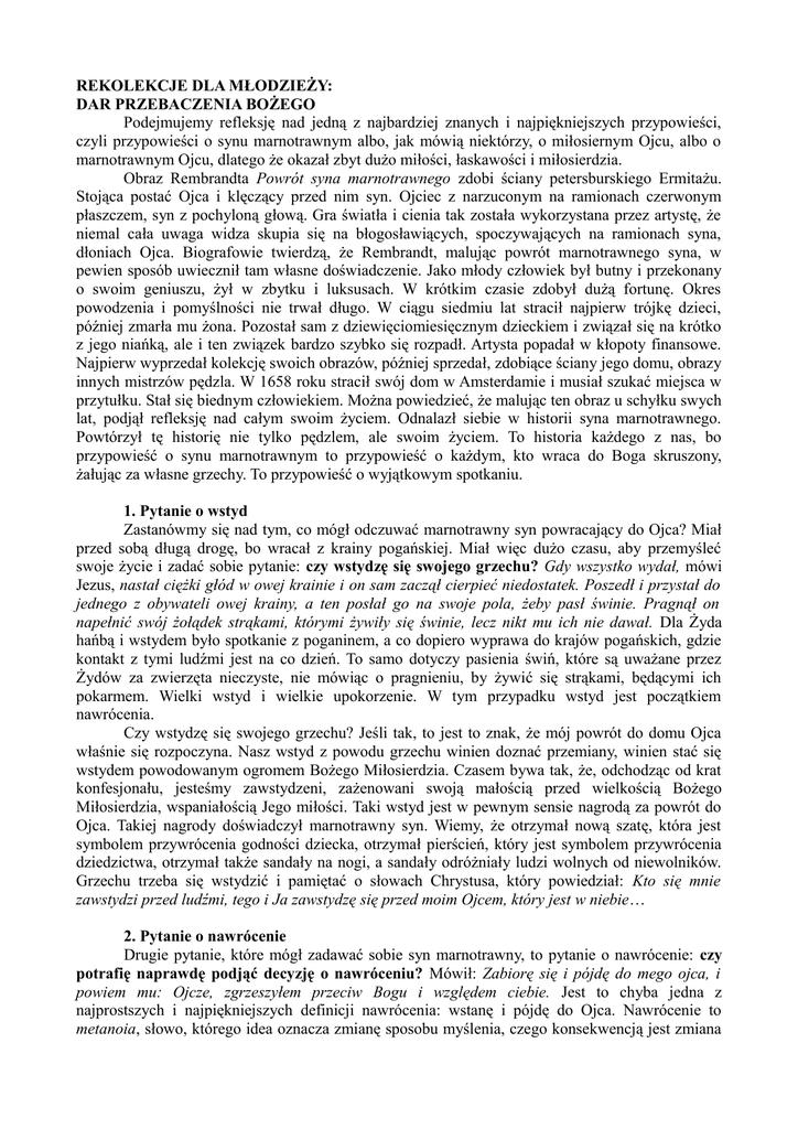 REKOLEKCJE DLA MŁODZIEŻY: DAR PRZEBACZENIA BOŻEGO Podejmujemy refleksję nad jedną z najbardziej znanych i najpiękniejszych przypowieści, czyli przypowieści o synu marnotrawnym albo, jak mówią niektórzy, o miłosiernym Ojcu, albo o marnotrawnym Ojcu, dlatego że okazał zbyt dużo miłości, łaskawości i miłosierdzia. Obraz Rembrandta Powrót syna marnotrawnego zdobi ściany petersburskiego Ermitażu. Stojąca postać Ojca i klęczący przed nim syn. Ojciec z narzuconym na ramionach czerwonym płaszczem, syn z pochyloną głową. Gra światła i cienia tak została wykorzystana przez artystę, że niemal cała uwaga widza skupia się na błogosławiących, spoczywających na ramionach syna, dłoniach Ojca. Biografowie twierdzą, że Rembrandt, malując powrót marnotrawnego syna, w pewien sposób uwiecznił tam własne doświadczenie. Jako młody człowiek był butny i przekonany o swoim geniuszu, żył w zbytku i luksusach. W krótkim czasie zdobył dużą fortunę. Okres powodzenia i pomyślności nie trwał długo. W ciągu siedmiu lat stracił najpierw trójkę dzieci, później zmarła mu żona. Pozostał sam z dziewięciomiesięcznym dzieckiem i związał się na krótko z jego niańką, ale i ten związek bardzo szybko się rozpadł. Artysta popadał w kłopoty finansowe. Najpierw wyprzedał kolekcję swoich obrazów, później sprzedał, zdobiące ściany jego domu, obrazy innych mistrzów pędzla. W 1658 roku stracił swój dom w Amsterdamie i musiał szukać miejsca w przytułku. Stał się biednym człowiekiem. Można powiedzieć, że malując ten obraz u schyłku swych lat, podjął refleksję nad całym swoim życiem. Odnalazł siebie w historii syna marnotrawnego. Powtórzył tę historię nie tylko pędzlem, ale swoim życiem. To historia każdego z nas, bo przypowieść o synu marnotrawnym to przypowieść o każdym, kto wraca do Boga skruszony, żałując za własne grzechy. To przypowieść o wyjątkowym spotkaniu. 1. Pytanie o wstyd Zastanówmy się nad tym, co mógł odczuwać marnotrawny syn powracający do Ojca? Miał przed sobą długą drogę, bo wracał z krainy pogańskiej. Miał więc dużo czasu, aby przemyśleć swoje życie i zadać sobie pytanie: czy wstydzę się swojego grzechu? Gdy wszystko wydał, mówi Jezus, nastał ciężki głód w owej krainie i on sam zaczął cierpieć niedostatek. Poszedł i przystał do jednego z obywateli owej krainy, a ten posłał go na swoje pola, żeby pasł świnie. Pragnął on napełnić swój żołądek strąkami, którymi żywiły się świnie, lecz nikt mu ich nie dawał. Dla Żyda hańbą i wstydem było spotkanie z poganinem, a co dopiero wyprawa do krajów pogańskich, gdzie kontakt z tymi ludźmi jest na co dzień. To samo dotyczy pasienia świń, które są uważane przez Żydów za zwierzęta nieczyste, nie mówiąc o pragnieniu, by żywić się strąkami, będącymi ich pokarmem. Wielki wstyd i wielkie upokorzenie. W tym przypadku wstyd jest początkiem nawrócenia. Czy wstydzę się swojego grzechu? Jeśli tak, to jest to znak, że mój powrót do domu Ojca właśnie się rozpoczyna. Nasz wstyd z powodu grzechu winien doznać przemiany, winien stać się wstydem powodowanym ogromem Bożego Miłosierdzia. Czasem bywa tak, że, odchodząc od krat konfesjonału, jesteśmy zawstydzeni, zażenowani swoją małością przed wielkością Bożego Miłosierdzia, wspaniałością Jego miłości. Taki wstyd jest w pewnym sensie nagrodą za powrót do Ojca. Takiej nagrody doświadczył marnotrawny syn. Wiemy, że otrzymał nową szatę, która jest symbolem przywrócenia godności dziecka, otrzymał pierścień, który jest symbolem przywrócenia dziedzictwa, otrzymał także sandały na nogi, a sandały odróżniały ludzi wolnych od niewolników. Grzechu trzeba się wstydzić i pamiętać o słowach Chrystusa, który powiedział: Kto się mnie zawstydzi przed ludźmi, tego i Ja zawstydzę się przed moim Ojcem, który jest w niebie… 2. Pytanie o nawrócenie Drugie pytanie, które mógł zadawać sobie syn marnotrawny, to pytanie o nawrócenie: czy potrafię naprawdę podjąć decyzję o nawróceniu? Mówił: Zabiorę się i pójdę do mego ojca, i powiem mu: Ojcze, zgrzeszyłem przeciw Bogu i względem ciebie. Jest to chyba jedna z najprostszych i najpiękniejszych definicji nawrócenia: wstanę i pójdę do Ojca. Nawrócenie to metanoia, słowo, którego idea oznacza zmianę sposobu myślenia, czego konsekwencją jest zmiana sposobu postępowania: zmieniam swoje myśli na myśli Boga. Narzekał niegdyś Bóg przez proroka Izajasza: Myśli moje nie są myślami waszymi, ani drogi moje, waszymi drogami (Iz 55,8). Karmiąc się słowem Bożym, zmieniamy nasze myśli na myśli Boga i w ten sposób nasze nawrócenie staje się możliwe. Anegdota o św. Franciszku Salezym opowiada, że, gdy zaczął on cieszyć się sławą świętości, przyszła do niego znana arystokratka po radę. Pytała o to, co ma czynić, aby naprawdę się nawrócić, by zostać świętą. Proszę ciszej zamykać drzwi odpowiedział św. Franciszek - bo świętość zaczyna się od rzeczy małych. 3. Pytanie o dar dla ojca Trzecie pytanie, jakie mógł stawiać sobie syn marnotrawny, mogło dotyczyć daru dla ojca: co przyniosę Ojcu w darze? Jest na Wschodzie zwyczaj, że jeśli wraca się po długiej nieobecności do własnego domu, a tym bardziej, jeśli odwiedzamy kogoś innego, to trzeba przynieść dar. Tymczasem syn wraca z pustymi rękoma. Jezus mówi tylko tyle, że wybrał się więc i poszedł do swojego Ojca, bez podarunku. Zauważamy tutaj pewien paradoks. Kiedy syn otrzymał połowę swojego majątku, połowę dziedzictwa, które na niego przypadało, natychmiast stał się biedny. Teraz, kiedy wraca z pustymi rękoma, jest bogaty, bo w swoim sercu niesie żal i miłość. Miłość ta spowoduje, że będzie mógł na nowo nawiązać kontakt z ojcem. Prawdą jest też to, o czym mówił kiedyś św. Ambroży. Mianowicie