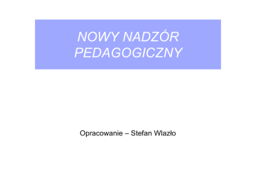 NOWY NADZÓR PEDAGOGICZNY Opracowanie – Stefan Wlazło Podstawę prawną nowego nadzoru stanowi Ustawa Nadzór pedagogiczny polega na: ART.. 33 - ocenianiu stanu i warunków działalności edukacyjnej -analizowaniu i ocenianiu efektów działalności -inspirowaniu nauczycieli do innowacji Podstawę prawną nowego nadzoru stanowi Ustawa na podstawie delegacji ustawowej – obecny nadzór pedagogiczny jest definiowany jako stosowany w trzech formach: -Ewaluacji (działań pedagogicznych szkoły) -Kontroli (działania szkoły zgodnie z prawem) -Wspomagania Podstawę prawną nowego nadzoru stanowi oczywiście Ustawa art.. 40 7. Dyrektor szkoły lub placówki przedstawia radzie pedagogicznej, nie rzadziej niż dwa razy w roku szkolnym, ogólne wnioski wynikające ze sprawowanego nadzoru pedagogicznego oraz informacje o działalności szkoły. Podstawę prawną nowego nadzoru stanowi Ustawa § 3. 1. Nadzór pedagogiczny jest realizowany przez wykonywanie zadań i czynności określonych w art. 33 ustawy, w trybie planowych lub doraźnych działań mających na celu doskonalenie systemu oświaty. ZATEM NADZÓR PEDAGOGICZNY MUSI BYĆ ZAPLANOWANY! OZNACZA TO WYMÓG TWORZENIA PLANU NADZORU PEDAGOGICZNEGO PRZEZ DYREKTORA SZKOŁY, TAKI TEŻ OBOWIĄZEK CIĄŻY NA KURATORZE Plan nadzoru pedagogicznego jest JEDYNYM dokumentem obowiązującym w nowym nadzorze pedagogicznym ZATEM NADZÓR PEDAGOGICZNY MUSI BYĆ ZAPLANOWANY! PLAN NADZORU TWORZONY PRZEZ DYREKTORA MA TRZY CZĘŚCI: -ORGANIZACJA EWALUACJI WEWNĘTRZNEJ -KONTROLOWANIE, CZY N-LE PRACUJĄ ZGODNIE Z PRAWEM -TEMATYKA SZKOLEŃ I NARAD EWALUACJA ZAWSZE JEST DZIAŁANIEM PLANOWYM I ZORGANIZOWANYM KONTROLA –NP.. DOKUMENTACJI PEDAGOGICZNEJ – USTALA SOBIE DYREKTOR W SWOIM HARMONOGRAMIE ZAJĘĆ WSPOMAGANIE – NP. PLAN WDN Plan nadzoru: Problem konstrukcyjny: Nadzór nad nauczycielami wykonującymi działania ewaluacyjne Czy Monitorowanie efektów ewaluacji? NADZÓR Zebranie informacji, czy w szkole analizuje się wyniki sprawdzianu i czy wdraża się wnioski z tych analiz. • Ustalenie: Co moglibyśmy zrobić, żeby proces analizy wyników był lepszy? MONITORING • Pozyskiwanie informacji, jak uczniowie przygotowują się do zewnętrznego sprawdzianu, egzaminu? • Jakie są ich ambicje edukacyjne? NADZÓR Jak nauczyciele stosują system oceny punktowej z zachowania? MONITORING Co sądzą uczniowie o wartościach wychowawczych respektowanych w naszej szkole? Dlaczego mają takie opinie? ZATEM NADZÓR PEDAGOGICZNY MUSI BYĆ ZAPLANOWANY! W realizacji planu nadzoru dyrektor prowadzi różnorodnego rodzaju obserwacje Najistotniejszą zmianą jest konieczność organizowania wewnętrznej ewaluacji„dyrektor przeprowadza ewaluację wewnętrzną i wykorzystuje wyniki do doskonalenia jakości pracy szkoły”par. 20.1 Organizowanie, to: - określanie celów -planowanie realizacji celów -pozyskiwanie zasobów ludzkich i rzeczowych -realizowanie planu (w ewaluacji: projektu) -ocenianie, diagnozowanie, czy cele zostały osiągnięte Organizowanie ewaluacji musi odbywać się z udziałem nauczycieli, w każdym z kroków działania zorganizowanego Najważniejszym bowiem pytaniem w nowym nadzorze jest pytanie : jak edukacyjnie rozwija się nasz uczeń Nadzór ukierunkowany na rozwój ucznia, dziecka Oczekiwania Zadowolenie DLATEGO NOWY NADZÓR JEST OKREŚLANY JAKO NADZÓR JAKOŚCIOWY „Planowe i doraźne działania prowadzone przez dyrektorów wynikają z potrzeb szkoły lub placówki” (§ 3.4.) – te potrzeby wynikają przede wszystkim z potrzeb rozwojowych uczniów, dzieci CO OZNACZA JAKOŚĆ PRACY SZKOŁY W ŚWIETLE NOWEGO ROZPORZĄDZENIA? SPEŁNIANIE PRZEZ SZKOŁĘ/PLACÓWKĘ WYMAGAŃ PAŃSTWA RODZAJE EWALUACJI •ZEWNĘTRZNA •WEWNĘTRZNA •AUTOEWALUACJA DWIE PIERWSZE DOTYCZĄ WYMAGAŃ OPISANYCH W ZAŁĄCZNIKU ZAKRESY (OBSZARY) NADZORU I. EFEKTY II. PROCESY III. ŚRODOWISKO IV. ZARZĄDZANIE KONCEPCJA NOWEGO NADZORU W KAŻDYM Z CZTERECH OBSZARÓW PRACY PLACÓWKI PODLEGAJĄCYCH NADZOROWI ZEWNĘTRZNEMU FORMULOWANE SĄ: WYMAGANIA ORAZ ICH CHARAKTERYSTYKA OPISUJĄCA JAKOŚĆ NA: POZIOMIE B I NA: POZIOMIE D Rola wizytatora ds. ewaluacji: DOKONANIE OPISU TZW. „PROFILU” PRACY PLACÓWKI OŚWIATOWEJ W OPARCIU O OGÓLNOPOLSKIE STANDARDY WYMAGAŃ, POKAZANIE METOD EWALUACYJNYCH, UZGODNIENIE Z RADĄ PEDAGOGICZNĄ WNIOSKÓW Raport wizytatora ds. ewaluacji PROCEDURY ZEWNĘTRZNEJ EWALUACJI Procedury zewnętrznej ewaluacji • • • • • • • • Wywiad z dyrektorem Ankieta do nauczycieli Focus nauczycieli Focus uczniów Wywiad z pracownikami administracyjnymi Focus rodzice Focus partnerzy w środowisku Badanie dokumentacji Tzw. „drzewko narzędzi” wymaganie wywiad focusy Ankieta, dokumentacja Profil jakości pracy szkoły, p-la Obszar Wymagania państwa Efekty ……………………………… ……………………………… ……………………………… ……………………………… Pozi om D B C E !! „NADZÓR PEDAGOGICZNY JEST SPRAWOWANY Z UWZGLĘDNIENIEM: …. POSZANOWANIA SAMODZIELNOŚCI SZKÓŁ I PLACÓWEK ORAZ NAUCZYCIELI” Na czym polega poszanowanie samodzielności? „W terminie 7 dni od dnia zakończenia ewaluacji zewnętrznej – wyniki i wnioski z ewaluacji są przedstawiane na zebraniu rady pedagogicznej” – par.9.1 Wizytator bierze pod uwagę wyniki ewaluacji wewnętrznej – par.8.3 Na czym polega poszanowanie samodzielności? • „Dyrektor może wnieść zastrzeżenia do treści raportu” (§ 9.4.) kurator może je uwzględnić lub odrzucić •„Dyrektor może odmówić podpisania protokołu kontroli działania szkoły w zakresie prawa: (§ 16.1.) a także zgłosić zastrzeżenia (§ 17.1) Raport wizytatora ds. ewaluacji nie zawiera zaleceń i poleceń, a jedynie wnioski, które placówka ma uwzględnić w swoim jakościowym rozwoju Wymagania państwa są : ZRÓŹNICOWANE DO WYMAGAŃ OGÓLNOPOLSKICH PLACÓWKA TWORZY WŁASNE WSKAŹNIKI PRZYKŁADY ewaluacji wewnętrznejobszar: efekty Wyniki egzaminów 
