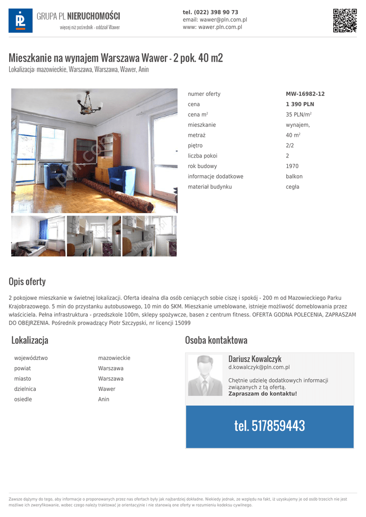 tel. (022) 398 90 73 email: [email protected] www: wawer.pln.com.pl Mieszkanie na wynajem Warszawa Wawer - 2 pok. 40 m2 Lokalizacja: mazowieckie, Warszawa, Warszawa, Wawer, Anin numer oferty MW-16982-12 cena 1 390 PLN cena m 35 PLN/m2 mieszkanie wynajem, metraż 40 m2 piętro 2/2 liczba pokoi 2 rok budowy 1970 informacje dodatkowe balkon materiał budynku cegła 2 Opis oferty 2 pokojowe mieszkanie w świetnej lokalizacji. Oferta idealna dla osób ceniących sobie ciszę i spokój - 200 m od Mazowieckiego Parku Krajobrazowego. 5 min do przystanku autobusowego, 10 min do SKM. Mieszkanie umeblowane, istnieje możliwość domeblowania przez właściciela. Pełna infrastruktura - przedszkole 100m, sklepy spożywcze, basen z centrum fitness. OFERTA GODNA POLECENIA, ZAPRASZAM DO OBEJRZENIA. Pośrednik prowadzący Piotr Szczypski, nr licencji 15099 Lokalizacja Osoba kontaktowa Dariusz Kowalczyk województwo mazowieckie powiat Warszawa [email protected] miasto Warszawa dzielnica Wawer osiedle Anin Chętnie udzielę dodatkowych informacji związanych z tą ofertą. Zapraszam do kontaktu! tel. 517859443 Zawsze dążymy do tego, aby informacje o proponowanych przez nas ofertach były jak najbardziej dokładne. Niekiedy jednak, ze względu na fakt, iż uzyskujemy je od osób trzecich nie jest możliwe ich zweryfikowanie, wobec czego należy traktować je orientacyjnie i nie stanowią one oferty w rozumieniu kodeksu cywilnego.