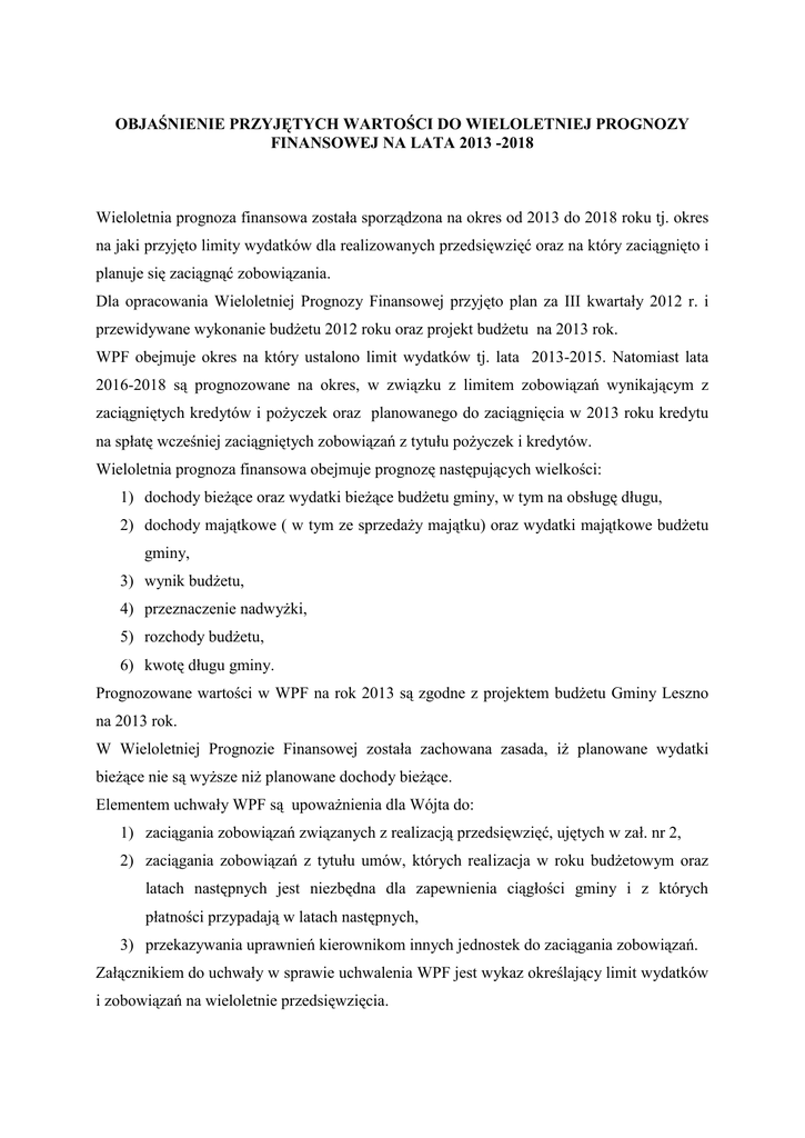 OBJAŚNIENIE PRZYJĘTYCH WARTOŚCI DO WIELOLETNIEJ PROGNOZY FINANSOWEJ NA LATA 2013 -2018 Wieloletnia prognoza finansowa została sporządzona na okres od 2013 do 2018 roku tj. okres na jaki przyjęto limity wydatków dla realizowanych przedsięwzięć oraz na który zaciągnięto i planuje się zaciągnąć zobowiązania. Dla opracowania Wieloletniej Prognozy Finansowej przyjęto plan za III kwartały 2012 r. i przewidywane wykonanie budżetu 2012 roku oraz projekt budżetu na 2013 rok. WPF obejmuje okres na który ustalono limit wydatków tj. lata 2013-2015. Natomiast lata 2016-2018 są prognozowane na okres, w związku z limitem zobowiązań wynikającym z zaciągniętych kredytów i pożyczek oraz planowanego do zaciągnięcia w 2013 roku kredytu na spłatę wcześniej zaciągniętych zobowiązań z tytułu pożyczek i kredytów. Wieloletnia prognoza finansowa obejmuje prognozę następujących wielkości: 1) dochody bieżące oraz wydatki bieżące budżetu gminy, w tym na obsługę długu, 2) dochody majątkowe ( w tym ze sprzedaży majątku) oraz wydatki majątkowe budżetu gminy, 3) wynik budżetu, 4) przeznaczenie nadwyżki, 5) rozchody budżetu, 6) kwotę długu gminy. Prognozowane wartości w WPF na rok 2013 są zgodne z projektem budżetu Gminy Leszno na 2013 rok. W Wieloletniej Prognozie Finansowej została zachowana zasada, iż planowane wydatki bieżące nie są wyższe niż planowane dochody bieżące. Elementem uchwały WPF są upoważnienia dla Wójta do: 1) zaciągania zobowiązań związanych z realizacją przedsięwzięć, ujętych w zał. nr 2, 2) zaciągania zobowiązań z tytułu umów, których realizacja w roku budżetowym oraz latach następnych jest niezbędna dla zapewnienia ciągłości gminy i z których płatności przypadają w latach następnych, 3) przekazywania uprawnień kierownikom innych jednostek do zaciągania zobowiązań. Załącznikiem do uchwały w sprawie uchwalenia WPF jest wykaz określający limit wydatków i zobowiązań na wieloletnie przedsięwzięcia. Prognoza dochodów Opracowując prognozę dochodów na kolejne lata kierowano się wykonaniem dochodów i wydatków z poprzednich lat. Analizą objęto wykonane dochody bieżące za lata 2010-2011 oraz przewidywane wykonanie dochodów bieżących w 2012 roku, planowane dochody na 2013 rok oraz wskaźniki makroekonomiczne ustalone dla budżetu państwa w latach następnych. tj. w latach 2013-2018. Prognozując dochody budżetowe przeanalizowano w pierwszej kolejności dochody bieżące pomniejszone o środki z budżetu Unii Europejskiej. Dochody pochodzące z budżetu Unii Europejskiej na 2013 rok ustalono na podstawie zawartych umów z Mazowiecką Jednostką Wdrażania Programów Unijnych. Wyszczególnienie Lp. 1. - dochody bieżące 2. Środki na programy, projekty lub zadania finansowane z udziałem środków o których mowa w art. 5 ust. 1 pkt.2 ustawy Dochody bieżące pomniejszone o środki UE (1-2) - dochody majątkowe 3. 4. 5. 6. 7. Środki na programy, projekty lub zadania finansowane z udziałem środków o których mowa w art. 5 ust. 1 pkt.2 ustawy Dochody majątkowe pomniejszone o środki UE (4-5) Dochody ogółem pomniejszone o środki UE 2012 (przewidywane wykonanie) 26 660 344,39 645 160,27 26 015 184,12 1 233 856,99 2013 % 27 949 919,26 104,84 544 993,26 27 404 926,00 105,34 354 134,00 1 123 856,00 110 000,99 26 125 185,11 354 134,00 321,94 27 759 060,00 106,26 Plan dochodów bieżących na 2013 rok w stosunku do przewidywanego wykonania roku 2012 jest wyższy niż prognozowany wskaźnik inflacji ze względu na wprowadzenie do planu dochodów z tytułu opłat za gospodarowanie odpadami komunalnymi w wysokości 633 300,00 zł. Szacuje się iż planowane dochody bieżące w 2013 roku, po pomniejszeniu o dochody z opłaty za gospodarowanie w stosunku do przewidywanego wykonania dochodów roku 2012 wzrosną ogółem o 2,5%. Dochody na lata 2014 - 2018 obliczono zgodnie z ogłoszonym przez Ministra Finansów wskaźnikiem dynamiki realnej PKB. Dochody majątkowe zaplanowane w nieruchomości latach 2013 – 2015 pochodzące ze sprzedaży gminnych, oszacowano na podstawie zrealizowanych dochodów z lat ubiegłych, pomimo, iż w roku 2012 przewiduje się zrealizowanie dochodów ze sprzedaży majątku tylko w kwocie 2 037,00 zł. Prognoza wydatków W Wieloletniej Prognozie Finansowej w 2013 roku przyjęto wydatki zgodnie z projektem uchwały budżetowej gminy na 2013 rok. W latach 2014-2018 przyjęto wzrost wydatków bieżących zgodnie z ogłoszonym przez Ministra Finansów planowanym wskaźnikiem średniorocznej dynamiki cen towarów i usług konsumpcyjnych 1. Wydatki bieżące na obsługę długu wyliczono w oparciu o zawarte umowy z tytułu zaciągniętych kredytów i pożyczek i planowany do zaciągnięcia kredyt na okres od 2013 do 2017 roku (spłata odsetek w 2013 r., raty w latach 2014-2017), 2. Wydatki bieżące objęte limitem art. 226 ust. 4 ufp na lata 2013-2015 ustalono zgodnie z przygotowanym wykazem przedsięwzięć Wieloletniej Prognozy Finansowej. 3. Wydatki na wynagrodzenia i składki od nich naliczane na lata 2014 -2018 przyjęto z uwzględnieniem wskaźnika średniorocznej dynamiki cen towarów i usług konsumpcyjnych. W wydatkach na wynagrodzenia zabezpieczono środki na świadczenia na rzecz pracowników, tj. nagród jubileuszowych i świadczeń emerytalnych jak niżej: - rok 2013 – 108 910,00 zł na nagrody jubileuszowe - rok 2014 – 157 131,00 zł na nagrody jubileuszowe - rok 2015 – 228 534,00 zł, w tym: 127 738,00 zł na nagrody jubileuszowe; 100 796,00 zł na odprawy emerytalne - rok 2016 – 177 786,00 zł, w tym: 132 102,00 zł na nagrody jubileuszowe ; 45 684,00 zł na odprawy emerytalne. 4. Wydatki związane z funkcjonowaniem organów JST na lata 2014-2018 ustalono na podstawie wskaźnika średniorocznej dynamiki cen towarów i usług konsumpcyjnych W przedstawionym dokumencie WPF prognozowany poziom wydatków od 2014 roku zapewnia środki na spł