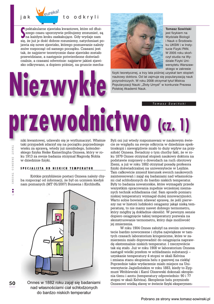 jak a! eurek to odkryli S pektakularne zjawiska kwantowe, które od dłuższego czasu uporczywie próbujemy zrozumieć, są na każdym kroku zaskakujące. Gdy wydaje nam się, że już je dość dobrze rozumiemy, natychmiast pojawia się nowe zjawisko, którego poznawanie należy znów rozpocząć od samego początku. Czasami jest tak, że najpierw teoretycznie dane zjawisko zostało przewidziane, a następnie potwierdzone doświadczalnie, a czasami odwrotnie: najpierw jakieś zjawisko odkrywano, a dopiero później, na gruncie mecha- Tomasz Sowiński jest fizykiem na Wydziale Biologii i Nauk o Środowisku UKSW i w Instytucie Fizyki PAN. W 2005 roku skończył studia na Wydziale Fizyki Uniwersytetu Warszawg w zakresie skiego fizyki teoretycznej, a trzy lata później uzyskał tam stopie stopień naukowy doktora. Od lat zajmuje się popularyzacją nauk przyrodniczych. W roku 2008 otrzymał tytuł Mistrza Popularyzacji Nauki „Złoty Umysł” w konkursie Prezesa Polskiej Akademii Nauk. Niezwykłe przewodnictwo (cz. 1) To m a s z S o w i ń s k i TEKST ŚREDNIO TRUDNY zzz 50 niki kwantowej, udawało się je wytłumaczyć. Właśnie taki przypadek zdarzył się na początku poprzedniego wieku za sprawą, wtedy już niemłodego, holenderskiego fizyka Heike Kamerlingha Onnesa, który w roku 1913 za swoje badania otrzymał Nagrodę Nobla w dziedzinie fizyki. SPECJALISTA OD NISKICH TEMPERATUR Krótkie przybliżenie postaci Onnesa należy chyba rozpocząć od informacji, że był on uczniem kiedyś nam poznanych (MT 05/2007) Bunsena i Kirchhoffa. Byli oni już wtedy rozpoznawani w naukowym świe świecie ze względu na swoje odkrycia w dziedzinie spektroskopii i niewątpliwie miało to duży wpływ na przyszłość Onnesa. Świadczy o tym choćby fakt, że w roku 1879 Onnes otrzymał stopień naukowy doktora na podstawie rozprawy o dowodach na ruch obrotowy Ziemi, a już w roku 1882 otrzymał posadę profesora fizyki doświadczalnej na uniwersytecie w Lejdzie. Tam całkowicie zmienił kierunek swoich naukowych zainteresowań i zajął się badaniami nad własnościami ciał schłodzonych do bardzo niskich temperatur. Były to badania nowatorskie, które wymagały przede wszystkim opracowania zupełnie wcześniej nieznanych technik schładzania ciał. Sam sposób pomiaru niskiej temperatury wymagał dużej innowacyjności. Warto sobie bowiem zdawać sprawę, że jeśli pierwszy raz w historii ludzkości osiągamy jakąś niską temperaturę, to nie mamy nawet dobrego termometru, który mógłby ją dokładnie określić. W pewnym sensie dopiero osiągnięcie takiej temperatury pozwala na skonstruowanie termometru, który daje możliwość jej zmierzenia. W roku 1904 Onnes założył na swoim uniwersytecie bardzo nowoczesne i chyba największe w tamtych czasach laboratorium kriogeniczne, które w zamierzeniu miało doprowadzić do osiągnięcia naprawdę ekstremalnie niskich temperatur. I rzeczywiście tak się stało. Już w roku 1908 w laboratorium Onnesa nastąpił wielki przełom w schładzaniu substancji – uzyskanie temperatury 4 stopni w skali Kelvina i zmiana stanu skupienia helu z gazowej na ciekłą! Poprzednie takie wydarzenie miało miejsce na Uniwersytecie Jagiellońskim w roku 1883, kiedy to Zygmunt Wróblewski i Karol Olszewski dokonali skroplenia tlenu i azotu (temperatury odpowiednio: 90 i 77 stopni w skali Kelvina). Skroplenie helu przyniosło Onnesowi wielką sławę w świecie fizyki eksperymen- Pobrano ze strony www.tomasz-sowinski.pl talnej i wszyscy zaczęli śledzić jego dalsze poczynania. Jednak największe odkrycie przyszło parę lat później. ZWIĄZEK TEMPERATURY Z OPOREM ELEKTRYCZNYM Znanym powszechnie już w tamtych czasach faktem była informacja, że opór elektryczny wszystkich krystalicznych przewodników rośnie wraz ze wzrostem temperatury. Najprostsze wyjaśnienie takiego zjawiska wydaje się bardzo intuicyjne i rozsądne. Oto ze wzrostem temperatury rosną termiczne drgania sieci krystalicznej przewodnika, a tym samym elektrony, które uczestniczą w przepływie prądu elektrycznego, są mocniej przez tę sieć rozpraszane. To oznacza, że znacznie trudniejsze jest utrzymanie uporządkowanego ruchu elektronów w temperaturach wyższych niż w temperaturach niższych. Uporządkowany ruch elektronów to natomiast nic innego jak właśnie przepływ prądu, którego natężenie mierzymy w amperach. Aby podtrzymać ten uporządkowany ruch elektronów, który jest nieustannie zaburzany przez drgającą chaotycznie sieć krystaliczną, musimy do końców przewodnika przyłożyć napięcie elektryczne. Napięcie to musi być tym większe, im większe natężenie prądu elektrycznego chcemy uzyskać. Wielkością, która charakteryzuje dokładnie ten związek, jest opór elektryczny – wielkość pokazująca, jak bardzo sieć krystaliczna rozprasza przemieszczające się elektrony. Im drgania sieci krystalicznej są większe, tym mniejsze jest natężenie prądu, które uzyskamy po przyłożeniu danego napięcia. Zatem tym większy jest opór elektryczny przewodnika. Skoro natomiast rozpraszające drgania są tym większe, im większa jest temperatura, to stąd naturalny wniosek, że wraz z jej wzrostem musi rosnąć i opór elektryczny. Rozumowanie przedstawione powyżej jest oczywiście przeprowadzone na podstawie obserwacji zjawisk, jakie następują w temperaturach dość bliskich temperaturze pokojowej. Nie było do końca jasne, czy prawo wzrostu oporu elektrycznego wraz z temperaturą jest również słuszne w bardzo niskich temperaturach. Były różne co do tego przekonania i różne hipotezy. Można sobie przecież dość łatwo wyobrazić, że w bardzo niskich temperaturach ujawniają się jakieś zjawiska, które powodują, że opór elektryczny zaczyna rosnąć, choć temperaturę nadal obniżamy. Jeśli zjawiska te w wyższych temperaturach są zdominowane przez rosnące drgania sieci krystalicznej, to przestają mieć znaczenie. Ale przy temperatura