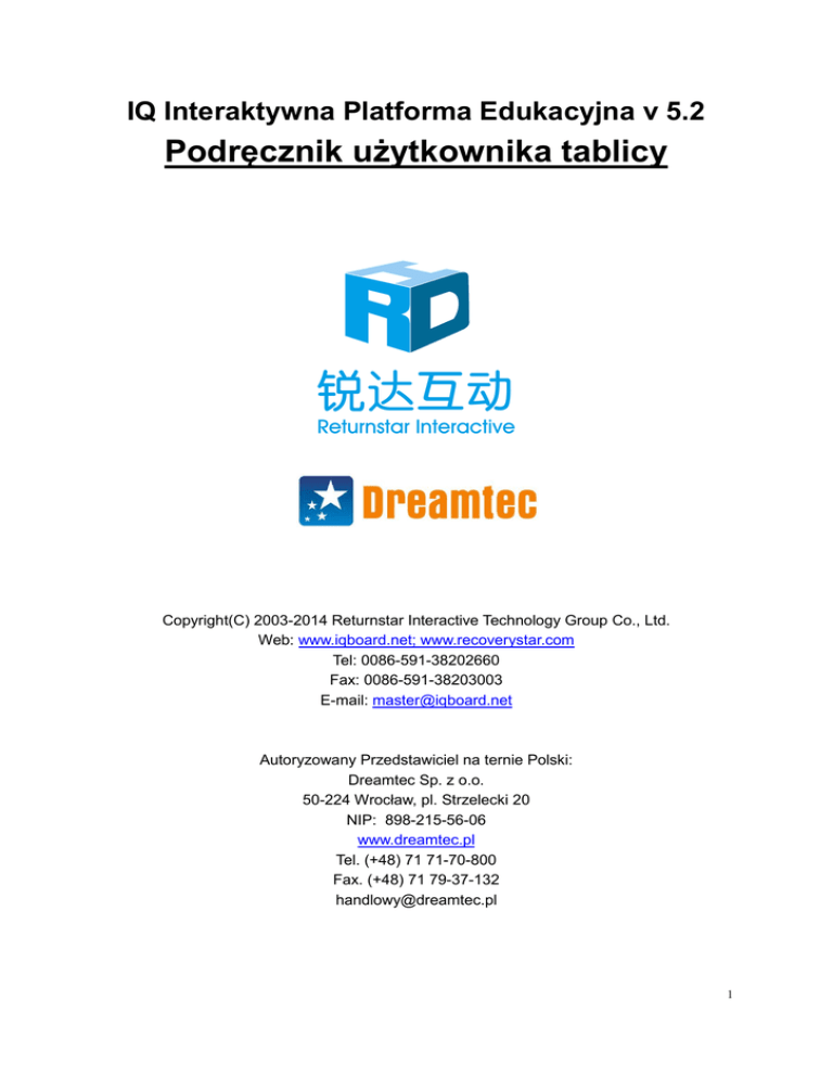 IQ Interaktywna Platforma Edukacyjna v 5.2 Podręcznik użytkownika tablicy Copyright(C) 2003-2014 Returnstar Interactive Technology Group Co., Ltd. Web: www.iqboard.net; www.recoverystar.com Tel: 0086-591-38202660 Fax: 0086-591-38203003 E-mail: [email protected] Autoryzowany Przedstawiciel na ternie Polski: Dreamtec Sp. z o.o. 50-224 Wrocław, pl. Strzelecki 20 NIP: 898-215-56-06 www.dreamtec.pl Tel. (+48) 71 71-70-800 Fax. (+48) 71 79-37-132 [email protected] 1 Oświadczenia Instrukcja obsługi którą trzymasz w ręku, dotyczy oprogramowania do wszystkich (zarówno fizycznych i wirtualnych) typów IQ Interaktywnych Platform Edukacyjnych V5.2 wyprodukowanych przez Returnstar Interactive Technology Group Co., Ltd. . Używaj danego oprogramowania tylko w ścisłej zgodności z instrukcją obsługi, dzięki temu będziesz miał pewność, że użytkujesz je prawidłowo. By przyspieszyć proces instalacji, prosimy zapoznać się z tę instrukcją jeszcze przed przystąpieniem do tego procesu. Otworzenie paczki z oprogramowaniem oznacza, że zgodziłeś się zakupić ten produkt – firma Returnstar nie będzie akceptowała zwrotów w przypadku zastania otwartego opakowania. Specyfikacja produktu może ulec zmianie, bez wcześniejszego powiadomienia. Także przykładowe obrazki w tej instrukcji obsługi mogą być inne niż faktyczny wygląd oprogramowania Returnstar zastrzega sobie prawo do pobierania opłat za wymianę, testowanie i uaktualnianie produktu. Zawartość tej instrukcji będzie regularnie poprawiane bez uprzedniego powiadomienia, a sama instrukcja będzie uaktualniania zaraz po wydaniu nowej wersji oprogramowania. Firma Returnstar nie bierze na siebie odpowiedzialności za to oprogramowanie, włączając w to oczywiste oraz niejasne sytuacje takie jak możliwość odsprzedania produktu czy zdolność produktu do przystosowania się do, innych niż zakładane, celów – firma Returnstar będzie odrzucała wszystkie tego typu reklamacje. Prawa Autorskie „Returnstar” „IQ” „IQClick” and ,,IQBoard” są zarejestrowanymi znakami handlowymi Returnstar Interactive Technology Group Co., Ltd.. „Windows” jest zarejestrowanym znakiem handlowym Microsoft Corporation. Część I, Wstęp Rozdział 1 – przedstawienie produktu Oprogramowanie do Interaktywnej Platformy Edukacyjnej to profesjonalne narzędzie do interaktywnego i multimedialnego nauczania oraz prowadzenia demonstracji; zaprojektowane specjalnie do użycia z tablicami interaktywnymi oraz wirtualnymi. Jest to także potężne narzędzie do tworzenia multimedialnego oprogramowania do kursów. Oprogramowanie Interaktywnej Platformy Edukacyjnej płynnie łączy ze sobą różnego rodzaju urządzenia na przykład wszystkie rodzaje tablic interaktywnych, urządzenia dotykowe, moduły interaktywne, projektory interaktywne, kamery dokumentacyjne, itp. Na Interaktywnej Platformie Edukacyjnej znajdziemy różne rozubudowane funkcje takie jak; odręczne pisanie, adnotacje, rozpoznawanie pisma ręcznego, wykresy, animacje, nagrywanie ekranu, odpowiedzi i egzaminy interaktywne, głosowania oraz wideokonferencje. Pozwala to w prosty sposób stworzyć piękną lekcję czy prezentację. Rozbudowane oprogramowanie: Oprócz bogatych trybów odpowiedzi i egzaminów interaktywnych Interaktywna Platforma Edukacyjna dostarcza państwu wszystkie narzędzia i biblioteki zasobów w oprogramowaniu IQBoard. Efekty: Wykorzystując IQ Interaktywną Platformę Edukacyjną uczniowie nie są tylko biernymi słuchaczami, jak podczas standardowej lekcji. Podczas lekcji interaktywnych wzrasta entuzjazm i zainteresowanie lekcją, zarówno dla nauczycieli jak i uczniów. Łatwy w użyciu: Lekcje i testy mogą być przygotowane zarówno przez Interaktywną Platformę Edukacji IQ i PowerPoint. Po lekcjach, IQ Interaktywna Platforma pomaga nauczycielom w pracy wolnej od czasochłonnych weryfikacji papierowych testów dając możliwość automatycznego sprawdzania i poprawy. Rozdział 2 – instalacja, usuwanie, rejestracja i aktualizacja Zalecane wymagania sprzętowe Windows XP/2003/Vista/7/8 Celeron 2.66 lub lepszy 256MB RAM (512MB zalecane) Microsoft DirectX8.0 lub nowszy 1G Wolnej przestrzeni na dysku (dla pełnej instalacji ) Rozdzielczość Ekranu : 1024×768 (16bit lub większa głębia kolorów) Instalacja Instalacja IQ Interaktywnej Platformy Edukacyjnej Kliknij dwukrotnie w ikonę „IQ Interactive Education Platform V5.2” na płycie instalacyjnej (lub zwróć się po najnowszą wersję oprogramowania do autoryzowanego przedstawiciela Producenta na ternie Polski, tj. do firmy Dreamtec Sp. z o.o.) i postępuj zgodnie z poleceniami wyświetlanymi na ekranie by poprawnie zainstalować oprogramowanie. Instalacja biblioteki załączników IQBoard Kliknij dwukrotnie w ikonę „IQBoard Resource Library V5.0 (Full)” na płycie instalacyjnej (lub zwróć się po najnowszą wersję oprogramowania do autoryzowanego przedstawiciela Producenta na ternie Polski, tj. do firmy Dreamtec Sp. z o.o.) i postępuj zgodnie z poleceniami wyświetlanymi na ekranie by poprawnie zainstalować bibliotekę zasobów. Usuwanie Odinstalowywanie IQ Interaktywnej Platformy Edukacyjnej By usunąć oprogramowanie IQBoard z twojego komputera, postępuj zgodnie z poniższymi krokami: 1. Wybierz jedno z poniższych działań: a) Wybierz Start > Programy > IQ Interactive Education Platform V5.2 > Odinstaluj. b) Otwórz Panel Sterowania, wybierz „Dodaj/Usuń programy”, a następnie z listy aktualnie zainstalowanych programów, wybierz „IQ Interactive Education Platform V5.2”, a następnie kliknij „Usuń” c) Ponownie kliknij w „IQ Interactive Education Platform V5.2” na płycie instalacyjnej. 2. Postępuj zgodnie z poleceniami wyświetlanymi na ekranie by poprawnie usunąć oprogramowanie. Wskazówka: możesz także wybrać opcję naprawy instalacji z okna instalatora, podczas usuwania oprogramowania. Naprawi to wszystkie błędy w większości sytuacji. Odins