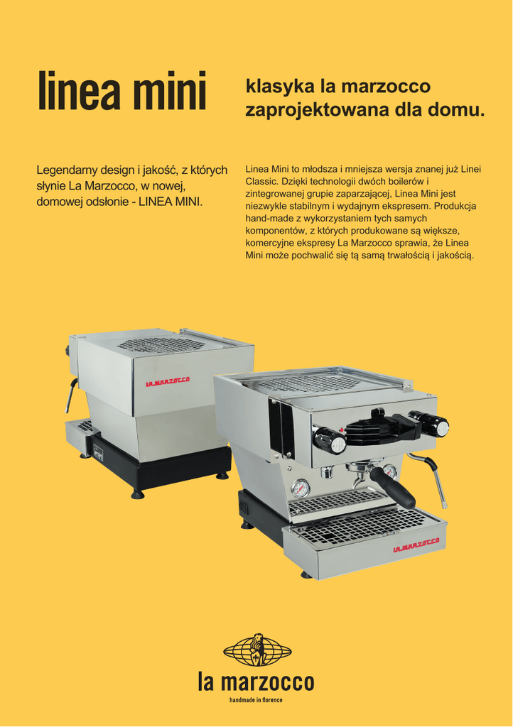 linea mini Legendarny design i jakość, z których słynie La Marzocco, w nowej, domowej odsłonie - LINEA MINI. klasyka la marzocco zaprojektowana dla domu. Linea Mini to młodsza i mniejsza wersja znanej już Linei Classic. Dzięki technologii dwóch boilerów i zintegrowanej grupie zaparzającej, Linea Mini jest niezwykle stabilnym i wydajnym ekspresem. Produkcja hand-made z wykorzystaniem tych samych komponentów, z których produkowane są większe, komercyjne ekspresy La Marzocco sprawia, że Linea Mini może pochwalić się tą samą trwałością i jakością. Kolory Linea Mini dostępna jest w kolorach: stal nierdzewna, czarny, błękitny, czerwony, biały, żółty. linea mini cechy i specyfikacja Technologia dwóch boilerów Dwa oddzielne boilery optymalizują proces parzenia espresso i spieniania mleka. Wylewka gorącej wody Wygodna wylewka gorącej wody do herbaty czy przepłukiwania portafiltrów. PID Możliwość dostosowania temperatury do indywidualnych potrzeb. Zintegrowana grupa zaparzająca Pozwala utrzymać stabilność temperatury. Stabilność termiczna Dodatkowo utrzymywana dzięki kontaktowi każdego elementu ekspresu z gorącą wodą. Kontrolki Kontrolki we frontowej części ekspresu informują o odpowiedniej temperaturze wody i jej poziomie w zbiorniku. Zbiornik na wodę 2,5 litrowy zbiornik na wodę (ekspres nie wymaga montażu do przyłączy wodno-kanalizacyjnych). Wewnętrzna pompa Niezależna pompa wbudowana w ekspres, bez negatywnego wpływu na jego wydajność. 1 Grupa Wysokość (cm) 37,7 Szerokość (cm) 35,7 Głębokość (cm) 45,3 Waga (kg) 30 Zasilanie 230V/ 1P+Z+N Moc (W) 1820 Pojemność boilera kawy (litry) 0,17 Pojemność boilera pary wodnej (litry) 3 Oświetlenie grupy Oświetlenie grupy podkreśla proces ekstrakcji espresso.