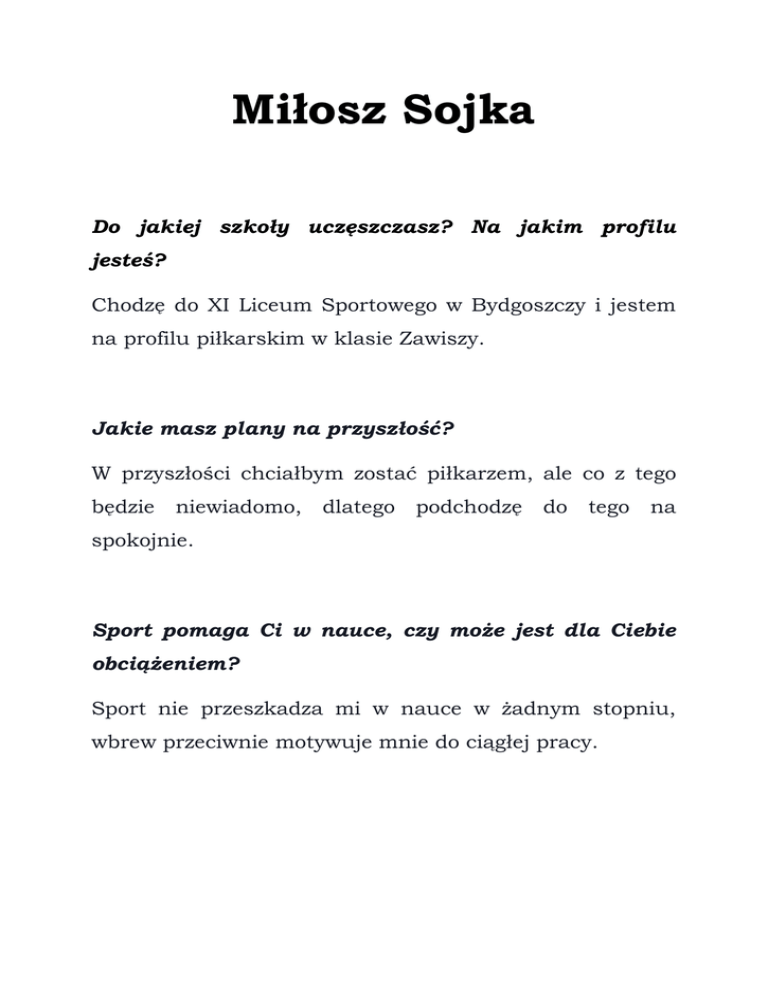 Miłosz Sojka Do jakiej szkoły uczęszczasz? Na jakim profilu jesteś? Chodzę do XI Liceum Sportowego w Bydgoszczy i jestem na profilu piłkarskim w klasie Zawiszy. Jakie masz plany na przyszłość? W przyszłości chciałbym zostać piłkarzem, ale co z tego będzie niewiadomo, dlatego podchodzę do tego na spokojnie. Sport pomaga Ci w nauce, czy może jest dla Ciebie obciążeniem? Sport nie przeszkadza mi w nauce w żadnym stopniu, wbrew przeciwnie motywuje mnie do ciągłej pracy. Jak porównujesz lata w gimnazjum i w liceum? Gimnazjum i Liceum to dwa różne światy, szczególnie dla mnie, ponieważ oprócz tego, że jest ciężej pod względem nauki to zmieniłem klub i miejsce, w którym mieszkam, chociaż dość szybko sie przyzwyczaiłem do tej zmiany. Jak wspominasz szkołę? Jak sobie w niej radziłeś? Kto Cię uczył w-f? Gimnazjum wspominam bardzo pozytywnie, byłem wiele śmiesznych momentów i nie żałuje tych trzech lat. Myślę, że radziłem sobie w niej całkiem nieźle, bo skończyłem te szkołę z dobrym świadectwem. Moim nauczycielem wf-u był Pan Piotr Sajdak, dzięki któremu myślę ze rozwinąłem sie piłkarsko a na lekcje chodziłem zawsze z radością. Od kiedy pasjonujesz się sportem? Czy był ktoś, kto Cię nim zainteresował? Sportem a w zasadzie piłką nożną interesuje sie od zawsze. W moim życiu miałem kilku idolów, ale żeby ktoś szczególnie mnie interesował to myślę, że nie. Jak się stało, że zostałeś sportowcem właśnie w tej dyscyplinie? Sportowcem jeszcze żadnym nie zostałem, ale po prostu od zawsze interesowała mnie wyłącznie piłka nożna, kiedyś zdecydowałem sie pójść na trening i jakoś do tej pory tego nie żałuje. Kto pomagał ci w chwilach zwątpienia, jeżeli takie miałeś? Może chwil zwątpienia jeszcze jak na razie nie miałem, bo jestem młody, ale w cięższych momentach pomagał mi zawsze przede wszystkim rodzina, nieraz też przyjaciele. dobrze trenować. Jak łączysz sport z życiem osobistym i nauką? Sport nie przeszkadza mi w nauce, jak na razie łącze to bardzo dobrze i cieszę sie, że mogę zarazem uczyć sie jak i dobrze trenować. Jaki sukces sportowy jest dla ciebie najważniejszy? Sukces, jaki chciałbym osiągnąć to oczywiście zostać kiedyś piłkarzem, ale jak na razie skupiam sie na mniejszych celach takich jak wystąpienie w meczu w pierwszej jedenastce czy też pomoc drużynie w wygraniu. Czy wiążesz przyszłość ze sportem? Oczywiście, jak już pisałem chciałbym kiedyś zostać piłkarzem, ale co z tego będzie to czas pokaże, na razie skupiam sie na treningach, ale też nauce, bo nie wiadomo, co mi przyszłość przyniesie. Jak uważasz czy uprawianie sportu wpływa korzystnie na zdrowie? Czy miałeś kiedyś kontuzje, przez którą nie mogłeś uprawiać sportu na dłuższy czas? Stosowałeś kiedyś jakąś dietę? Jasne, sport jest ważnym czynnikiem dla zdrowego organizmu. Nie na darmo większość ludzi biega, chociaż rekreacyjnie. Poważniejszej kontuzji nie miałem, zdarzają sie nieraz tylko małe urazy, najdłuższa moja przerwa od gry to około 1,5 miesiąca. Co do diety to nie stosuje żadnej specjalnej, po prostu staram się sie nie spożywać fast foodów jak i napojów takich, jak na przykład cola. Prosimy o powiedzenie kilku słów do uczniów naszej szkoły. No to na pewno warto uprawiać sport, bo przez to można się rozwijać fizycznie, ale tez wzmacniamy psychikę a poza tym spędzamy w dobry sposób czas. Ze sportem można wiązać swoje marzenia i a nawet, jeśli się nie spełnia to i tak sport nauczy takich rzeczy jak wytrwałość, dążenie do celu, walka czy podnoszenie się np. po porażce. Dziękujemy za rozmowę. Wywiad przeprowadzili: 1.Przemysław Trzciński 2.Karol Mieszała 3.Jakub Drzewiecki