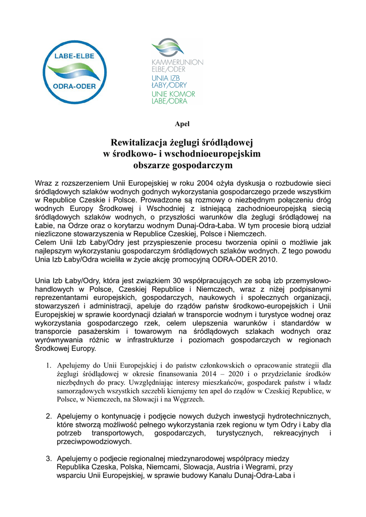 Apel Rewitalizacja żeglugi śródlądowej w środkowo- i wschodnioeuropejskim obszarze gospodarczym Wraz z rozszerzeniem Unii Europejskiej w roku 2004 ożyła dyskusja o rozbudowie sieci śródlądowych szlaków wodnych godnych wykorzystania gospodarczego przede wszystkim w Republice Czeskie i Polsce. Prowadzone są rozmowy o niezbędnym połączeniu dróg wodnych Europy Środkowej i Wschodniej z istniejącą zachodnioeuropejską siecią śródlądowych szlaków wodnych, o przyszłości warunków dla żeglugi śródlądowej na Łabie, na Odrze oraz o korytarzu wodnym Dunaj-Odra-Łaba. W tym procesie biorą udział niezliczone stowarzyszenia w Republice Czeskiej, Polsce i Niemczech. Celem Unii Izb Łaby/Odry jest przyspieszenie procesu tworzenia opinii o możliwie jak najlepszym wykorzystaniu gospodarczym śródlądowych szlaków wodnych. Z tego powodu Unia Izb Łaby/Odra wcieliła w życie akcję promocyjną ODRA-ODER 2010. Unia Izb Łaby/Odry, która jest związkiem 30 współpracujących ze sobą izb przemysłowohandlowych w Polsce, Czeskiej Republice i Niemczech, wraz z niżej podpisanymi reprezentantami europejskich, gospodarczych, naukowych i społecznych organizacji, stowarzyszeń i administracji, apeluje do rządów państw środkowo-europejskich i Unii Europejskiej w sprawie koordynacji działań w transporcie wodnym i turystyce wodnej oraz wykorzystania gospodarczego rzek, celem ulepszenia warunków i standardów w transporcie pasażerskim i towarowym na śródlądowych szlakach wodnych oraz wyrównywania różnic w infrastrukturze i poziomach gospodarczych w regionach Środkowej Europy. 1. Apelujemy do Unii Europejskiej i do państw członkowskich o opracowanie strategii dla żeglugi śródlądowej w okresie finansowania 2014 – 2020 i o przydzielanie środków niezbędnych do pracy. Uwzględniając interesy mieszkańców, gospodarek państw i władz samorządowych wszystkich szczebli kierujemy ten apel do rządów w Czeskiej Republice, w Polsce, w Niemczech, na Słowacji i na Węgrzech. 2. Apelujemy o kontynuację i podjęcie nowych dużych inwestycji hydrotechnicznych, które stworzą możliwość pełnego wykorzystania rzek regionu w tym Odry i Łaby dla potrzeb transportowych, gospodarczych, turystycznych, rekreacyjnych i przeciwpowodziowych. 3. Apelujemy o podjecie regionalnej miedzynarodowej wspólpracy miedzy Republika Czeska, Polska, Niemcami, Slowacja, Austria i Wegrami, przy wsparciu Unii Europejskiej, w sprawie budowy Kanalu Dunaj-Odra-Laba i jego przyjecie do projektów priorytetowych transeuropejskich sieci transportowych. W celu realizacji projektu apelujemy o jego finansowe wsparcie przez UE oraz srodki przeznaczone w ramach regionalnej i miedzynarodowej wspólpracy. 4. Apelujemy o intensyfikację współpracy czesko-polsko-niemieckiej w sprawie wspólnych działań przystosowania Odrzańskiej Drogi Wodnej do żeglugi międzynarodowej. 5. Apelujemy o ratyfikację przez wszystkie państwa Europy Środkowej Umowy AGN i wpisanie Odry (E-30) połączenia Odra-Wisła (E-70) oraz połączenia Wisła-Brześć (E-40) do sieci TEN-T 6. Apelujemy o stworzenie wspólnego planu rozwoju turystyki żeglarskiej na rzekach regionu Europy Środkowej w tym m.in. na Łabie, Wełtawie, Morawie, Odrze, Warcie, Wiśle a Wagu dla budowy marin i infrastruktury żeglarskiej. 7. Apelujemy o wspólne stworzenie warunków do rozwoju Makroregionu Odry i Łaby, który jest ogniwem łączącym między innymi Czechy, Niemcy i Polskę, będącym pomostem między osią rozszerzenia UE w kierunku wschodnim i południowym. Obszar ten ma szansę stać się nowym europejskim regionem gospodarczym i turystycznym, może odegrać istotną rolę w dalszym rozwoju UE pod warunkiem nowoczesnego i zintegrowanego podejścia do żeglugi śródlądowej, sportu i rekreacji na rzece i dla zrównoważonego rozwoju krajobrazu kulturowego. Usuwajmy w zjednoczonej Europie różnice w zakresie żeglugi śródlądowej !