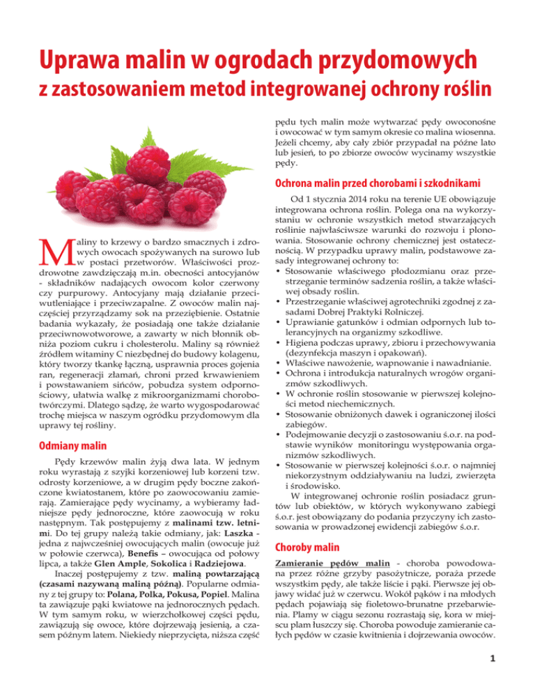 Uprawa malin w ogrodach przydomowych z zastosowaniem metod integrowanej ochrony roślin pędu tych malin może wytwarzać pędy owoconośne i owocować w tym samym okresie co malina wiosenna. Jeżeli chcemy, aby cały zbiór przypadał na późne lato lub jesień, to po zbiorze owoców wycinamy wszystkie pędy. Ochrona malin przed chorobami i szkodnikami M aliny to krzewy o bardzo smacznych i zdrowych owocach spożywanych na surowo lub w postaci przetworów. Właściwości prozdrowotne zawdzięczają m.in. obecności antocyjanów - składników nadających owocom kolor czerwony czy purpurowy. Antocyjany mają działanie przeciwutleniające i przeciwzapalne. Z owoców malin najczęściej przyrządzamy sok na przeziębienie. Ostatnie badania wykazały, że posiadają one także działanie przeciwnowotworowe, a zawarty w nich błonnik obniża poziom cukru i cholesterolu. Maliny są również źródłem witaminy C niezbędnej do budowy kolagenu, który tworzy tkankę łączną, usprawnia proces gojenia ran, regeneracji złamań, chroni przed krwawieniem i powstawaniem sińców, pobudza system odpornościowy, ułatwia walkę z mikroorganizmami chorobotwórczymi. Dlatego sądzę, że warto wygospodarować trochę miejsca w naszym ogródku przydomowym dla uprawy tej rośliny. Odmiany malin Pędy krzewów malin żyją dwa lata. W jednym roku wyrastają z szyjki korzeniowej lub korzeni tzw. odrosty korzeniowe, a w drugim pędy boczne zakończone kwiatostanem, które po zaowocowaniu zamierają. Zamierające pędy wycinamy, a wybieramy ładniejsze pędy jednoroczne, które zaowocują w roku następnym. Tak postępujemy z malinami tzw. letnimi. Do tej grupy należą takie odmiany, jak: Laszka jedna z najwcześniej owocujących malin (owocuje już w połowie czerwca), Benefis – owocująca od połowy lipca, a także Glen Ample, Sokolica i Radziejowa. Inaczej postępujemy z tzw. maliną powtarzającą (czasami nazywaną maliną późną). Popularne odmiany z tej grupy to: Polana, Polka, Pokusa, Popiel. Malina ta zawiązuje pąki kwiatowe na jednorocznych pędach. W tym samym roku, w wierzchołkowej części pędu, zawiązują się owoce, które dojrzewają jesienią, a czasem późnym latem. Niekiedy nieprzycięta, niższa część Od 1 stycznia 2014 roku na terenie UE obowiązuje integrowana ochrona roślin. Polega ona na wykorzystaniu w ochronie wszystkich metod stwarzających roślinie najwłaściwsze warunki do rozwoju i plonowania. Stosowanie ochrony chemicznej jest ostatecznością. W przypadku uprawy malin, podstawowe zasady integrowanej ochrony to: • Stosowanie właściwego płodozmianu oraz przestrzeganie terminów sadzenia roślin, a także właściwej obsady roślin. • Przestrzeganie właściwej agrotechniki zgodnej z zasadami Dobrej Praktyki Rolniczej. • Uprawianie gatunków i odmian odpornych lub tolerancyjnych na organizmy szkodliwe. • Higiena podczas uprawy, zbioru i przechowywania (dezynfekcja maszyn i opakowań). • Właściwe nawożenie, wapnowanie i nawadnianie. • Ochrona i introdukcja naturalnych wrogów organizmów szkodliwych. • W ochronie roślin stosowanie w pierwszej kolejności metod niechemicznych. • Stosowanie obniżonych dawek i ograniczonej ilości zabiegów. • Podejmowanie decyzji o zastosowaniu ś.o.r. na podstawie wyników monitoringu występowania organizmów szkodliwych. • Stosowanie w pierwszej kolejności ś.o.r. o najmniej niekorzystnym oddziaływaniu na ludzi, zwierzęta i środowisko. W integrowanej ochronie roślin posiadacz gruntów lub obiektów, w których wykonywano zabiegi ś.o.r. jest obowiązany do podania przyczyny ich zastosowania w prowadzonej ewidencji zabiegów ś.o.r. Choroby malin Zamieranie pędów malin - choroba powodowana przez różne grzyby pasożytnicze, poraża przede wszystkim pędy, ale także liście i pąki. Pierwsze jej objawy widać już w czerwcu. Wokół pąków i na młodych pędach pojawiają się fioletowo-brunatne przebarwienia. Plamy w ciągu sezonu rozrastają się, kora w miejscu plam łuszczy się. Choroba powoduje zamieranie całych pędów w czasie kwitnienia i dojrzewania owoców. 1 W integrowanej ochronie do zwalczania wymienionych szkodników dopuszczone są: Calipso 480 SC w dawce 0,2 l/ha, Ortus 0,5 SC w dawce 1,5/ha oraz Mospilan 20 SP w dawce 0,2 kg/ha. Należy pamiętać, aby chemicznych środków ochrony nie stosować w czasie oblotu pszczół, a przed zastosowaniem chemicznego środka ochrony roślin należy obowiązkowo zapoznać się z etykietą-instrukcją stosowania preparatu. Wymagania uprawowe malin Przypąkowe zamieranie pędów malin Szara pleśń - sprawcą tej choroby jest grzyb Botrytis cinerea, który w sprzyjających warunkach, takich jak podwyższona wilgotność i temperatura atakuje młode pędy, doprowadzając do ich zasychania i zamierania. Porażone grzybem pąki kwiatowe również zasychają i opadają, a owoce zaczynają gnić i pokrywają się charakterystycznym nalotem i pleśnią. Kiedy spełnimy wymagania integrowanej ochrony, a przekroczone zostaną progi ekonomicznej szkodliwości, możemy zastosować ochronę chemiczną. W integrowanej ochronie dopuszczone są następujące środki chemiczne: Mythos 300 SC w dawce 2,5 l/ha, oczywiście w przeliczeniu na nasz areał, Rovral Aquaflo 500 SC w dawce 1,5 - 2,0 l/ha, Sadoplon 75 WP w dawce 3 kg/ha, Signum 33 WG w dawce 1,8/ha, Switch 62,5 WG w dawce 0,8 – 1,0 kg/ha oraz Polyversum WP w dawce 0,2 kg/ha. Szkodniki malin W okresie bezlistnym mogą wystąpić: pryszczarek malinowiec, galasówka maliniak i przeziernik malinowiec. Po zaobserwowaniu szkodników na roślinie, usuwamy zasiedlone przez nie pędy. Przed kwitnieniem oraz w czasie kwitnienia mogą wystąpić: mszyce, przędziorki, kwieciak malinowiec, pryszczarek i namaliniak łodygowy. Kwieciak malinowiec 2 Dobrymi przedplonami dla malin są rośliny z rodziny motylkowatych (peluszka, seradela, wyka), z rodziny krzyżowych (gorczyca biała rzodkiew, rzepak), z rod