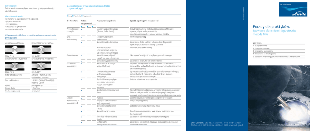5. Zapobieganie występowaniu niezgodności spawalniczych Ukształtowanie spoiny Hel zawarty w gazie osłonowym zapewnia: • głębsze wtopienie, • szerszą spoinę, • zapobiega przyklejeniom • występowaniu porów. 1 Wpływ zawartości helu na geometrię spoiny oraz zapobieganie przyklejeniom a) 100 % argon 20 l/min 280 A/25 V c) VARIGON® He 50 28 l/min Pory, 2 Pęknięcia, Źródło usterki Sposób zapobiegania niezgodności Przygotowanie krawędzi 285 A/34 V Materiał podstawowy AIMg3: s = 10 mm; spoina czołowa bez szczeliny S Al 5183 (AlMg4,5Mn0,7(A)); średnica 1,6 mm pod kątem 15° 9,7 m/min 62 cm/min Drut elektrodowy Palnik Posuw drutu Prędkość spawania Rodzaj niezgodności Zanieczyszczone krawędzie (tłuszcz, farba, tlenki) Drut elektrodowy Zanieczyszczony drut elektrodowy Niewłaściwa średnica drutu Oczyścić przy użyciu środków rozpuszczających tłuszcze; spawać jedynie suche przedmioty; przed spawaniem należy usunąć warstwę tlenków Wymienić elektrodę 1 Gaz osłonowy Urządzenie spawalnicze 285 A/30 V Przyklejenia Przyczyna niezgodności b) VARIGON® He 30 20 l/min 282 A/27 V d) VARIGON® He 70 38 l/min 3 2 Porady dla praktyków. 3 Drut elektrodowy o niewłaściwym wygięciu lub o niewłaściwym skręcie Niewłaściwa wydajność przepływu gazu osłonowego Niewłaściwy gaz osłonowy Nieszczelność w obiegu wody chłodzącej Zawirowanie powietrza w strumieniu gazu obojętnego zbyt krótki czas przepływu gazu przed spawaniem oraz po zakończeniu spawania Nierównomierne podawanie drutu Sposób wykonania prac spawalniczych 0075 0610 – 1.0 mmds Ochrona grani Zastosowanie argonu wpływa na ochronę grani poprawiając jej ukształtowanie. Przeciąg Rozpryski lub turbulencje w dyszy gazowej Niewłaściwe połączenie z masą Niewłaściwe sczepianie Zbyt duże odprowadzenie ciepła Zastosowanie nieodpowiednich ściernic Spawanie aluminium i jego stopów metodą MIG Zastosować drut o średnicy odpowiedniej do grubości spawanego przedmiotu i pozycji spawania Wymienić drut elektrodowy Spis treści: 1. Gazy osłonowe 2. Druty elektrodowe 3. Urządzenia spawalnicze 4. Wskazówki technologiczne 5. Zapobieganie występowaniu niezgodności spawalniczych Skorygować wydajność przepływu gazu osłonowego Zastosować argon, hel lub ich mieszaninę Naprawić lub wymienić uchwyt spawalniczy, zestaw węży i przewodów wody chłodzącej; zastosować uchwyt z zamkniętym układem chłodzenia Sprawdzić szczelność przewodów gazu osłonowego i uchwyty, oczyścić uchwyt, zmniejszyć odległość dyszy gazowej, skorygować pochylenie uchwytu Zmienić ustawienie na urządzeniu Sprawdzić docisk rolek posuwu, wymienić rolki posuwu, sprawdzić bicie osi rolek; sprawdzić ustawienie dyszy wejściowej drutu; wymienić rdzeń prowadnicy drutu, zastosować krótszy zestaw węży Zabezpieczyć stanowisko spawania przed przeciągiem Oczyścić dyszę gazową Zadbać o właściwe połączenie z masą Przed zaspawaniem należy wyszlifować spoinę sczepną lub zukosować Zastosować odpowiednie podgrzewanie wstępne Zastosować ściernice lub narzędzia skrawające, odpowiednie do obróbki aluminium Linde Gaz Polska Sp. z o.o., al. Jana Pawła II 41a, 31-864 Kraków Telefon: +48 12 643 92 00, Fax: +48 12 643 93 00; www.linde-gaz.pl Wzrost zawartości helu w argonie powoduje zmniejszenie liczby porów Argon (I1 według PN-EN ISO 14175) jest uniwersalnym gazem osłonowym stosowanym do spawania aluminium i jego stopów metodą MIG. Efekty spawania można poprawić stosując mieszaninę argonu z helem lub z dodatkiem niewielkiej ilości składników aktywnych. Gaz osłonowy Argon MISON® VARIGON® He 30 VARIGON® He 50 VARIGON® He 70 Uwagi może być stosowany przy wszystkich rodzajach łuków spawalniczych oraz we wszystkich pozycjach spawania • dodatek NO zwiększa stabilność łuku spawalniczego dodatek helu ma korzystny wpływ na: • zapobieganie przyklejeniom • lepsze wtopienie • wyeliminowanie konieczności podgrzewania wstępnego elementów o grubszych ściankach • mniejszą częstotliwość występowania porów • uzyskiwanie szerszych i płaskich spoin W przypadku wysokich wymagań odnośnie eliminacji porów, przede wszystkim przy elementach o większej grubości ścianek oraz przy spawaniu czystego aluminium, rezultat spawania poprawia się wraz ze wzrostem zawartości helu. a) 100% argon 20 l/min b) VARIGON® He 30 20 l/min Zużycie gazu osłonowego (w odniesieniu do argonu): • łuk krótki – 12-15 l/min • łuk z natryskowym przenoszeniem materiału i łuk impulsowy – 15-20 l/min Przy zastosowaniu gazów osłonowych VARIGON obowiązują poniższe parametry ® 350 A/28 V c) VARIGON® He 50 28 l/min 345 A/29 V d) VARIGON® He 70 38 l/min 340 A/31 V 335 A/34 V Materiał podstawowy Al 99,5: s = 10 mm; spoina czołowa bez szczeliny S Al 1450 (Al 99,5Ti); średnica 1,6 mm pod kątem 15° 8,4 m/min 62 cm/min Drut elektrodowy Uchwyt Posuw drutu Prędkość spawania Wzrost zawartości helu powoduje zmniejszenie stabilności łuku spawalniczego. Dodatek składników aktywnych stabilizuje łuk spawalniczy, poprawia wygląd spoiny i zmniejsza ilość odprysków. Gaz osłonowy (a) Argon (b) VARIGON® He30 (c) VARIGON® He 50 (d) VARIGON® He 70 Średnica odprysku 0,5 … 4 mm 0,5 … 1,5 mm 0,5 … 1 mm 0,5 … 1 mm Całkowita powierzchnia odprysków Długość spoiny 370 mm 152 mm2 28 mm2 18 mm2 6 mm2 Stopnie czystości gazów oraz dokładności składu mieszanin odpowiadają wymaganiom PN-EN ISO 14175. Gazy mogą być stosowane przy wszystkich rodzajach łuków spawalniczych, a także we wszystkich zakresach grubości łączonych elementów. Gaz osłonowy Współczynnik korekcyjny* VARIGON® He 30 VARIGON® He 50 VARIGON® He 70 1,17 1,35 1,70 Minimalna wydajność przepływu gazu osłonowego 20 l/min 28 l/min 35 l/min * Przy stosowaniu mieszaniny argonowo-helowej jako osłony gazowej należy uwzględnić korektę wielkości wydatku gazu. Dla zapewnien