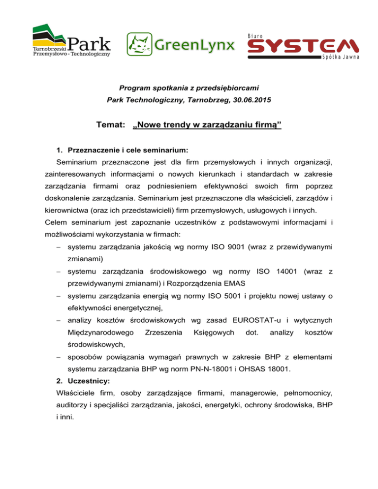 Program spotkania z przedsiębiorcami Park Technologiczny, Tarnobrzeg, 30.06.2015 Temat: „Nowe trendy w zarządzaniu firmą” 1. Przeznaczenie i cele seminarium: Seminarium przeznaczone jest dla firm przemysłowych i innych organizacji, zainteresowanych informacjami o nowych kierunkach i standardach w zakresie zarządzania firmami oraz podniesieniem efektywności swoich firm poprzez doskonalenie zarządzania. Seminarium jest przeznaczone dla właścicieli, zarządów i kierownictwa (oraz ich przedstawicieli) firm przemysłowych, usługowych i innych. Celem seminarium jest zapoznanie uczestników z podstawowymi informacjami i możliwościami wykorzystania w firmach: systemu zarządzania jakością wg normy ISO 9001 (wraz z przewidywanymi zmianami) systemu zarządzania środowiskowego wg normy ISO 14001 (wraz z przewidywanymi zmianami) i Rozporządzenia EMAS systemu zarządzania energią wg normy ISO 5001 i projektu nowej ustawy o efektywności energetycznej, analizy kosztów środowiskowych wg zasad EUROSTAT-u i wytycznych Międzynarodowego Zrzeszenia Księgowych dot. analizy kosztów środowiskowych, sposobów powiązania wymagań prawnych w zakresie BHP z elementami systemu zarządzania BHP wg norm PN-N-18001 i OHSAS 18001. 2. Uczestnicy: Właściciele firm, osoby zarządzające firmami, managerowie, pełnomocnicy, auditorzy i specjaliści zarządzania, jakości, energetyki, ochrony środowiska, BHP i inni. 3. Program: a) założenia systemu zarządzania jakością wg normy ISO 9001 oraz główne przewidywane zmiany w normie b) założenia systemu zarządzania środowiskowego wg normy ISO 14001 i Rozporządzenia EMAS oraz główne przewidywane zmiany w normie ISO 14001, c) założenia normy ISO 50001 i systemu zarządzania energią w firmie wg tej normy oraz informacja nt. projektu nowej ustawy o efektywności energetycznej, d) zasady rejestracji kosztów środowiskowych wg EUROSTAT i GUS, e) informacja nt. tworzenia nowej normy ISO 45001 – wymagania dla systemu zarządzania BHP, f) powiązanie wymagań prawnych w zakresie BHP dla firm z elementami systemu zarządzania BHP wg norm PN-N-18001 i OHSAS 18001 – przykłady. 4. Prezentacje tematów i dyskusje będą prowadzili: Andrzej Ociepa – weryfikator EMAS w DQS Polska Sp. z o.o. i specjalista ds. zarządzania środowiskowego i energią w firmie „Ekoekspert” – Warszawa, Andrzej Kowalkow – auditor certyfikujący w BVC Polska Sp. z o.o. i specjalista ds. SZBHP, Dyrektor firmy „System” – Częstochowa, Paweł Ryś – specjalista ds. ochrony środowiska i bhp, koordynator audytów prawno-środowiskowych, Właściciel firmy GreenLynx – Tarnobrzeg. 4. Termin: 30 czerwca 2015 r. godz. 10:00 – 14:00. 5. Miejsce: Tarnobrzeski Park Przemysłowo-Technologiczny, ul. Aleja Warszawska 227A Tarnobrzeg 39-400, Sala konferencyjna Zgłoszenia prosimy przesyłać na maila: [email protected] do dnia 25.06.2015. Informacje w kwestii spotkania można uzyskać pod nr tel. 15 848 18 00.