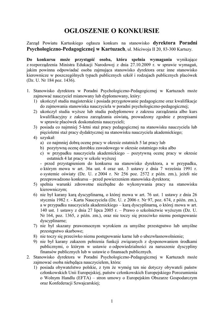 OGŁOSZENIE O KONKURSIE Zarząd Powiatu Kartuskiego ogłasza konkurs na stanowisko dyrektora Poradni Psychologiczno-Pedagogicznej w Kartuzach, ul. Mściwoja II 20, 83-300 Kartuzy. Do konkursu może przystąpić osoba, która spełnia wymagania wynikające z rozporządzenia Ministra Edukacji Narodowej z dnia 27.10.2009 r. w sprawie wymagań, jakim powinna odpowiadać osoba zajmująca stanowisko dyrektora oraz inne stanowisko kierownicze w poszczególnych typach publicznych szkół i rodzajach publicznych placówek (Dz. U. Nr 184 poz. 1436). 1. Stanowisko dyrektora w Poradni Psychologiczno-Pedagogicznej w Kartuzach może zajmować nauczyciel mianowany lub dyplomowany, który: 1) ukończył studia magisterskie i posiada przygotowanie pedagogiczne oraz kwalifikacje do zajmowania stanowiska nauczyciela w poradni psychologiczno-pedagogicznej; 2) ukończył studia wyższe lub studia podyplomowe z zakresu zarządzania albo kurs kwalifikacyjny z zakresu zarządzania oświatą, prowadzony zgodnie z przepisami w sprawie placówek doskonalenia nauczycieli; 3) posiada co najmniej 5-letni staż pracy pedagogicznej na stanowisku nauczyciela lub pięcioletni staż pracy dydaktycznej na stanowisku nauczyciela akademickiego; 4) uzyskał: a) co najmniej dobrą ocenę pracy w okresie ostatnich 5 lat pracy lub b) pozytywną ocenę dorobku zawodowego w okresie ostatniego roku albo c) w przypadku nauczyciela akademickiego – pozytywną ocenę pracy w okresie ostatnich 4 lat pracy w szkole wyższej - przed przystąpieniem do konkursu na stanowisko dyrektora, a w przypadku, o którym mowa w art. 36a ust. 4 oraz ust. 3 ustawy z dnia 7 września 1991 r. o systemie oświaty (Dz. U. z 2004 r. Nr 256 poz. 2572 z późn. zm.), jeżeli nie przeprowadzono konkursu – przed powierzeniem stanowiska dyrektora; 5) spełnia warunki zdrowotne niezbędne do wykonywania pracy na stanowisku kierowniczym; 6) nie był karany karą dyscyplinarną, o której mowa w art. 76 ust. 1 ustawy z dnia 26 stycznia 1982 r. - Karta Nauczyciela (Dz. U. z 2006 r. Nr 97, poz. 674, z późn. zm.), a w przypadku nauczyciela akademickiego – karą dyscyplinarną, o której mowa w art. 140 ust. 1 ustawy z dnia 27 lipca 2005 r. – Prawo o szkolnictwie wyższym (Dz. U. Nr 164, poz. 1365, z późn. zm.), oraz nie toczy się przeciwko niemu postępowanie dyscyplinarne; 7) nie był skazany prawomocnym wyrokiem za umyślne przestępstwo lub umyślne przestępstwo skarbowe; 8) nie toczy się przeciwko niemu postępowanie karne lub o ubezwłasnowolnienie; 9) nie był karany zakazem pełnienia funkcji związanych z dysponowaniem środkami publicznymi, o którym w ustawie o odpowiedzialności za naruszenie dyscypliny finansów publicznych lub w ustawie o finansach publicznych. 2. Stanowisko dyrektora w Poradni Psychologiczno-Pedagogicznej w Kartuzach może zajmować osoba niebędąca nauczycielem, która: 1) posiada obywatelstwo polskie, z tym że wymóg ten nie dotyczy obywateli państw członkowskich Unii Europejskiej, państw członkowskich Europejskiego Porozumienia o Wolnym Handlu (EFTA) – stron umowy o Europejskim Obszarze Gospodarczym oraz Konfederacji Szwajcarskiej; 1 2) ukończyła studia magisterskie; 3) posiada co najmniej 5-letni staż pracy, w tym co najmniej 2-letni staż pracy na stanowisku kierowniczym; 4) ma pełną zdolność do czynności prawnych i korzysta z praw publicznych; 5) nie toczy się przeciwko niej postępowanie karne, dyscyplinarne lub postępowanie o ubezwłasnowolnienie; 6) spełnia wymagania określone w pkt 1 ppkt 2, 5, 7 i 9. 3. Stanowisko dyrektora w Poradni Psychologiczno-Pedagogicznej w Kartuzach może zajmować również nauczyciel mianowany lub dyplomowany, zatrudniony na stanowisku wymagającym kwalifikacji pedagogicznych w urzędzie organu administracji rządowej, kuratorium oświaty, Centrum Edukacji Artystycznej, Centralnej Komisji Egzaminacyjnej i okręgowych komisjach egzaminacyjnych, oraz nauczyciel mianowany lub dyplomowany urlopowany lub zwolniony z obowiązku świadczenia pracy na podstawie przepisów ustawy z dnia 23 maja 1991 r. o związkach zawodowych (Dz. U. z 2001 r. Nr 79, poz. 854, z późn. zm.), spełniający wymagania określone w rozporządzeniu, z wyjątkiem wymogu posiadania co najmniej dobrej oceny pracy albo pozytywnej oceny dorobku zawodowego. Oferty osób przystępujących do konkursu powinny zawierać: 1) uzasadnienie przystąpienia do konkursu oraz koncepcję funkcjonowania i rozwoju Poradni Psychologiczno-Pedagogicznej w Kartuzach; 2) poświadczoną przez kandydata za zgodność z oryginałem kopię dowodu osobistego lub innego dokumentu potwierdzającego tożsamość oraz poświadczającego obywatelstwo kandydata; 3) życiorys z opisem przebiegu pracy zawodowej, zawierający w szczególności informację o: - stażu pracy pedagogicznej – w przypadku nauczyciela albo - stażu pracy dydaktycznej – w przypadku nauczyciela akademickiego, albo - stażu pracy, w tym stażu pracy na stanowisku kierowniczym – w przypadku osoby niebędącej nauczycielem, 4) oryginały lub poświadczone przez kandydata za zgodność z oryginałem kopie dokumentów potwierdzających posiadanie wymaganego stażu pracy, o którym mowa w pkt 3; 5) oryginałów lub poświadczonych przez kandydata za zgodność z oryginałem kopii dokumentów potwierdzających posiadanie wymaganego wykształcenia, w tym dyplomu ukończenia studiów wyższych lub świadectwa ukończenia studiów podyplomowych z zakresu zarządzania albo świadectwa ukończenia kursu kwalifikacyjnego z zakresu zarządzania oświatą; 6) zaświadczenie lekarskie o braku przeciwwskazań zdrowotnych do wykonywania pracy na stanowisku kierowniczym; 7) oświadczenie, że przeciwko kandydatowi nie toczy się postępowanie karne, postępowanie dyscyplinarne lub postępowanie o ubezwłasnowolnieniu; 8) oświadczenie, że kandydat nie był skazany prawomocnym wyrokiem za umyślne przestępstwo lub umyślne przestępstwo skarbowe; 9) oświadczenie, że k