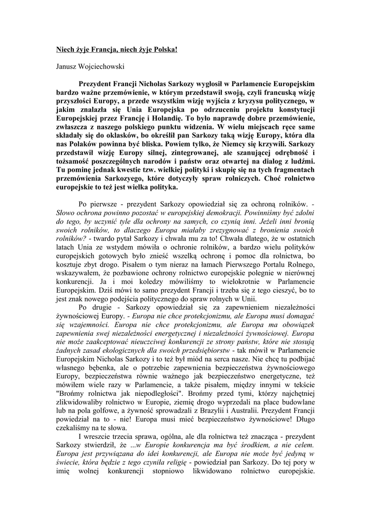 Niech żyje Francja, niech żyje Polska! Janusz Wojciechowski Prezydent Francji Nicholas Sarkozy wygłosił w Parlamencie Europejskim bardzo ważne przemówienie, w którym przedstawił swoją, czyli francuską wizję przyszłości Europy, a przede wszystkim wizję wyjścia z kryzysu politycznego, w jakim znalazła się Unia Europejska po odrzuceniu projektu konstytucji Europejskiej przez Francję i Holandię. To było naprawdę dobre przemówienie, zwłaszcza z naszego polskiego punktu widzenia. W wielu miejscach ręce same składały się do oklasków, bo określił pan Sarkozy taką wizję Europy, która dla nas Polaków powinna być bliska. Powiem tylko, że Niemcy się krzywili. Sarkozy przedstawił wizję Europy silnej, zintegrowanej, ale szanującej odrębność i tożsamość poszczególnych narodów i państw oraz otwartej na dialog z ludźmi. Tu pominę jednak kwestie tzw. wielkiej polityki i skupię się na tych fragmentach przemówienia Sarkozyego, które dotyczyły spraw rolniczych. Choć rolnictwo europejskie to też jest wielka polityka. Po pierwsze - prezydent Sarkozy opowiedział się za ochroną rolników. Słowo ochrona powinno pozostać w europejskiej demokracji. Powinniśmy być zdolni do tego, by uczynić tyle dla ochrony na samych, co czynią inni. Jeżeli inni bronią swoich rolników, to dlaczego Europa miałaby zrezygnować z bronienia swoich rolników? - twardo pytał Sarkozy i chwała mu za to! Chwała dlatego, że w ostatnich latach Unia ze wstydem mówiła o ochronie rolników, a bardzo wielu polityków europejskich gotowych było znieść wszelką ochronę i pomoc dla rolnictwa, bo kosztuje zbyt drogo. Pisałem o tym nieraz na łamach Pierwszego Portalu Rolnego, wskazywałem, że pozbawione ochrony rolnictwo europejskie polegnie w nierównej konkurencji. Ja i moi koledzy mówiliśmy to wielokrotnie w Parlamencie Europejskim. Dziś mówi to samo prezydent Francji i trzeba się z tego cieszyć, bo to jest znak nowego podejścia politycznego do spraw rolnych w Unii. Po drugie - Sarkozy opowiedział się za zapewnieniem niezależności żywnościowej Europy. - Europa nie chce protekcjonizmu, ale Europa musi domagać się wzajemności. Europa nie chce protekcjonizmu, ale Europa ma obowiązek zapewnienia swej niezależności energetycznej i niezależności żywnościowej. Europa nie może zaakceptować nieuczciwej konkurencji ze strony państw, które nie stosują żadnych zasad ekologicznych dla swoich przedsiębiorstw - tak mówił w Parlamencie Europejskim Nicholas Sarkozy i to też był miód na serca nasze. Nie chcę tu podbijać własnego bębenka, ale o potrzebie zapewnienia bezpieczeństwa żywnościowego Europy, bezpieczeństwa równie ważnego jak bezpieczeństwo energetyczne, też mówiłem wiele razy w Parlamencie, a także pisałem, między innymi w tekście "Brońmy rolnictwa jak niepodległości". Brońmy przed tymi, którzy najchętniej zlikwidowaliby rolnictwo w Europie, ziemię drogo wyprzedali na place budowlane lub na pola golfowe, a żywność sprowadzali z Brazylii i Australii. Prezydent Francji powiedział na to - nie! Europa musi mieć bezpieczeństwo żywnościowe! Długo czekaliśmy na te słowa. I wreszcie trzecia sprawa, ogólna, ale dla rolnictwa też znacząca - prezydent Sarkozy stwierdził, że ...w Europie konkurencja ma być środkiem, a nie celem. Europa jest przywiązana do idei konkurencji, ale Europa nie może być jedyną w świecie, która będzie z tego czyniła religię - powiedział pan Sarkozy. Do tej pory w imię wolnej konkurencji stopniowo likwidowano rolnictwo europejskie. Przeprowadzano reformę rynku cukru, zmierzającą do masowego zamykania cukrowni europejskich. Wprowadzono reformę rynku wina, żeby producenci win z Ameryki Południowej czy Australii mogli opanować europejski rynek. Otworzono też rynek europejski na import artykułów rolnych z całego świata, a jednocześnie likwidowano jedną po drugiej ekonomiczne zachęty eksportowe - wszystko to w ramach mszy odprawianej na ołtarzu wolnej konkurencji. Cóż to jednak za konkurencja, skoro rolnictwo europejskie z uwagi na warunki klimatyczne, glebowe, z uwagi na koszty pracy jest w oczywisty sposób niekonkurencyjne i bez ochrony padnie na twarz bardzo prędko. Sarkozy nie pozostawia wątpliwości, że tak się stać nie może i że polityka rolna w Europie musi być protekcjonistyczna. W pełni popieram ten kierunek myślenia. To było tylko jedno przemówienie - ale bardzo ważne przemówienie, mam nadzieje, że przełomowe w podejściu do rolnictwa europejskiego. Choć łątwo nie będzie, bo niechęci wobec rolnictwa jest w Europie wiele, we Francji też. Za kilka miesięcy Francja obejmie przewodnictwo w Unii Europejskiej, a jej prezydencja przypadnie na czas bardzo ważnych decyzji co do przyszłości i zakresu Wspólnej Polityki Rolnej po 2013 roku. Po wystąpieniu Sarkozyego mamy podstawy oczekiwać, że Francja będzie broniła rolnictwa. Polska powinna być w tej sprawie najbliższym sojusznikiem. Przecież Francja ma największe rolnictwo w Europie (pod względem globalnej wielkości produkcji rolniczej), a Polska to z kolei najbardziej rolniczy kraj Europy, bo nigdzie nie ma tak wielu rolników, jak w Polsce. Co czwarty rolnik Unii Europejskiej jest Polakiem. Musimy połączyć nasze wysiłki i wraz z Francją zbudować większość dla takiej polityki europejskiej, która będzie dobra dla wsi i rolnictwa. Mam nadzieję, że nowy polski rząd pójdzie w tym kierunku, w ślad za własnym hasłem by żyło się lepiej wszystkim. Bo rolnictwo europejskie musi przetrwać i rozwijać się, dla dobra wszystkich, nie tylko rolników. Panie Sarkozy, polscy rolnicy są z Panem! Vive la France, Vive la Pologne! Niech żyje Francja, niech żyje Polska!