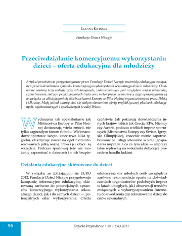 Lucyna Kicińska Fundacja Dzieci Niczyje Przeciwdziałanie komercyjnemu wykorzystaniu dzieci – oferta edukacyjna dla młodzieży Artykuł przedstawia przygotowywane przez Fundację Dzieci Niczyje materiały edukacyjne związane z przeciwdziałaniem zjawisku komercyjnego wykorzystania seksualnego dzieci i młodzieży. Omówione zostaną trzy rodzaje zajęć edukacyjnych, zróżnicowanych pod względem wieku odbiorców, czasu trwania, rodzaju przekazywanych treści oraz metod pracy. Scenariusze zajęć opracowywane są w związku ze zbliżającymi się Mistrzostwami Europy w Piłce Nożnej organizowanymi przez Polskę i Ukrainę. Mają jednak szansę stać się stałym elementem oferty profilaktycznej placówek edukacyjnych, wychowawczych i opiekuńczych w całej Polsce. W ydarzenia tak spektakularne jak Mistrzostwa Europy w Piłce Nożnej dostarczają wielu emocji, nie tylko zagorzałym fanom futbolu. Wielonarodowe sportowe święto, które trwa kilka tygodni, elektryzuje nawet na ogół niezainteresowanych piłką nożną. Piłka i jej kibice są wszędzie. Podczas sportowej fety nie możemy zapominać o dzieciach i o ich bezpie- czeństwie. Jak pokazują doświadczenia innych krajów, takich jak Grecja, RPA, Niemcy czy Austria, podczas wielkich imprez sportowych (Mistrzostwa Europy czy Świata, Igrzyska Olimpijskie), znacznie rośnie zapotrzebowanie na usługi seksualne w kraju gospodarza imprezy, a co za tym idzie — imprezy takie wpływają na wskaźniki dotyczące procederu handlu ludźmi. Działania edukacyjne skierowane do dzieci W związku ze zbliżającymi się EURO 2012, Fundacja Dzieci Niczyje przygotowuje kampanię informacyjno–edukacyjną, skierowaną zarówno do potencjalnych sprawców komercyjnego wykorzystania seksualnego dzieci, jak i do samych dzieci — potencjalnych ofiar wykorzystania. Oferta 96 edukacyjna dla młodych osób uwzględnia zarówno rekomendacje oparte na doświadczeniach organizatorów podobnych imprez w latach ubiegłych, jak i obserwacji trendów związanych z wykorzystywaniem Internetu do uwodzenia czy rekrutowania dzieci do celów seksualnych. Dziecko krzywdzone • nr 1 (34) 2011 Lucyna Kicińska • Przeciwdziałanie komercyjnemu wykorzystaniu dzieci... Cele zajęć edukacyjnych Przygotowywany program edukacyjny odpowiada na wiele potrzeb związanych z zapewnieniem bezpieczeństwa dzieciom i młodzieży. Są to przede wszystkim: • dostarczenie i utrwalenie wiedzy na temat zagrożeń związanych z wykorzystaniem seksualnym; • rozwijanie umiejętności rozpoznawania zagrożeń w różnych sytuacjach; • przybliżenie sposobów działania potencjalnych sprawców wykorzystania; • zachęcenie do reagowania i informowania o sytuacjach trudnych i zagrażających; • wspieranie umiejętności szukania pomocy dla siebie i innych; • dostarczenie wiedzy na temat osób i miejsc, w których można znaleźć pomoc w trudnych sytuacjach. Odbiorcy i prowadzący znaczona do wykorzystania w pracy z dziećmi i młodzieżą przez wszystkich zainteresowanych profesjonalistów. Tematyka komercyjnego wykorzystywania dzieci jest bardzo trudna i drażliwa. Nie każdy nauczyciel bowiem jest przygotowany do rozmowy z dziećmi i młodzieżą na temat niebezpiecznych sytuacji, takich jak gwałt, zmuszanie do pracy przymusowej czy niechciane stosunki seksualne. Również nie w każdej grupie czy klasie nastolatki są gotowe do otwartej rozmowy na takie tematy. Opracowano więc trzy scenariusze zajęć dostosowane zarówno do wieku odbiorców, ich wiedzy na temat zjawiska wykorzystania seksualnego, jak i umiejętności i gotowości prowadzącego do ich poprowadzenia. Scenariusze różnią się formą i metodami pracy, a także długością samych zajęć. praktyka Zajęcia edukacyjne skierowane są do uczniów w wieku 12–19 lat. Akcja promocyjna i dystrybucyjna materiałów edukacyjnych będzie przede wszystkim skierowana do placówek edukacyjnych, opiekuńczych i wychowawczych w miastach goszczących EURO 2012 w Polsce (Warszawa, Wrocław, Poznań, Gdańsk), a także do placówek województwa podkarpackiego (część kibiców będzie podróżowała pomiędzy stadionami w Polsce i na Ukrainie). Program realizowany będzie również w miastach, w których znajdowały będą się przejścia graniczne (na czas EURO 2012 przywrócona zostanie kontrola na wszystkich granicach Polski). Część materiałów — niewymagająca specjalistycznego przeszkolenia prowadzących — zostanie udostępniona przez stronę internetową towarzyszącą programowi i prze- Zajęcia krótkie – scenariusz Na realizację zajęć należy przeznaczyć dwie kolejne godziny lekcyjne oraz dzielącą je przerwę (łącznie od 90 do 100 minut). Scenariusz uwzględnia wskazówki dla prowadzących zajęcia z młodszymi dziećmi, tak by przekazywane treści i ich forma były jak najlepiej dostosowane do poziomu rozwoju i umiejętności społecznych uczestników. Zajęcia dostarczają informacji podstawowych i niezbędnych dla dzieci, które nie uczestniczyły wcześniej w zajęciach profilaktycznych na temat wykorzystania seksualnego czy handlu ludźmi. Jasna struktura oraz forma zaproponowanych zajęć pozwala w krótkim czasie na najefektywniejsze przekazanie dzieciom wiedzy podnoszącej Dziecko krzywdzone • nr 1 (34) 2011 97 praktyka Lucyna Kicińska • Przeciwdziałanie komercyjnemu wykorzystaniu dzieci... 98 poczucie bezpieczeństwa. Uczniowie przez całe zajęcia pracują w tych samych kilkuosobowych grupach, wykonując kolejne zadania: tworzą profil swojego rówieśnika w portalu społecznościowym/profil właściciela bloga (do wyboru w oparciu o preferencje uczestników zajęć), tworzą wpisy, odpisują na wiadomości itp. Rozwijają także swoje kompetencje ochrony własnego bezpieczeństwa, takie jak: • rozważne udzielanie informacji o sobie osobom nieznanym (w Internecie i nie tylko); • ocenianie motywacji i oczekiwań nowo poznanych osób w różnym wieku; • szacowanie 