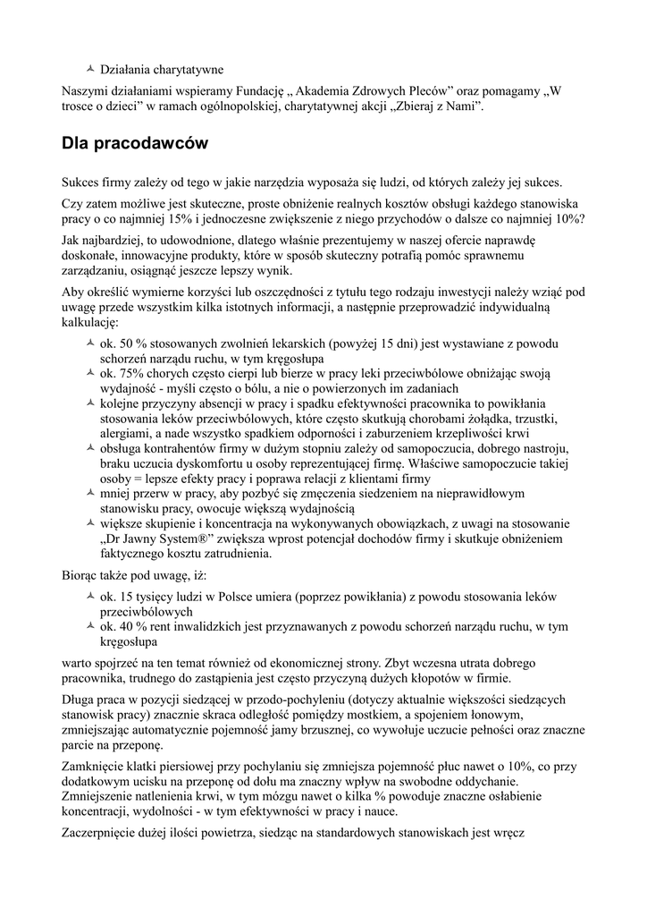 Działania charytatywne Naszymi działaniami wspieramy Fundację „ Akademia Zdrowych Pleców” oraz pomagamy „W trosce o dzieci” w ramach ogólnopolskiej, charytatywnej akcji „Zbieraj z Nami”. Dla pracodawców Sukces firmy zależy od tego w jakie narzędzia wyposaża się ludzi, od których zależy jej sukces. Czy zatem możliwe jest skuteczne, proste obniżenie realnych kosztów obsługi każdego stanowiska pracy o co najmniej 15% i jednoczesne zwiększenie z niego przychodów o dalsze co najmniej 10%? Jak najbardziej, to udowodnione, dlatego właśnie prezentujemy w naszej ofercie naprawdę doskonałe, innowacyjne produkty, które w sposób skuteczny potrafią pomóc sprawnemu zarządzaniu, osiągnąć jeszcze lepszy wynik. Aby określić wymierne korzyści lub oszczędności z tytułu tego rodzaju inwestycji należy wziąć pod uwagę przede wszystkim kilka istotnych informacji, a następnie przeprowadzić indywidualną kalkulację: ok. 50 % stosowanych zwolnień lekarskich (powyżej 15 dni) jest wystawiane z powodu schorzeń narządu ruchu, w tym kręgosłupa ok. 75% chorych często cierpi lub bierze w pracy leki przeciwbólowe obniżając swoją wydajność - myśli często o bólu, a nie o powierzonych im zadaniach kolejne przyczyny absencji w pracy i spadku efektywności pracownika to powikłania stosowania leków przeciwbólowych, które często skutkują chorobami żołądka, trzustki, alergiami, a nade wszystko spadkiem odporności i zaburzeniem krzepliwości krwi obsługa kontrahentów firmy w dużym stopniu zależy od samopoczucia, dobrego nastroju, braku uczucia dyskomfortu u osoby reprezentującej firmę. Właściwe samopoczucie takiej osoby = lepsze efekty pracy i poprawa relacji z klientami firmy mniej przerw w pracy, aby pozbyć się zmęczenia siedzeniem na nieprawidłowym stanowisku pracy, owocuje większą wydajnością większe skupienie i koncentracja na wykonywanych obowiązkach, z uwagi na stosowanie „Dr Jawny System®” zwiększa wprost potencjał dochodów firmy i skutkuje obniżeniem faktycznego kosztu zatrudnienia. Biorąc także pod uwagę, iż: ok. 15 tysięcy ludzi w Polsce umiera (poprzez powikłania) z powodu stosowania leków przeciwbólowych ok. 40 % rent inwalidzkich jest przyznawanych z powodu schorzeń narządu ruchu, w tym kręgosłupa warto spojrzeć na ten temat również od ekonomicznej strony. Zbyt wczesna utrata dobrego pracownika, trudnego do zastąpienia jest często przyczyną dużych kłopotów w firmie. Długa praca w pozycji siedzącej w przodo-pochyleniu (dotyczy aktualnie większości siedzących stanowisk pracy) znacznie skraca odległość pomiędzy mostkiem, a spojeniem łonowym, zmniejszając automatycznie pojemność jamy brzusznej, co wywołuje uczucie pełności oraz znaczne parcie na przeponę. Zamknięcie klatki piersiowej przy pochylaniu się zmniejsza pojemność płuc nawet o 10%, co przy dodatkowym ucisku na przeponę od dołu ma znaczny wpływ na swobodne oddychanie. Zmniejszenie natlenienia krwi, w tym mózgu nawet o kilka % powoduje znaczne osłabienie koncentracji, wydolności - w tym efektywności w pracy i nauce. Zaczerpnięcie dużej ilości powietrza, siedząc na standardowych stanowiskach jest wręcz niemożliwe. Natomiast przy stosowaniu „Dr Jawny system®”, nawet osoby z nadwagą zwracają uwagę na to, że nie mają z tym trudności, mogą znacznie dłużej pracować w skupieniu, bez odrywania się od „biurka” i pracuje im się zdecydowanie bardziej komfortowo. Jeśli połączymy fakt ewidentnych oszczędności na zwolnieniach lekarskich oraz znaczne podniesienie efektywności pracy lub nauki to zakup „Dr Jawny system®” przynosi wymierne korzyści i zwraca się już często w pierwszym roku stosowania. Im droższy pracownik, im „ważniejsze” zajmuje stanowisko - tym korzyści są większe. Znane na świecie firmy już od dawna potrafią wydawać na dobre krzesło lub fotel nawet kilka tysięcy (USD lub Euro) bo wiedzą, że to się opłaca. Nie stać tych firm zwyczajnie na to, aby zatrudniać dobrego fachowca i dać mu nieodpowiednie narzędzia. Porównując, jeśli dobremu kierowcy rajdowemu dać kiepskie auto - nigdy nie osiągnie sukcesu. Biorąc pod uwagę powyższe argumenty oraz: trwałość zastosowanych materiałów, które są w stanie wytrzymać olbrzymie obciążenia estetykę i ergonomię wykonania innowacyjność i pozytywne opinie środowiska lekarzy, rehabilitantów i specjalistów opinie i polecenia Instytutu Medycyny Pracy, stosowania na wszystkich stanowiskach, wymagających „pracy siedzącej” status przełomowego produktu medycznego zastosowanie zestawów lub foteli z serii „Dr Jawny System®” to jednorazowa, stosunkowo niewielka inwestycja kapitałowa, lecz zarazem długoletnia gwarancja prowadzenia działalności firmy w skuteczny i właściwy sposób. Dr Jawny System ® „Dr Jawny System ®” jest zwieńczeniem koncepcji Systemu Aktywnej Profilaktyki Kręgosłupa SAPK ® oraz wieloletnich prac konstruktorskich dr Jarosława Jawnego. Wszystkie części zestawu dostosowują się do potrzeb użytkownika. Została pokonana bariera związana ze zmieniającym się wzrostem i ciężarem użytkownika (sprzęt zalecany jest u osób od 130 cm do 199 cm wzrostu, praktycznie bez ograniczeń wagowych). Ten obecnie jedyny na świecie system - kompakt (połączenie siedzenia z biurkiem) - powoduje, że to nie my dostosowujemy się do stanowiska pracy, tylko wszystkie elementy systemu dostosowują się do naszych potrzeb (gwarantuje to nieskończona ilość możliwości ułożeń wszystkich elementów w tym ruch blatu w płaszczyźnie 3D). Zajęcia biurowe, szkolne, a także wypoczynek nie będą już zagrażać zdrowiu Twojego kręgosłupa. Idealny kąt siedzenia Typowe krzesło, które ma nisko położone siedzisko w pozycji równoległej do podłoża powoduje, że kąt pomiędzy kością udową a osią pionową miednicy jest prosty lub ostry, co powoduje wzmożo