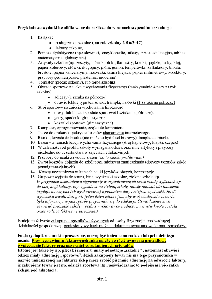 Przykładowe wydatki kwalifikowane do rozliczenia w ramach stypendium szkolnego 1. Książki : podręczniki szkolne ( na rok szkolny 2016/2017) lektury szkolne, 2. Pomoce dydaktyczne (np.: słowniki, encyklopedie, atlasy, prasa edukacyjna, tablice matematyczne, globusy itp.) 3. Artykuły szkolne (np. zeszyty, piórnik, bloki, flamastry, kredki, pędzle, farby, klej, papier kolorowy, ołówki, długopisy, pióra, gumki, temperówki, kalkulatory, bibuła, brystole, papier kancelaryjny, nożyczki, taśma klejąca, papier milimetrowy, korektory, przybory geometryczne, plastelina, modelina) 4. Tornister (plecak szkolny), lub torba szkolna 5. Obuwie sportowe na lekcje wychowania fizycznego (maksymalnie 4 pary na rok szkolny) adidasy (1 sztuka na półrocze) obuwie lekkie typu tenisówki, trampki, halówki (1 sztuka na półrocze) 6. Strój sportowy na zajęcia wychowania fizycznego: dresy, lub bluza i spodnie sportowe(1 sztuka na półrocze), getry, spodenki gimnastyczne koszulki sportowe (gimnastyczne) 7. Komputer, oprogramowanie, części do komputera 8. Tusze do drukarek, pokrycie kosztów abonamentu internetowego. 9. Biurko, krzesło do biurka (nie może to być fotel biurowy), lampka do biurka 10. Basen –w ramach lekcji wychowania fizycznego (strój kąpielowy, klapki, czepek) 11 W zależności od profilu szkoły wymagana odzież oraz inne artykuły i przybory niezbędne do uczestnictwa w zajęciach edukacyjnych 12. Przybory do nauki zawodu: (jeżeli jest to szkoła profilowana) 13. Zwrot kosztów dojazdu do szkół poza miejscem zamieszkania (dotyczy uczniów szkół ponadgimnazjalnych) 14. Koszty uczestnictwa w kursach nauki języków obcych, korepetycje 15. Grupowe wyjścia do teatru, kina, wycieczki szkolne, zielona szkoła itp. W przypadku uczestnictwa stypendysty w organizowanych przez szkołę wyjściach np. do instytucji kultury, czy wyjazdach na zieloną szkołę, należy napisać oświadczenie (wydaje nauczyciel lub wychowawca) z podaniem daty i miejsca wycieczki. Jeżeli wycieczka trwała dłużej niż jeden dzień istotne jest, aby w oświadczeniu zawarta była informacja w jaki sposób przyczyniła się do edukacji. Oświadczenie musi zawierać pieczątkę szkoły i podpis wychowawcy z adnotacją iż w/w kwota zastała przez rodzica faktycznie uiszczona.) Istnieje możliwość zakupu podręczników używanych od osoby fizycznej nieprowadzącej działalności gospodarczej, poniesiony wydatek można udokumentować umową kupna– sprzedaży. Faktury, bądź rachunki uproszczone, muszą być imienne na rodzica lub pełnoletniego ucznia. Przy wystawianiu faktury/rachunku należy zwrócić uwagę na prawidłowe wypisywanie faktury oraz nazewnictwo zakupionych artykułów Istotne jest także by np. plecak i inne art. miały adnotacje „szkolne” , natomiast obuwie i odzież miały adnotację „sportowe”. Jeżeli zakupiony towar nie ma tego przymiotnika w nazwie umieszczonej na fakturze sklep może zrobić pisemnie adnotację na odwrocie faktury, iż zakupiony towar jest np. odzieżą sportową itp., poświadczając to podpisem i pieczątką sklepu pod adnotacją. str. 1 UWAGA!!! Powyższe dokumenty(faktury, rachunki, oświadczenia wychowawców) proszę przynosić systematycznie : - za pierwsze półrocze maksymalnie do 02.12.2016r. - za drugie półrocze maksymalnie do 02.06.2017r. str. 2