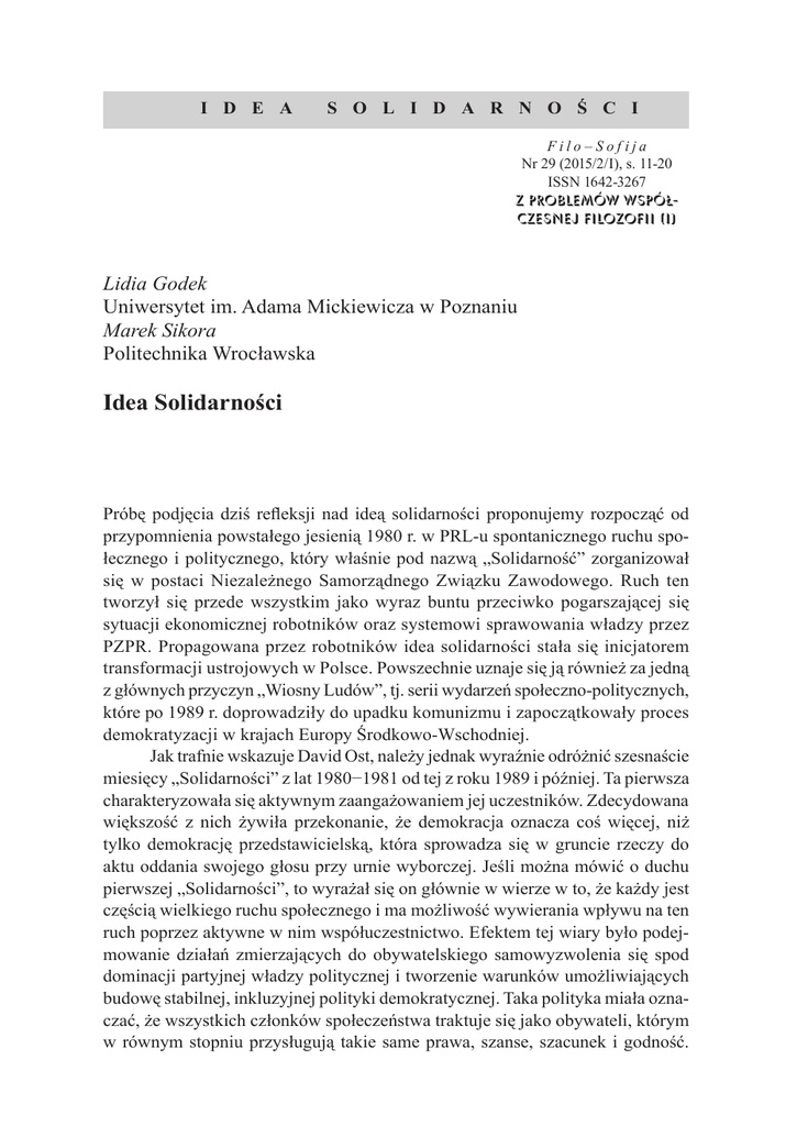 I d e a s o l i d a r n o ś c i Filo– Sofija Nr 29 (2015/2/I), s. 11-20 ISSN 1642-3267 z problemów współczesnej filozofii (I) Lidia Godek Uniwersytet im. Adama Mickiewicza w Poznaniu Marek Sikora Politechnika Wrocławska Idea Solidarności Próbę podjęcia dziś refleksji nad ideą solidarności proponujemy rozpocząć od przypomnienia powstałego jesienią 1980 r. w PRL-u spontanicznego ruchu społecznego i politycznego, który właśnie pod nazwą „Solidarność” zorganizował się w postaci Niezależnego Samorządnego Związku Zawodowego. Ruch ten tworzył się przede wszystkim jako wyraz buntu przeciwko pogarszającej się sytuacji ekonomicznej robotników oraz systemowi sprawowania władzy przez PZPR. Propagowana przez robotników idea solidarności stała się inicjatorem transformacji ustrojowych w Polsce. Powszechnie uznaje się ją również za jedną z głównych przyczyn „Wiosny Ludów”, tj. serii wydarzeń społeczno-politycznych, które po 1989 r. doprowadziły do upadku komunizmu i zapoczątkowały proces demokratyzacji w krajach Europy Środkowo-Wschodniej. Jak trafnie wskazuje David Ost, należy jednak wyraźnie odróżnić szesnaście miesięcy „Solidarności” z lat 1980−1981 od tej z roku 1989 i później. Ta pierwsza charakteryzowała się aktywnym zaangażowaniem jej uczestników. Zdecydowana większość z nich żywiła przekonanie, że demokracja oznacza coś więcej, niż tylko demokrację przedstawicielską, która sprowadza się w gruncie rzeczy do aktu oddania swojego głosu przy urnie wyborczej. Jeśli można mówić o duchu pierwszej „Solidarności”, to wyrażał się on głównie w wierze w to, że każdy jest częścią wielkiego ruchu społecznego i ma możliwość wywierania wpływu na ten ruch poprzez aktywne w nim współuczestnictwo. Efektem tej wiary było podejmowanie działań zmierzających do obywatelskiego samowyzwolenia się spod dominacji partyjnej władzy politycznej i tworzenie warunków umożliwiających budowę stabilnej, inkluzyjnej polityki demokratycznej. Taka polityka miała oznaczać, że wszystkich członków społeczeństwa traktuje się jako obywateli, którym w równym stopniu przysługują takie same prawa, szanse, szacunek i godność. 12 Lidia Godek, Marek Sikora Druga „Solidarność”, jak pisze Ost, ilustruje upadek tego, jak ruch społeczny zainicjowany przez robotników, dla którego ci robotnicy są podstawą, może zostać zaprzepaszczony i jakie szkody ponosi stabilizacja demokracji, kiedy jej główni uczestnicy zostają zignorowani czy wręcz nawet wykluczeni. Traktuje się ich jako przeszkodę w procesie demokratyzacji i sprowadza na margines tego procesu1. Łącząc ideę solidarności z ruchem społeczno-politycznym „Solidarność” z lat 1980–1981, przypomnijmy, na czym polegała swoistość tego ruchu. Obowiązujący w PRL system państwowego socjalizmu dążył do podporządkowania sobie wszelkich przejawów obywatelskiej aktywności, szczególnie tej, która wyrażała się w obrębie praw obywatelskich. Socjalizm państwowy chciał dosłownie kontrolować całe życie każdego obywatela2. Propagandowym uzasadnieniem ustawicznej kontroli wszystkich i wszystkiego była wizja budowy bezklasowej wspólnoty równych obywateli. Tymczasem faktycznie była to jedynie wizja równości i to wizja równości całkowicie karykaturalnej. Karykaturalnej w tym sensie, że ujawniającej ukrytą prawdę. Socjalizm państwowy, jak pisze Leszek Nowak, okazał się bowiem najbardziej klasowym społeczeństwem w dziejach. W dawnych społeczeństwach klasowych masy ludowe podlegały trzem względnie niezależnym od siebie potęgom: (1) własności, (2) władzy i (3) doktrynie. W ten sposób nad ludem panowały trzy klasy tyranów: właściciele, władcy i kapłani. W tak zwanym społeczeństwie socjalistycznym upaństwowione zostają zarówno gospodarka, jak i kultura. „Władza polityczna staje się więc władzą gospodarczą i władzą doktrynalną. Zamiast trzech rozdzielonych klas ciemiężców powstaje jedna klasa trój-panująca”3. Jej podstawowym celem jest podporządkowanie sobie jak największej liczby obywateli po to, by pełnić nad nimi władzę dla samej władzy. Socjalizm [...] powstał z chwilą, kiedy w rękach nielicznej mniejszości znalazły się środki przymusu, produkcji i informacji. I osiągnął swój szczyt wtedy, kiedy władza aparatu partyjnego nad masami była największa – w czasach terroru, nędzy i otumanienia, w czasach zniewolenia mylnie zwanego s t a l i n i z m e m . Od tej pory kolejne rewolucje mas ludowych coraz bardziej podważają system trój-władzy; dzisiejszym trój-panom daleko do potęgi, jaką mieli przed kilkudziesięciu laty ich poprzednicy. Socjalizm, pisze w 1983 r. Nowak, się powoli kończy. Kończy się pod rewolucyjnymi ciosami mas. Socjalizm system trój-władzy, odchodzi w przeszłość.4 Do końca swoich dni system socjalizmu państwowego usiłował jednak zawłaszczyć dla siebie hasła walki klasowej. Krył się za parawanem rewolu1 D. Ost, Klęska „Solidarności”. Gniew i polityka w postkomunistycznej Europie, przeł. H. Jankowska, Warszawskie Wydawnictwo Literackie MUZA SA, Warszawa 2007, s. 17-18, 33-35, 49-53. Ost zwraca uwagę na paradoksalną sytuację robotników w procesie transformacji. Doprowadzając do upadku komunizmu i narodzin demokracji, robotnicy sami okazali się największymi przegranymi tej przemiany. 2 J. Kuroń, Polityka i odpowiedzialność, „Aneks”, Londyn 1984, s. 108. L. Nowak, Anty-Rakowski, czyli o tym, co wygwizdali wicepremierowi robotnicy, broszura, Wrocław 1983, s. 5. 3 4 Ibidem, s. 8. Idea Solidarności 13 cyjnych frazesów. Zarzucał wszystkim swoim krytykom i przeciwnikom, że są kontrrewolucjonistami. Przekonywał, że kontynuuje odwieczną tradycję walki mas o wyzwolenie, sprawiedliwość społeczną czy uspołecznienie. Trój-panowie [...] splugawili te hasła tak skutecznie – pisze Nowa