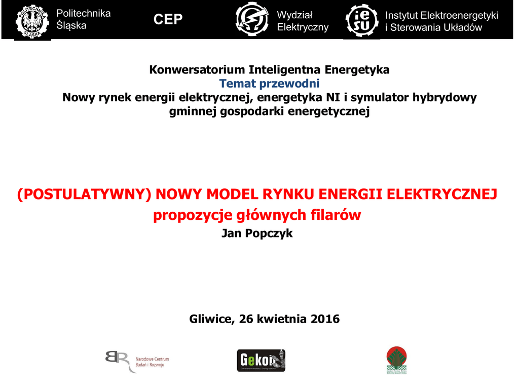 C Politechnika Śląska CEP Wydział Elektryczny Instytut Elektroenergetyki i Sterowania Układów Konwersatorium Inteligentna Energetyka Temat przewodni Nowy rynek energii elektrycznej, energetyka NI i symulator hybrydowy gminnej gospodarki energetycznej (POSTULATYWNY) NOWY MODEL RYNKU ENERGII ELEKTRYCZNEJ propozycje głównych filarów Jan Popczyk Gliwice, 26 kwietnia 2016 ŹRÓDŁO KRYZYSU trójsegmentowy układ interesów na rynku energii elektrycznej rząd RYNEK GRUP INTERESÓW vs rynek energii elektrycznej energetyka WEK beneficienci systemów wsparcia 2 POTRZEBA BUDOWY CAŁKOWICIE NOWEGO RYNKU ENERGII ELEKTRYCZNEJ 1. Rynek mocy szczytowych odbiorców vs rynek mocy wytwórców 2. Skrócenie , w tendencji, okresu transakcyjnego do 5 minut 3. Nowa koncepcja opłaty przesyłowej (nowe nośniki składowych stałych i zmiennych tej opłaty) 4. Decentralizacja usług systemowych, konwergencja bilansowania energii i regulacji mocy (net metering w bardzo krótkich przedziałach czasowych, rzędu 5 minut), w tendencji cenotwórstwo czasu rzeczywistego 3 ROZSZERZENIE KONCEPCJI RYNKU IREE [POPCZYK. BŹEP]: (1) RM(O) vs RM(W) RM(O) – rynek mocy odbiorców RM(W) – rynek mocy wytwórców (2) BE(5) BE(5) – bilansowanie energii 5-minutowe (105120 bilansów w roku) (3) ZOS(5) vs TP(TPA) ZOS(5) – zmienna opłata sieciowa 5-minutowa TD(TPA) – taryfa dystrybucyjna na runku TPA (4) DSM/DSR-TD-CCR(EP,NI) vs RUS(WEK), NM(5) DSM/DSR – zarządzanie popytem i źródłami rozproszonymi TD – taryfa dynamiczna CCR – cenotwórstwo czasu rzeczywistego RUS(EP,NI) – regulacyjne usługi systemowe w energetyce EP, NI (zindywidualizowane) RUS(WEK) – regulacyjne usługi systemowe w energetyce WEK NM(5) – net metering 5-minutowy DO CZEGO JEST POTRZEBNY RYNEK IREE? - do upraszczania rynku energii elektrycznej i wzmacniania konkurencji na tym rynku Obecne, dominujące środowisko rynkowe WEK (tworzone w okresie 1990-2010) 1. Taryfy końcowe: WN-A (A23) – 200/67 PLN/MWh; SN-B (B11, B21,B22, B23) – 227/103 PLN/MWh; nN-C (C11, C12, C21, C22) – 313/253 PLN/MWh; nN-G (G 11, G12) – 260/230 PLN/MWh 2. Rynek hurtowy: kontrakty bilateralne średnioterminowe, rynki giełdowe (RDN, RDB); brakuje rynków inwestycyjnych 3. Operator systemu przesyłowego – system informatyczny SOWE (System Operatywnej Współpracy z Elektrowniami), instrukcja IRiESP, rynek techniczny (RB) 4. Operatorzy systemów dystrybucyjnych – instrukcja IRiESD, taryfy dystrybucyjne 5. System informatyczny WIRE (Wymiana Informacji Rynku Energii) Obecne środowisko rynkowe OZE (tworzone przez ostatnie 10 lat) 1. Certyfikaty (gama kolorów) – dotychczasowe systemy wsparcia 2. Aukcja (system adresowany do WEK oraz do NI) i feed-in tariff dla prosumentów – uchwalona (i w nowelizacji, jeszcze przed wejściem w życie) ustawa OZE (2015) 3. Operator OHT – operator handlowo-techniczny (NI – pretendenci) Przyszłe środowisko rynkowe (IREE) 1. Wirtualna wyspa (WW) – domena NI-IWW (pretendentów) 2. Taryfa dynamiczna (TD) – domena NI-IWW (pretendentów) 3. Interfejs mikroinfrastruktury PME pracującej w trybie: on grid → semi off grid → off grid 4. Systemy integracji auto-kogeneracji i autonomicznych systemów OZE dedykowane do poszczególnych segmentów EP („od Kowalskiego po KGHM”) BAZA PROFILI DOBOWYCH 1. Baza referencyjnych „naturalnych” profili dobowych zapotrzebowania: KSE, GPZ, stacja transformatorowa SN/nN, miasto, gmina wiejska, 12 pod-segmentów energetyki EP, 2. Baza profili produkcji „wymuszonej” źródeł OZE: źródła wiatrowe, źródła PV 3. Pierwsza propozycja dób referencyjnych: 1° - doba jesienno-zimowa, bezsłoneczna: niska temperatura, silny (stabilny) wiatr, 2° - doba wiosennoletnia: średnia temperatura, słaby wiatr, słabe nasłonecznienie, 3° - doba letnia, bezwietrzna: wysoka temperatura, silne (stabilne) nasłonecznienie, 4° - doba letnio-jesienna: średnia temperatura, średni wiatr, średnie nasłonecznienie LISTA BLOKÓW PROBLEMOWYCH (tematy opracowywane przez studentów VI sem. kierunku Energetyka na Wydziale Elektrycznym Politechniki Śląskiej (specjalizacja Smart grid) 1. Infrastruktura operatorska OHT na rynku IREE (Tkocz, Stylok). Mapa drogowa 2020 rozwoju infrastruktury OHT 2. IoT (Musialik, Dybał, Dzierżęga). Mapa drogowa 2025 rozwoju IoT. Strategia przemysłu ICT, reakcja producentów AGD, potencjał dyfuzji prosumentów. Miejsce IoT na rynku IREE: odpowiedź energetyki EP, NI, WEK 3. Smart grid vs AMI (Buss, Dybał, Dzierżenga, Gietka, Janiszewski, Juda, Niechcioł, Nowak, Raduj, Stylok). Wykorzystanie DSM/DSR, TD oraz CCR do ewolucyjnej przebudowy rynku energii elektrycznej. Potencjał dyfuzji usług RISUE. Mapa drogowa 2025 transformacji rynku energii elektrycznej w kierunku IREE z taryfą TD i cenotwórstwem CCR 4. Samochód elektryczny (Mostowska). Mapa drogowa 2030 transformacji rynku nowych samochodów w rynek samochodów EV (roczna sprzedaż – 400 tys. samochodów). Powiązanie tej mapy z mapą drogową wg p. 5 i z rynkiem IREE 5. Dom jednorodzinny off grid (Gietka, Samorodny). Mapa drogowa 2030 rewitalizacji domów jednorodzinnych (6 mln domów) do standardu off grid. Powiązanie tej mapy z mapą drogową wg p. 4 i z rynkiem IREE 6. Gospodarstwo rolne, w tendencji off grid (Samorodny, Tkocz, Buss). Mapa drogowa 2040 transformacji energetyki na obszarach wiejskich do energetyki bezemisyjnej (ponad milion gospodarstw socjalnych i ponad 300 tysięcy gospodarstw małotowarowych). Powiązanie tej mapy z rynkiem IREE 7. Analiza SWOT na rynku RISUE (Pałasz, Musialik). Wykonanie analiz w kontekście tematów 1-5 OBSZARY WIEJSKIE AUTONOMICZNE ENERGETYCZNIE W HORYZONCIE 2040 błąd i kłopot, czy wysiłek i wielka szansa? 1. Transformacja, od 2000 roku, rynku energii w rynek grup interesów. Bezwzględna konieczność odwrócenia trendu 2. Model referencyjny (łatwo skalowalny) gminnej gospodarki energetycznej 3. Przygotowania do wytworzenia oddolnych zdolności
