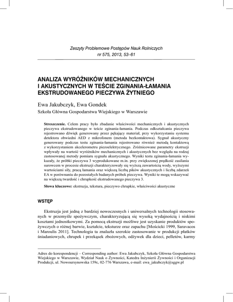 Zeszyty Problemowe Postępów Nauk Rolniczych nr 575, 2013, 53–61 ANALIZA WYRÓŻNIKÓW MECHANICZNYCH I AKUSTYCZNYCH W TEŚCIE ZGINANIA-ŁAMANIA EKSTRUDOWANEGO PIECZYWA ŻYTNIEGO Ewa Jakubczyk, Ewa Gondek Szkoła Główna Gospodarstwa Wiejskiego w Warszawie Streszczenie. Celem pracy było zbadanie właściwości mechanicznych i akustycznych pieczywa ekstrudowanego w teście zginania-łamania. Podczas odkształcania pieczywa rejestrowano dźwięk generowany przez pękający materiał, przy wykorzystaniu systemu detektora obwiedni AED z mikrofonem (metoda bezkontaktowa). Sygnał akustyczny generowany podczas testu zginania-łamania rejestrowano również metodą kontaktową z wykorzystaniem akcelerometru piezoelektrycznego. Zróżnicowane parametry ekstruzji wpływały na wartość wyróżników mechanicznych i akustycznych bez względu na rodzaj zastosowanej metody pomiaru sygnału akustycznego. Wyniki testu zginania-łamania wykazały, że próbki pieczywa 3 wyprodukowane m.in. przy zwiększonej prędkość zasilania surowcem w procesie ekstruzji charakteryzowały się wyższą zawartością wody, wyższymi wartościami siły, pracą łamania oraz większą liczbą pików akustycznych i liczbą zdarzeń EA w porównaniu do pozostałych badanych próbek pieczywa. Wyniki te mogą wskazywać na większą twardość i chrupkość ekstrudowanego pieczywa 3. Słowa kluczowe: ekstruzja, tekstura, pieczywo chrupkie, właściwości akustyczne WSTĘP Ekstruzja jest jedną z bardziej nowoczesnych i uniwersalnych technologii stosowanych w przemyśle spożywczym, charakteryzującą się wysoką wydajnością i niskimi kosztami jednostkowymi. Za pomocą ekstruzji możliwe jest uzyskanie produktów spożywczych o różnej barwie, kształcie, teksturze oraz zapachu [Mościcki 1999, Saravacos i Maroulis 2011]. Technologia ta znalazła szerokie zastosowanie w produkcji płatków śniadaniowych, chrupek i przekąsek zbożowych, odżywek dla dzieci, pelletów, karmy Adres do korespondencji – Corresponding author: Ewa Jakubczyk, Szkoła Główna Gospodarstwa Wiejskiego w Warszawie, Wydział Nauk o Żywności, Katedra Inżynierii Żywności i Organizacji Produkcji, ul. Nowoursynowska 159c, 02-776 Warszawa, e-mail: [email protected] 54 E. Jakubczyk, E. Gondek dla zwierząt domowych, pieczywa chrupkiego czy gum do żucia [Mościcki i in. 2007]. Ekstruzja surowców pochodzenia roślinnego polega na termoplastycznym wytłaczaniu materiału sypkiego pod ciśnieniem i w wysokiej temperaturze. Określony kształt produktu formowany jest poprzez przeciskanie materiału przez otwór w matrycy. Przesuw surowca jest możliwy dzięki pracy ślimaka lub ślimaków umieszczonych w obudowie ekstrudera [Mościcki i in. 2007, Saravacos i Maroulis 2011]. O tym czy nowy ekstrudowany produkt zyska uznanie wśród konsumentów decydują w głównej mierze jego cechy teksturalne, przy czym cechy szczególnie pożądane to kruchość i chrupkość [Anton i Luciano 2007]. Wielu autorów podkreśla, że jakość ekstrudatów determinowana jest m.in. parametrami ekstruzji, takimi jak temperatura, ciśnienie wytłaczania, prędkość zasilania surowcem czy prędkość obrotowa ślimaka [Ryu i Walker 1995, Ding i in. 2006]. Struktura produktów ekstrudowanych i ich właściwości funkcjonalne mogą być również kształtowane poprzez wprowadzenie do ekstrudera odpowiedniego surowca i regulację jego wilgotności [Mościcki 1999, Janssen i in. 2002]. Teksturę produktów ekstrudowanych badano, stosując różne techniki instrumentalne. Wyróżniki teksturalne jakie określono, były istotnie skorelowane z atrybutami sensorycznymi, takimi jak kruchość i twardość. Wśród instrumentalnych technik badania tekstury na wyróżnienie zasługuje m.in. test zginania-łamania, często stosowany do oceny tekstury produktów kruchych/chrupkich [Robin i in. 2012]. W ostatnich latach prowadzono wiele eksperymentów zmierzających do opracowania obiektywnych instrumentalnych metod badania tekstury żywności. Badając różne surowce i produkty spożywcze stwierdzono, że połączenie technik akustycznych i testów mechanicznych pozwala na uzyskanie pełniejszej informacji o kruchości produktów niż stosowanie tylko jednej z tych metod. Rodzaj i intensywność dźwięku emitowanego przez odkształcaną żywność są ściśle związane z jego strukturą i teksturą [Saeleaw i Schleining 2011]. Właściwości akustyczne żywności badano, stosując technikę emisji akustycznej [Marzec i in. 2007, Gondek i in. 2009, Zdunek i in. 2011] lub metodę, w której dźwięk rejestrowano przez mikrofon [Chen i in. 2005, Varela i in. 2008, Arimi i in. 2010]. Niewiele jest prac [Jakubczyk 2012, Gondek i in. 2013], w których jednocześnie zastosowano obie metody pomiaru właściwości akustycznych. Celem pracy było określenie właściwości mechanicznych i akustycznych (za pomocą metody kontaktowej, jak i bezkontaktowej) pieczywa ekstrudowanego w teście zginania-łamania. MATERIAŁ I METODY BADAŃ Materiał badawczy stanowiło ekstrudowane pieczywo dostarczone przez lokalnego producenta w opakowaniach handlowych z pominięciem obrotu handlowego. Podstawowym składnikiem mieszanki poddanej ekstruzji była pełnoziarnista mąka żytnia. Z mieszanki o takim samym składzie wyprodukowano pieczywo chrupkie przy zastosowaniu zróżnicowanych parametrów pracy ekstrudera BC firmy Clextral (tab. 1). W badanym pieczywie oznaczano aktywność wody za pomocą aparatu Higrolab (Rotronic) z dokładnością 0,001 oraz zawartość wody zgodnie z PN-EN ISO 712 przez suszenie przez 60 minut w temperaturze 130°C. Zeszyty Problemowe Postępów Nauk Rolniczych Analiza wyróżników mechanicznych i akustycznych w teście zginania-łamania... 55 Tabela 1. Charakterystyka parametrów ekstruzji pieczywa i jego wilgotność końcowa Table 1. Characteristics of extrusion parameters of bread and its final moisture content Parametry ekstruzji – Extrusion parameters Końcowa