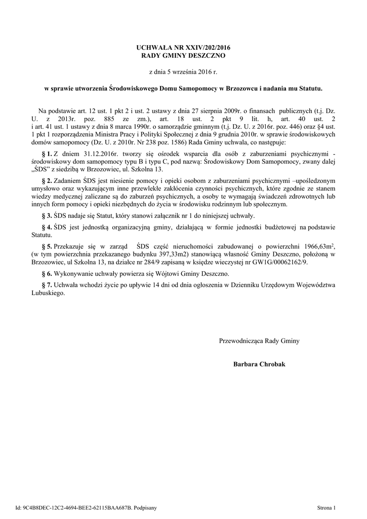 UCHWAŁA NR XXIV/202/2016 RADY GMINY DESZCZNO z dnia 5 września 2016 r. w sprawie utworzenia Środowiskowego Domu Samopomocy w Brzozowcu i nadania mu Statutu. Na podstawie art. 12 ust. 1 pkt 2 i ust. 2 ustawy z dnia 27 sierpnia 2009r. o finansach publicznych (t.j. Dz. U. z 2013r. poz. 885 ze zm.), art. 18 ust. 2 pkt 9 lit. h, art. 40 ust. 2 i art. 41 ust. 1 ustawy z dnia 8 marca 1990r. o samorządzie gminnym (t.j. Dz. U. z 2016r. poz. 446) oraz §4 ust. 1 pkt 1 rozporządzenia Ministra Pracy i Polityki Społecznej z dnia 9 grudnia 2010r. w sprawie środowiskowych domów samopomocy (Dz. U. z 2010r. Nr 238 poz. 1586) Rada Gminy uchwala, co następuje: § 1. Z dniem 31.12.2016r. tworzy się ośrodek wsparcia dla osób z zaburzeniami psychicznymi środowiskowy dom samopomocy typu B i typu C, pod nazwą: Środowiskowy Dom Samopomocy, zwany dalej „ŚDS” z siedzibą w Brzozowiec, ul. Szkolna 13. § 2. Zadaniem ŚDS jest niesienie pomocy i opieki osobom z zaburzeniami psychicznymi –upośledzonym umysłowo oraz wykazującym inne przewlekłe zakłócenia czynności psychicznych, które zgodnie ze stanem wiedzy medycznej zaliczane są do zaburzeń psychicznych, a osoby te wymagają świadczeń zdrowotnych lub innych form pomocy i opieki niezbędnych do życia w środowisku rodzinnym lub społecznym. § 3. ŚDS nadaje się Statut, który stanowi załącznik nr 1 do niniejszej uchwały. § 4. ŚDS jest jednostką organizacyjną gminy, działającą w formie jednostki budżetowej na podstawie Statutu. § 5. Przekazuje się w zarząd ŚDS część nieruchomości zabudowanej o powierzchni 1966,63m2, (w tym powierzchnia przekazanego budynku 397,33m2) stanowiącą własność Gminy Deszczno, położoną w Brzozowiec, ul Szkolna 13, na działce nr 284/9 zapisaną w księdze wieczystej nr GW1G/00062162/9. § 6. Wykonywanie uchwały powierza się Wójtowi Gminy Deszczno. § 7. Uchwała wchodzi życie po upływie 14 dni od dnia ogłoszenia w Dzienniku Urzędowym Województwa Lubuskiego. Przewodnicząca Rady Gminy Barbara Chrobak Id: 9C4B8DEC-12C2-4694-BEE2-62115BAA687B. Podpisany Strona 1 Załącznik do Uchwały Nr XXIV/202/2016 Rady Gminy Deszczno z dnia 5 września 2016 r. Statut Środowiskowego Domu Samopomocy w Brzozowcu Rozdział 1. Postanowienia ogólne § 1. Środowiskowy Dom Samopomocy w Brzozowcu, zwany dalej „ŚDS” działa na podstawie: 1) ustawy z dnia 12 marca 2004r. o pomocy społecznej (Dz. U z 2015 poz.163, z zm.), 2) ustawy z dnia 19 sierpnia 1994r. o ochronie zdrowia psychicznego (Dz. U. z 2011r. Nr 231 poz. 1375 z zm.), 3) ustawy z dnia 8 marca 1990r. o samorządzie gminnym z dnia 8 marca 1990r. (Dz. U. z 2016r. poz. 446), 4) ustawy z dnia 27 sierpnia 2009r. o finansach publicznych (Dz. U. z 2013r. poz. 885 z zm.), 5) ustawy z dnia 21 listopada 2008r. o pracownikach samorządowych (Dz. U. z 2014r. poz. 1202 z zm.), 6) ustawy z dnia 29 września 1994r. o rachunkowości (Dz. U. z 2013r. poz. 330 ze zm.), 7) Rozporządzenia Ministra Pracy i Polityki Społecznej z dnia 9 grudnia 2010r. w sprawie środowiskowych domów samopomocy (Dz. U. z 2010r. Nr 238 poz. 1586), 8) niniejszej uchwały. § 2. Środowiskowy Dom Samopomocy w Brzozowcu jest wyodrębnioną jednostką organizacyjną Gminy Deszczno powołaną w celu realizacji zadań zleconych przez administrację rządową w ramach pomocy społecznej. § 3. 1. Siedzibą ŚDS jest nieruchomość stanowiąca własność Gminy Deszczno, położona w Brzozowcu przy ul. Szkolna 13, która przekazuje się ŚDS w Brzozowcu w zarząd. 2. ŚDS w Brzozowcu zostanie wyposażony w mienie niezbędne do jego funkcjonowania zgodnie z funkcjonującymi w tym zakresie przepisami. 3. ŚDS w Brzozowcu używa pieczęci o treści: Środowiskowy Dom Samopomocy ul. Szkolna 13, 66-446 Brzozowiec. Rozdział . Rozdział 2. Cel i przedmiot działania ŚDS § 4. 1. ŚDS jest ośrodkiem wsparcia dla pełnoletnich osób obojga płci, mieszkańców Gminy Deszczno z zaburzeniami psychicznymi, typu B i C, tzn. dla osób upośledzonych umysłowo oraz osób wykazujących inne przewlekłe zaburzenia czynności psychicznych. 2. Do ŚDS mogą być również przyjmowani mieszkańcy spoza Gminy Deszczno pod warunkiem zawarcia Porozumienia pomiędzy organami gmin, na zasadach zawartych w ustawie z dnia 8 marca 1990r. o samorządzie gminnym. 3. W ŚDS osoby przebywają od poniedziałku do piątku, godziny pracy określa Regulamin Organizacyjny. Id: 9C4B8DEC-12C2-4694-BEE2-62115BAA687B. Podpisany Strona 1 4. Pobyt w ŚDS przyznawany jest na podstawie decyzji administracyjnej wydanej przez Kierownika Ośrodka Pomocy Społecznej w Deszcznie. 5. Zasady odpłatności za usługi świadczone przez ŚDS określają przywołane w §1 przepisy prawa. § 5. Do podstawowych zadań ŚDS należy: 1. Utrzymanie uczestników w ich naturalnym środowisku oraz rozwijanie umiejętności niezbędnych do samodzielnego życia. 2. Reprezentowanie interesów niepełnosprawnych w społeczności lokalnej oraz kształtowanie akceptującej postawy otoczenia wobec nich. 3. Dążenie do pełnej integracji społecznej osób niepełnosprawnych poprzez ich czynne i aktywne uczestnictwo w życiu politycznym, kulturalnym i społecznym w lokalnym środowisku. 4. Prowadzenie rehabilitacji społecznej i zawodowej, rozumianej jako zespół działań zmierzających do osiągnięcia przez użytkowników poprawy jakości życia, samodzielnego funkcjonowania oraz powstrzymania postępującej regresji poprzez zapewnienie wsparcia psychologicznego i terapeutycznego. 5. Rozwijanie i podtrzymywanie umiejętności wykonywanych czynności dnia codziennego, celem zapobiegania nawrotom społecznej dekompensacji. § 6. 1. W zakresie realizacji powyższych zadań ŚDS świadczy usługi w ramach indywidualnych lub zespołowych treningów samoobsługi i treningów oraz zajęć z zakresu kształtowania umiejętności społecznych polegających na nauce, rozwijaniu lub podtrzymywaniu umiejętności w zakresie dnia codziennego i funkcjon