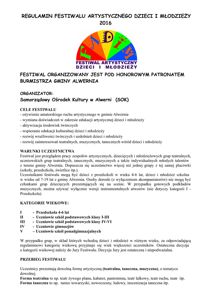 regulamin festiwalu artystycznego dzieci i młodzieży 2016