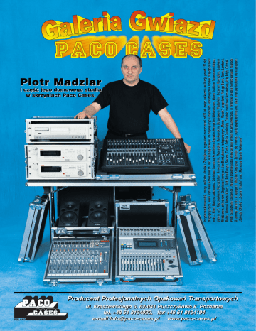 i część jego domowego studia w skrzyniach Paco Cases. Inøynier elektroakustyk, znany realizator düwiÍku. Zajmuje siÍ nagraniami muzycznymi od 25 lat, majπc na koncie realizacjÍ ponad 150 p≥yt d≥ugograjπcych, wiele transmisji koncertowych oraz realizacjÍ düwiÍku na najwiÍkszych imprezach estradowych w Polsce. WspÛ≥pracowa≥ m.in. z: Eleni, Martynπ Jakubowicz, Zdzis≥awπ Soúnickπ, Krzesimirem DÍbskim, Henrykiem Miúkiewiczem, Irkiem Dudkiem, Tadeuszem Nalepπ, Janem A.P. Kaczmarkiem, Krzysztofem Krawczykiem, Ryszardem Rynkowskim, Zbigniewem Wodeckim, Cezarym Konradem, Leszkiem Moødøerem, orkiestrami Zbigniewa GÛrnego i Alex Band, duetem fortepianowym ÑMarek i Wacekî, zespo≥ami: Vintage Band, Døem, Lombard, Bolter, Wanda i Banda, Klincz, Kult, RÛøe Europy, Savana, Turbo, Oddzia≥ ZamkniÍty. Ostatnio zrealizowa≥ koncertowπ p≥ytÍ Edyty GÛrniak. P≥yta ÑSaxophone Concertosî, nagrana przez niego dla amerykaÒskiej wytwÛrni Centaur Records, w 1998 roku zosta≥a nominowana do nagrody Grammy Awards w kategorii Muzyka Klasyczna. Zajmuje siÍ rÛwnieø publicystykπ technicznπ; pisze artyku≥y fachowe do czasopism: ÑEstrada i Studioî, ÑScena i Studioî oraz ÑMuzyczna Gazeta Reklamowaî. Piotr Madziar Producent Producent Profesjonalnych Profesjonalnych OpakowaÒ OpakowaÒ Transportowych Transportowych ul. Kraszewskiego 5, 62-041 Puszczykowo k. Poznania tel. +48 61 8194020, fax +48 61 8194194 e-mail:[email protected] www.paco-cases.pl