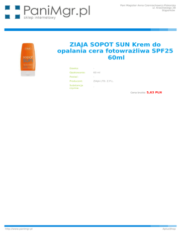 Pani Magister Anna Czerniachowicz-Piskorska ul. Krasińskiego 2B Stąporków ZIAJA SOPOT SUN Krem do opalania cera fotowrażliwa SPF25 60ml Dawka: - Opakowanie: 60 ml Postać: - Producent: ZIAJA LTD. Z.P.L. Substancja czynna: Cena brutto: http://www.panimgr.pl 5,63 PLN AptusShop