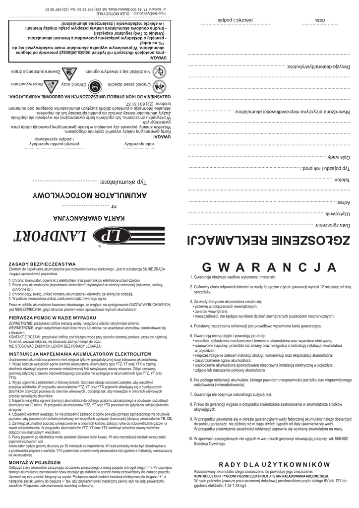 Importer/Dystrybutor: OLEK MOTOCYKLE ul. Szklana 17, 43-300 Bielsko-Biała, tel: (33) 497 95 50, fax: (33) 497 95 51 ........................... data ................................................... pieczęć i podpis .......................................................................................................................... UWAGA! - przy postojach dłuższych niż tydzień należy odłączyć przewody od bieguna akumulatora. W przeciwnym wypadku akumulator może rozładowywać się do 1% na dobę! - pamiętaj o dokładnym połączeniu przewodów z klemami akumulatora. (Uratuje to Twój regulator napięcia!) - brudna obudowa akumulatora ułatwia przepływ prądu między klemami i w efekcie rozładowanie i zasiarczenie akumulatora! Decyzja dealera/dystrybutora: ......................................................................... Nie zbliżać się z otwartym ogniem Zawiera substancje żrące .......................................................................................................................... Chronić przed dziećmi Grozi wybuchem Chronić oczy .......................................................................................................................... OBJAŚNIENIA DO IKON SYMBOLI UMIESZCZONYCH NA OBUDOWIE AKUMULATORA: .......................................................................................................................... Stwierdzona przyczyna nieprawidłowości akumulatora: .................................. .......................................................................................................................... .......................................................................................................................... .......................................................................................................................... ........................... ................................................... data sprzedaży pieczęć punktu sprzedaży i podpis sprzedawcy UWAGA! Kartę gwarancyjną należy wypełnić czytelnie długopisem. Wszelkie zmiany, poprawki czy usunięcia w karcie gwarancyjnej powodują utratę praw gwarancyjnych. W przypadku zniszczenia, lub zgubienia karty gwarancyjnej nie wystawia się duplikatu. Zużyty akumulator należy zwrócić do punktu sprzedaży lub do importera. Aktualne informacje o punktach zbiórki zużytych akumulatorów dostępne pod numerem telefonu: (22) 631 31 37. Opis wady: ....................................................................................................... Typ pojazdu i rok prod.: ................................................................................... Typ akumulatora: ...................................... Telefon: ............................................................................................................ AKUMULATOR MOTOCYKLOWY .......................................................................................................................... LANDPORT PIERWSZA POMOC W RAZIE WYPADKU ZEWNĘTRZNIE: przepłukać obficie bieżącą wodą, nasączoną odzież natychmiast zmienić, WEWNĘTRZNIE: wypić natychmiast duże ilości wody lub mleka, nie wywoływać wymiotów, skontaktować się z lekarzem, KONTAKT Z OCZAMI: przepłukać obficie pod bieżącą wodą przy szeroko otwartej powiece, przez co najmniej 15 minut, wezwać lekarza, nie stosować żadnych kropli do oczu, NIE STOSOWAĆ ŻADNYCH LEKÓW BEZ PORADY LEKARZA. INSTRUKCJA NAPEŁNIANIA AKUMULATORÓW ELEKTROLITEM Uruchomienie akumulatora powinno mieć miejsce tylko w specjalistycznej stacji ładowania akumulatorów. 1. Wyjąć korki ze wszystkich ogniw (komór) akumulatora. Akumulatory typu YTZ, YT oraz YTX w czarnej obudowie otworzyć poprzez zerwanie metalizowanej folii zamykającej otwory wlewowe. Zdjąć czerwoną gumową zatyczkę z zaworu odpowietrzającego (zatyczka nie występuje w akumulatorach typu YTZ, YT oraz YTX). 2. Wyjąć pojemnik z elektrolitem z foliowej torebki. Ostrożnie obciąć końcówki zakrętek, aby umożliwić przepływ elektrolitu. W przypadku akumulatorów YTZ, YT oraz YTX pojemnik składający się z 6 połączonych zbiorników przyłożyć pionowo do otworów wlewowych , docisnąć tak, aby krawędzie w otworach wlewowych przebiły zamknięcia zbiorników. 3. Napełnić wszystkie ogniwa (komory) akumulatora do dolnego poziomu zaznaczonego a obudowie, pozostawić akumulator na 10 minut. W przypadku akumulatorów YTZ, YT oraz YTX poczekać do spłynięcia całości elektrolitu do ogniw. 4. Uzupełnić elektrolit uważając, by nie przepełnić żadnego z ogniw powyżej górnego zaznaczonego na obudowie poziomu i aby poziom był możliwie jednakowy we wszystkich ogniwach (komorach) (dotyczy akumulatorów YB, CB). 5. Zamknąć akumulator poprzez umiejscowienie w otworach korków. Założyć rurkę do odpowietrzania gazów na zawór odpowietrzenia. W przypadku akumulatorów YTZ, YT oraz YTX zamknąć szczelnie otwory wlewowe dołączonym elastycznym wieczkiem. 6. Pusty pojemnik po elektrolicie może zawierać śladowe ilości kwasu. W celu neutralizacji resztek kwasu zalać pojemnik roztworem soli. Akumulator będzie gotowy do pracy po 30 minutach od napełnienia. W razie potrzeby może być doładowywany z prostownika prądem o wartości 1/10 pojemności znamionowej akumulatora lub zgodnie z instrukcją umieszczoną na akumulatorze. MONTAŻ W POJEŹDZIE Odłączyć stary akumulator zaczynając od zacisku połączonego z masą pojazdu (na ogół biegun “-”). Po usunięciu starego akumulatora zainstalować nowy mocując go stabilnie w sposób trwały przewidziany dla danego pojazdu. Upewnić się czy zaciski i bieguny są czyste. Podłączyć zacisk dodatni instalacji elektrycznej do bieguna “+”, a następnie zacisk ujemny do bieguna “-” tak, aby zagwarantować metaliczny pewny styk na całej powierzchni zacisków. Połączenia zakonserwować wazeliną techniczną. ZGŁOSZENIE REKLAMACJI K