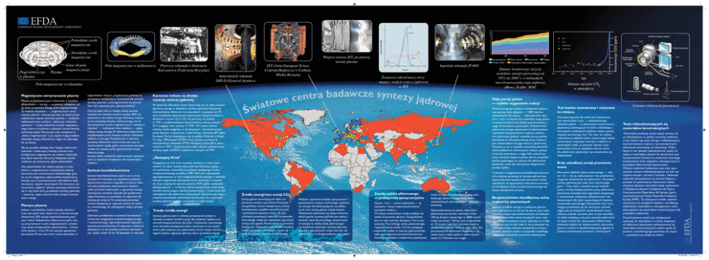 JET (1997) 11 10 9 8 7 6 5 4 3 2 1 0 Q≈0.64 Fusion power (MW) Toroidalne cewki magnetyczne Prąd elektryczny w plazmie Plazma Linie sił pola magnetycznego Pole magnetyczne w stellaratorze Pierwszy tokamak w Instytucie Kurczatowa (Federacja Rosyjska) Amerykański tokamak DIII-D (General Atomics) Plazma utrzymywana jest w komorze o kształcie obwarzanka — torusa — w pewnej odległości od jej ścian za pomocą silnego pola magnetycznego. Ta metoda nazywana — „magnetycznym utrzymaniem plazmy” wkorzystuje fakt, że elektrycznie naładowane cząstki tworzące plazmę — dodatnio naładowane jony wodoru i elektrony o ładunku ujemnym — krążą wokół linii sił pola magnetycznego, które w komorze o kształcie torusa tworzą zamknięte pętle. Plazma jest więc uwięziona w „klatce magnetycznej” a jej cząstki mogą przebiec dziesiątki tysięcy kilometrów nigdy nie zderzając sie ze ścianą. Na tej zasadzie działają dwa rodzaje reaktorów: tokamaki i stellaratory. Istnieją również inne konfiguracje magnetyczne np. reaktor zwierciadlany bądź tokamak sferyczny. Najlepsze wyniki uzyskano jak dotąd przy użyciu tokamaków. Aby doprowadzić do reakcji syntezy w urządzeniu z magnetycznym utrzymaniem plazmy konieczne jest zastosowanie dodatkowego grzania aż do osiągnięcia odpowiedniej temperatury. Stosuje się tu promieniowanie mikrofalowe bądź strumienie cząstek neutralnych. Od momentu zainicjowania „zapłonu” plazmy zaczynają wytwarzać się w niej duże ilości produktów syntezy jądrowej – neutrony i jądra atomów helu, niosące znaczne ilości energii. Płonąca plazma Jednym z produktów reakcji syntezy deuteru i trytu jest jądro helu. Unosi ono w formie energii kinetycznej 20% energii wyprodukowanej podczas reakcji. Naładowane elektrycznie jądra helu są utrzymywane w polu magnetycznym i przekazują swoją energię paliwu plazmowemu - mieszaninie deuteru i trytu. W ten sposób ogrzewane jest paliwo. Proces ten, który może zachodzić w energy_pl.indd 1 odpowiednio dużych urządzeniach, pozwala na utrzymanie temperatury koniecznej dla procesu syntezy poprzez „samoogrzewanie się plazmy”. Stan taki nazywany jest „płonącą plazmą”. Oprócz jądra helu w każdej reakcji syntezy wyzwala się również neutron niosący 80% wyzwolonej w tej reakcji energii. Ponieważ neutrony nie posiadają ładunku elektrycznego, nie są zatrzymywane w polu magnetycznym i wnikają w „blanket” — wyłożenie ścian reaktora — gdzie oddają swoją energię. W elektrowni plazmowej przepływające przez blanket medium chłodzące odbiera tę energię. Podobnie jak w konwencjonalnej elektrowni dostarczana jest ona do wymienników ciepła, gdzie wytwarzana jest para wodna do napędu turbin generatorów prądu elektrycznego. Istnieje także możliwość zastosowania uzyskiwanych tu wysokich temperatur do wytwarzania wodoru. Synteza bezwładnościowa Synteza bezwładnościowa opiera się na innej zasadzie. W metodzie tej wypełniona paliwem deuterowo-trytowym kapsułka o średnicy kilku mm jest poddawana impulsowemu działaniu wielu promieni laserowych o ogromnej energii. Zewnętrzna warstwa kapsułki jest gwałtownie odparowywana, co powoduje, że ogromne siły ściskają jej wnętrze. Ta kompresja powoduje wzrost temperatury i gęstości paliwa do poziomu koniecznego do wystąpienia reakcji syntezy jądrowej. Głównym problemem w syntezie bezwładnościowej jest osiągnięcie wysokoenergetycznego i równomiernego napromieniowania kapsułek z wysoką powtarzalnością. W typowym reaktorze działającym na tej zasadzie powinno ogrzewać się i spalać około 10 do 20 kapsułek na sekundę. Kamienie milowe na drodze rozwoju syntezy jądrowej W ostatnich kilkunastu latach obserwuje się na całym świecie ogromny postęp w dziedzinie syntezy jądrowej. Pozytywne doświadczenia dokonane na tokamakach z początku lat 70tych umożliwiły zaplanowanie pierwszych eksperymentów z deuterem i trytem (D-T). Po raz pierwszy na świecie w 1991 r. przeprowadzono kontrolowaną reakcję syntezy D-T osiągając moc syntezy 1,7 MW. Ten ważny kamień milowy został osiągnięty w zbudowanym i eksploatowanym przez fizyków i inżynierów z całej Europy tokamaku JET (Joint European Torus) znajdującym się w pobliżu Oxfordu w Anglii. W roku 1994 ponad 10 MW mocy syntezy uzyskano w amerykańskim tokamaku TFTR. Następny sukces JET-a zanotowano w 1997 r., kiedy to przez kilka sekund uzyskano moc syntezy rzędu 10 MW z maksimum równym 16 MW. JET (Joint European Torus), Centrum Badawcze w Culham, Wielka Brytania JET (1997) 5 0 0 1.0 2.0 3.0 4.0 5.0 6.0 Trwałe źródło energii Synteza jądrowa jest w dalszej perspektywie jednym z niewielu trwałych źródeł energii dla ludzkości. Spełnia ona warunki bezpieczeństwa dla ludzi i środowiska naturalnego oraz szerokiej dostępności paliw i pewności w ich uzyskiwaniu. Jeśli zostanie ona opanowana, wraz z innymi technologiami będzie odgrywać główną rolę w produkcji energii. Emisja gazów powodujących efekt cieplarniany zmienia nasz klimat. Powoduje ona globalny wzrost temperatury, zmiany intensywności opadów atmosferycznych i podniesienie poziomu mórz. W celu uniknięcia poważnych zaburzeń środowiska naturalnego należy jak najszybciej ograniczyć emisję tych gazów. Konieczne są tu zarówno krótko, jak i długookresowe środki zaradcze. Limity ustalone w protokole z Kyoto są tylko pierwszym krokiem na tej drodze. Ważnym czynnikiem będzie opracowanie i zastosowanie nowych technologii uzyskiwania energii charakteryzujących się zbliżoną do zera emisją gazów cieplarnianych. Elektrownie plazmowe nie będą emitować takich gazów: synteza jądrowa jest jedną z niewielu opcji dla przyszłego zaopatrzenia w energię na wielką skalę. Jeżeli programy badawcze dotyczące syntezy jądrowej zakończą się sukcesem, może ona stać się użyteczną już w drugiej połowie tego wieku. South Pole 320 1990