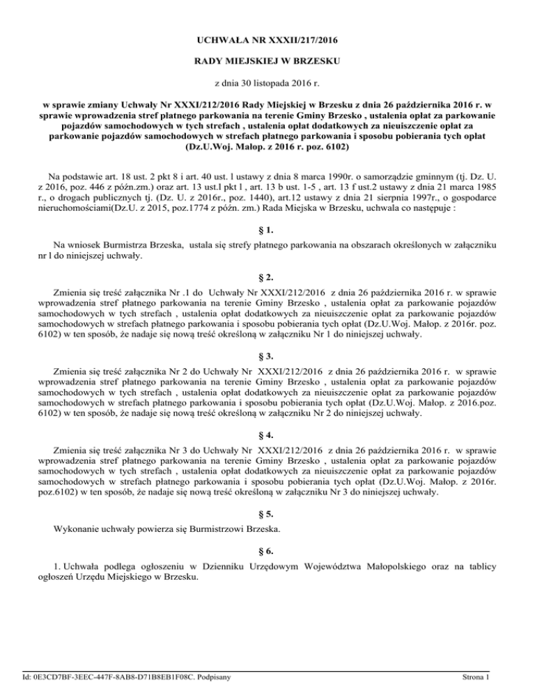 UCHWAŁA NR XXXII/217/2016 RADY MIEJSKIEJ W BRZESKU z dnia 30 listopada 2016 r. w sprawie zmiany Uchwały Nr XXXI/212/2016 Rady Miejskiej w Brzesku z dnia 26 października 2016 r. w sprawie wprowadzenia stref płatnego parkowania na terenie Gminy Brzesko , ustalenia opłat za parkowanie pojazdów samochodowych w tych strefach , ustalenia opłat dodatkowych za nieuiszczenie opłat za parkowanie pojazdów samochodowych w strefach płatnego parkowania i sposobu pobierania tych opłat (Dz.U.Woj. Małop. z 2016 r. poz. 6102) Na podstawie art. 18 ust. 2 pkt 8 i art. 40 ust. l ustawy z dnia 8 marca 1990r. o samorządzie gminnym (tj. Dz. U. z 2016, poz. 446 z późn.zm.) oraz art. 13 ust.l pkt l , art. 13 b ust. 1-5 , art. 13 f ust.2 ustawy z dnia 21 marca 1985 r., o drogach publicznych tj. (Dz. U. z 2016r., poz. 1440), art.12 ustawy z dnia 21 sierpnia 1997r., o gospodarce nieruchomościami(Dz.U. z 2015, poz.1774 z późn. zm.) Rada Miejska w Brzesku, uchwala co następuje : § 1. Na wniosek Burmistrza Brzeska, ustala się strefy płatnego parkowania na obszarach określonych w załączniku nr l do niniejszej uchwały. § 2. Zmienia się treść załącznika Nr .1 do Uchwały Nr XXXI/212/2016 z dnia 26 października 2016 r. w sprawie wprowadzenia stref płatnego parkowania na terenie Gminy Brzesko , ustalenia opłat za parkowanie pojazdów samochodowych w tych strefach , ustalenia opłat dodatkowych za nieuiszczenie opłat za parkowanie pojazdów samochodowych w strefach płatnego parkowania i sposobu pobierania tych opłat (Dz.U.Woj. Małop. z 2016r. poz. 6102) w ten sposób, że nadaje się nową treść określoną w załączniku Nr 1 do niniejszej uchwały. § 3. Zmienia się treść załącznika Nr 2 do Uchwały Nr XXXI/212/2016 z dnia 26 października 2016 r. w sprawie wprowadzenia stref płatnego parkowania na terenie Gminy Brzesko , ustalenia opłat za parkowanie pojazdów samochodowych w tych strefach , ustalenia opłat dodatkowych za nieuiszczenie opłat za parkowanie pojazdów samochodowych w strefach płatnego parkowania i sposobu pobierania tych opłat (Dz.U.Woj. Małop. z 2016.poz. 6102) w ten sposób, że nadaje się nową treść określoną w załączniku Nr 2 do niniejszej uchwały. § 4. Zmienia się treść załącznika Nr 3 do Uchwały Nr XXXI/212/2016 z dnia 26 października 2016 r. w sprawie wprowadzenia stref płatnego parkowania na terenie Gminy Brzesko , ustalenia opłat za parkowanie pojazdów samochodowych w tych strefach , ustalenia opłat dodatkowych za nieuiszczenie opłat za parkowanie pojazdów samochodowych w strefach płatnego parkowania i sposobu pobierania tych opłat (Dz.U.Woj. Małop. z 2016r. poz.6102) w ten sposób, że nadaje się nową treść określoną w załączniku Nr 3 do niniejszej uchwały. § 5. Wykonanie uchwały powierza się Burmistrzowi Brzeska. § 6. 1. Uchwała podlega ogłoszeniu w Dzienniku Urzędowym Województwa Małopolskiego oraz na tablicy ogłoszeń Urzędu Miejskiego w Brzesku. Id: 0E3CD7BF-3EEC-447F-8AB8-D71B8EB1F08C. Podpisany Strona 1 2. Uchwała wchodzi w życie po upływie 14 dni od ogłoszenia w Dzienniku Urzędowym Województwa Małopolskiego. Przewodniczący Rady Miejskiej w Brzesku mgr Krzysztof Ojczyk Id: 0E3CD7BF-3EEC-447F-8AB8-D71B8EB1F08C. Podpisany Strona 2 Załącznik Nr 1 do Uchwały Nr XXXII/217/2016 Rady Miejskiej w Brzesku z dnia 30 listopada 2016 r. Obszary na których wprowadza się strefę płatnego parkowania na terenie Gminy/Miasta Brzesko. L.p. 1 2 3 4 5 6 7 8 9 10 11 12 13 14 15 16 17 18 19 20 21 22 23 Lokalizacja (ulica, plac) nr. działki Asnyka Berka Joselewicza Chopina Cicha Długa Grunwaldzka Józefa Piłsudskiego Legionów Piłsudskiego Matejki Kościuszki (od skrzyżowania z ul. Słowackiego do posesji Nr 51- strona północna włącznie i od skrzyżowania z ul. Wyzwolenia do posesji Nr 56- strona południowa włącznie) Krótka Plac Targowy (stary) Plac Zwycięstwa Plac Żwirki i Wigury Plac Kazimierza Wielkiego ( za Domem Nauczyciela) Plac przy Parafii Najświętszej Marii Panny Matki Kościoła i Św. Jakuba Apostoła ( od ul. Uczestników Ruchu Oporu ) Sienkiewicza od skrzyżowania z ul. Długą do skrzyżowania z ul. T. Kościuszki Słowackiego Sobieskiego Wyszyńskiego Puszkina Władysława Jagiełły Zielona 24 Powstańców Warszawy- w części ulicy od ul. Solskiego do skrzyżowania z ul. Mościckiego 25 Plac naprzeciwko Urzędu Miasta przy ul. Głowackiego od strony północnej ( naprzeciwko skrzyżowania ul. Głowackiego z ul. Nową) 26 Parking przy ul. Głowackiego (naprzeciwko marketu budowlanego „Śnieżka”) Plac parkingowy przy Nowym Placu Targowym- jedna godzina bezpłatna na dobę dla jednego pojazdu 27 (wpisanie nr rej. pojazdu w parkometrze). Plac parkingowy przy ul. Mościckiego- jedna godzina bezpłatna na dobę dla jednego pojazdu (wpisanie nr. 28 rej. pojazdu w parkometrze). Id: 0E3CD7BF-3EEC-447F-8AB8-D71B8EB1F08C. Podpisany Strona 1 Przewodniczący Rady Miejskiej w Brzesku mgr Krzysztof Ojczyk Id: 0E3CD7BF-3EEC-447F-8AB8-D71B8EB1F08C. Podpisany Strona 2 Załącznik Nr 2 do Uchwały Nr XXXII/217/2016 Rady Miejskiej w Brzesku z dnia 30 listopada 2016 r. Wysokość opłat za parkowanie pojazdów samochodowych w strefach płatnego parkowania oraz zasady korzystania z miejsc postojowych w tych strefach. 1. Opłaty pobiera się w dni robocze od poniedziałku do piątku w godzinach od 9:00 do 17:00 2. Wysokość opłat: a.za pierwsze rozpoczęte 30 minut parkowania – 1,00zł b.za pierwszą rozpoczętą godzinę parkowania – 2,00zł c.za każde kolejne 30 minut parkowania – 1,00zł d.opłata dzienna 10,00zł e.za miesięczną kartę abonamentową dla pojazdu oznaczoną literą „A” - 75,00zł f.za miesięczną kartę abonamentową dla pojazdów mieszkańców zameldowanych na pobyt stały w Strefie Płatnych Parkingów mających zarejestrowany samochód na własne nazwisko oznaczoną literą „M” - 10,00zł g.za miesięczną kartę abonamentową dla pojazdów osób n