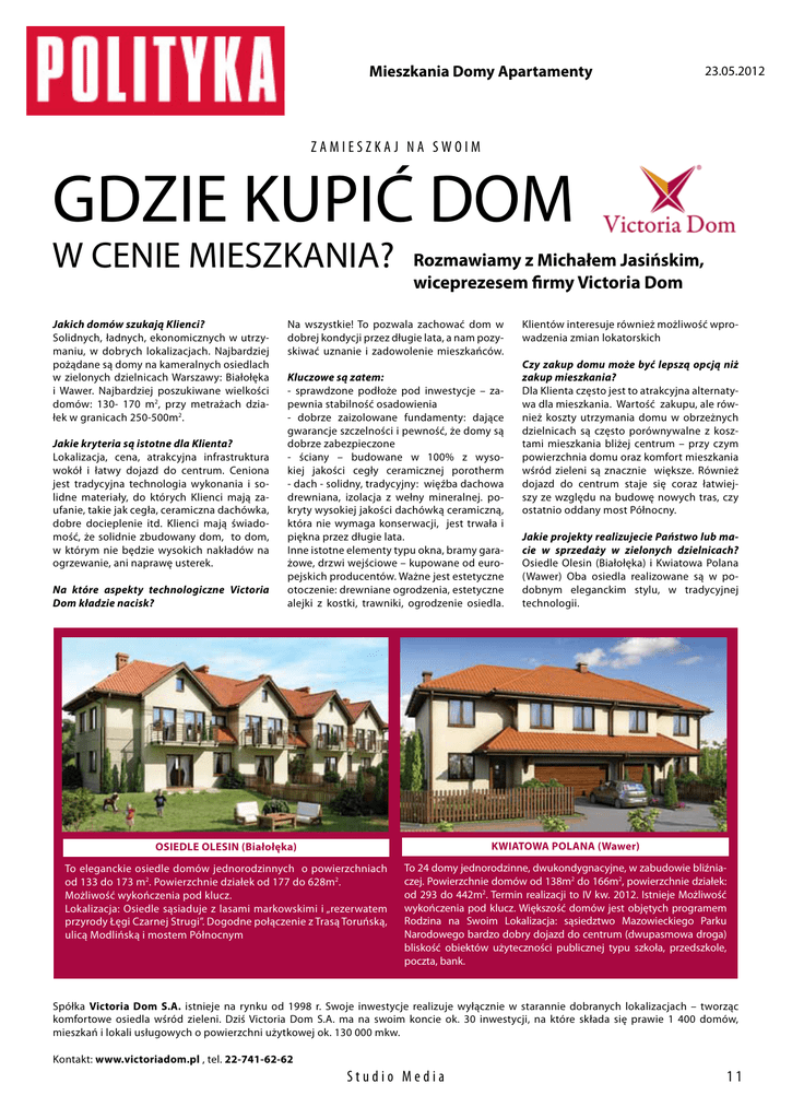 Mieszkania Domy Apartamenty 23.05.2012 ZAMIESZKAJ NA SWOIM GDZIE KUPIĆ DOM W CENIE MIESZKANIA? Jakich domów szukają Klienci? Solidnych, ładnych, ekonomicznych w utrzymaniu, w dobrych lokalizacjach. Najbardziej pożądane są domy na kameralnych osiedlach w zielonych dzielnicach Warszawy: Białołęka i Wawer. Najbardziej poszukiwane wielkości domów: 130- 170 m2, przy metrażach działek w granicach 250-500m2. Jakie kryteria są istotne dla Klienta? Lokalizacja, cena, atrakcyjna infrastruktura wokół i łatwy dojazd do centrum. Ceniona jest tradycyjna technologia wykonania i solidne materiały, do których Klienci mają zaufanie, takie jak cegła, ceramiczna dachówka, dobre docieplenie itd. Klienci mają świadomość, że solidnie zbudowany dom, to dom, w którym nie będzie wysokich nakładów na ogrzewanie, ani naprawę usterek. Na które aspekty technologiczne Victoria Dom kładzie nacisk? Rozmawiamy z Michałem Jasińskim, wiceprezesem firmy Victoria Dom Na wszystkie! To pozwala zachować dom w dobrej kondycji przez długie lata, a nam pozyskiwać uznanie i zadowolenie mieszkańców. Kluczowe są zatem: - sprawdzone podłoże pod inwestycje – zapewnia stabilność osadowienia - dobrze zaizolowane fundamenty: dające gwarancje szczelności i pewność, że domy są dobrze zabezpieczone - ściany – budowane w 100% z wysokiej jakości cegły ceramicznej porotherm - dach - solidny, tradycyjny: więźba dachowa drewniana, izolacja z wełny mineralnej. pokryty wysokiej jakości dachówką ceramiczną, która nie wymaga konserwacji, jest trwała i piękna przez długie lata. Inne istotne elementy typu okna, bramy garażowe, drzwi wejściowe – kupowane od europejskich producentów. Ważne jest estetyczne otoczenie: drewniane ogrodzenia, estetyczne alejki z kostki, trawniki, ogrodzenie osiedla. Klientów interesuje również możliwość wprowadzenia zmian lokatorskich Czy zakup domu może być lepszą opcją niż zakup mieszkania? Dla Klienta często jest to atrakcyjna alternatywa dla mieszkania. Wartość zakupu, ale również koszty utrzymania domu w obrzeżnych dzielnicach są często porównywalne z kosztami mieszkania bliżej centrum – przy czym powierzchnia domu oraz komfort mieszkania wśród zieleni są znacznie większe. Również dojazd do centrum staje się coraz łatwiejszy ze względu na budowę nowych tras, czy ostatnio oddany most Północny. Jakie projekty realizujecie Państwo lub macie w sprzedaży w zielonych dzielnicach? Osiedle Olesin (Białołęka) i Kwiatowa Polana (Wawer) Oba osiedla realizowane są w podobnym eleganckim stylu, w tradycyjnej technologii. OSIEDLE OLESIN (Białołęka) KWIATOWA POLANA (Wawer) To eleganckie osiedle domów jednorodzinnych o powierzchniach od 133 do 173 m2. Powierzchnie działek od 177 do 628m2. Możliwość wykończenia pod klucz. Lokalizacja: Osiedle sąsiaduje z lasami markowskimi i „rezerwatem przyrody Łęgi Czarnej Strugi”. Dogodne połączenie z Trasą Toruńską, ulicą Modlińską i mostem Północnym To 24 domy jednorodzinne, dwukondygnacyjne, w zabudowie bliźniaczej. Powierzchnie domów od 138m2 do 166m2, powierzchnie działek: od 293 do 442m2. Termin realizacji to IV kw. 2012. Istnieje Możliwość wykończenia pod klucz. Większość domów jest objętych programem Rodzina na Swoim Lokalizacja: sąsiedztwo Mazowieckiego Parku Narodowego bardzo dobry dojazd do centrum (dwupasmowa droga) bliskość obiektów użyteczności publicznej typu szkoła, przedszkole, poczta, bank. Spółka Victoria Dom S.A. istnieje na rynku od 1998 r. Swoje inwestycje realizuje wyłącznie w starannie dobranych lokalizacjach – tworząc komfortowe osiedla wśród zieleni. Dziś Victoria Dom S.A. ma na swoim koncie ok. 30 inwestycji, na które składa się prawie 1 400 domów, mieszkań i lokali usługowych o powierzchni użytkowej ok. 130 000 mkw. Kontakt: www.victoriadom.pl , tel. 22-741-62-62 Studio Media 11