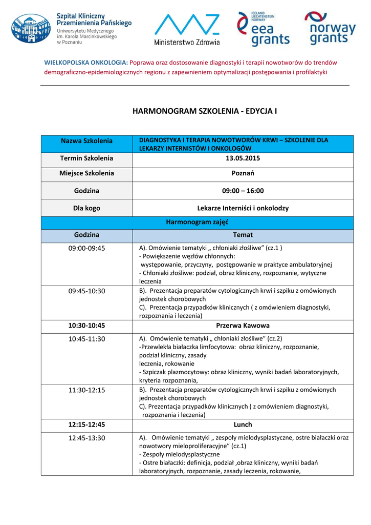 WIELKOPOLSKA ONKOLOGIA: Poprawa oraz dostosowanie diagnostyki i terapii nowotworów do trendów demograficzno-epidemiologicznych regionu z zapewnieniem optymalizacji postępowania i profilaktyki HARMONOGRAM SZKOLENIA - EDYCJA I Nazwa Szkolenia DIAGNOSTYKA I TERAPIA NOWOTWORÓW KRWI – SZKOLENIE DLA LEKARZY INTERNISTÓW I ONKOLOGÓW Termin Szkolenia 13.05.2015 Miejsce Szkolenia Poznań Godzina 09:00 – 16:00 Dla kogo Lekarze Interniści i onkolodzy Harmonogram zajęć Godzina 09:00-09:45 09:45-10:30 10:30-10:45 10:45-11:30 11:30-12:15 Temat A). Omówienie tematyki „ chłoniaki złośliwe” (cz.1 ) - Powiększenie węzłów chłonnych: występowanie, przyczyny, postępowanie w praktyce ambulatoryjnej - Chłoniaki złośliwe: podział, obraz kliniczny, rozpoznanie, wytyczne leczenia B). Prezentacja preparatów cytologicznych krwi i szpiku z omówionych jednostek chorobowych C). Prezentacja przypadków klinicznych ( z omówieniem diagnostyki, rozpoznania i leczenia) Przerwa Kawowa A). Omówienie tematyki „ chłoniaki złośliwe” (cz.2) -Przewlekła białaczka limfocytowa: obraz kliniczny, rozpoznanie, podział kliniczny, zasady leczenia, rokowanie - Szpiczak plazmocytowy: obraz kliniczny, wyniki badań laboratoryjnych, kryteria rozpoznania, B). Prezentacja preparatów cytologicznych krwi i szpiku z omówionych jednostek chorobowych C). Prezentacja przypadków klinicznych ( z omówieniem diagnostyki, rozpoznania i leczenia) 12:15-12:45 Lunch 12:45-13:30 A). Omówienie tematyki „ zespoły mielodysplastyczne, ostre białaczki oraz nowotwory mieloproliferacyjne” (cz.1) - Zespoły mielodysplastyczne - Ostre białaczki: definicja, podział ,obraz kliniczny, wyniki badań laboratoryjnych, rozpoznanie, zasady leczenia, rokowanie, 13:30-14:15 B). Prezentacja preparatów cytologicznych krwi i szpiku z omówionych jednostek chorobowych C). Prezentacja przypadków klinicznych ( z omówieniem diagnostyki, rozpoznania i leczenia B). Prezentacja preparatów cytologicznych krwi i szpiku z omówionych jednostek chorobowych C). Prezentacja przypadków klinicznych ( z omówieniem diagnostyki, rozpoznania i leczenia) 14:15-14:30 Przerwa kawowa 14:30-15:15 A). Omówienie tematyki „ Zespoły mielodysplastyczne, ostre białaczki oraz nowotwory mieloproliferacyjne” (cz.2) -Nowotwory mieloproliferacyjne -Przewlekła białaczka szpikowa : obraz kliniczny, rozpoznanie, zasady leczenia, rokowanie, - Czerwienica prawdziwa, osteomielofibroza, nadpłytkowość samoistna: obraz kliniczny, kryteria rozpoznania i różnicowania, zasady leczenia, rokowanie 15:15-16:00 B). Prezentacja preparatów cytologicznych krwi i szpiku z omówionych jednostek chorobowych C). Prezentacja przypadków klinicznych ( z omówieniem diagnostyki, rozpoznania i leczenia nasze obiekty: ul. Długa 1/2, ul. Szamarzewskiego 82/84, Osiedle Rusa 55 tel. centrala: 61 854 90 00, tel. sekretariat: 61 854 91 21, fax. 61 852 94 72 www.skpp.edu.pl, e-mail: [email protected] BIURO PROJEKTU: Szamarzewskiego 82/84, 60-569 Poznań, tel. (61) 854 95 65, e-mail: [email protected] Nr konta: Bank Handlowy w Warszawie SA Oddział w Poznaniu - 45 1030 1247 0000 0000 0663 3072