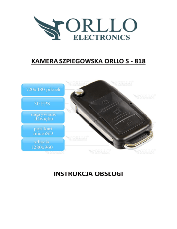 KAMERA SZPIEGOWSKA ORLLO S - 818 INSTRUKCJA OBSŁUGI Po pierwsze, dziękujemy za korzystanie z produktów naszej firmy! Proszę przeczytać instrukcję przed użyciem, pozwoli to na właściwe korzystanie z naszego produktu. W celu lepszego serwisu, instrukcja obsługi może ulec zmianie. Pozdrawiamy, zespół Orllo. Opis: Ten produkt jest wysokiej rozdzielczości aparatem cyfrowym z detekcją ruchu i wyposażonym w gniazdo na kartę pamięci. Ten produkt jest prosty w użyciu, elegancki i praktyczny, łatwy w transporcie dzięki czemu możemy mieć naszą kamerkę szpiegowską zawsze przy sobie! Gdy urządzenie jest wyłączone należy włożyć kartę rozszerzeń micro SD. Od tego momentu jest możliwe zapisywanie zarejestrowanych przez nas plików. Użycie: Przed użyciem należy zamontować kartę Micro SD w slocie karty Micro SD[5]. Aby zamontowanie karty było możliwe należy wcisnąć przycisk otwierania klucza[1], tak samo należy postępować jeżeli chcemy zresetować urządzenie[4] albo podłączyć naszą kamerkę do komputera lub ładowania za pomocą portu USB[3]. Należy pamiętać aby przed pierwszym użyciem naładować baterię. Służy do tego kabel USB (znajdujący się w zestawie), który podłączamy do portu USB[3], a następnie do komputera bądź ładowarki. Po naładowaniu baterii możemy uruchomić naszą kamerkę. Służy do tego przycisk on/off[9]. Jeśli chcemy przełączać między dostępnymi w urządzeniu trybami, służy do tego przycisk kamera-aparat[7] oraz przycisk detektora ruchu[8], który umożliwia automatyczne rozpoczęcie nagrywania po wykryciu ruchu przez obiektyw. [6].Aby rozpocząć nagrywanie należy włączyć kamerkę przyciskiem on/off[9], a następnie wcisnąć i przytrzymać przycisk kamera-aparat[7]. Żeby zrobić zdjęcie należy włączyć kamerkę a następnie wcisnąć przycisk on/off. Nagrywanie za pomocą detektora ruchu odbywa się podobnie jak w przypadku klasycznego nagrywania, z tą różnicą, że po ok. 2 minutach jeśli urządzenie nie wykryje ruchu przechodzi w stan uśpienia aby poprzez wykrycie ruchu aktywować się i kontynuować zapis. Dioda LED: - Podczas ładowania: miga na zmianę czerwona oraz niebieska dioda. - Gdy urządzenie jest włączone zapalona jest czerwona dioda. - Podczas robienia zdjęcia czerwona dioda gaśnie i na nowo się zapala. - Gdy rozpoczynamy nagrywanie niebieska dioda zaczyna migać. Gdy nagrywany jest obraz dioda nie świeci, ma to na celu dyskretne i nie rzucające się w oczy nagrywanie. - Urządzenie wyłącza się po kilkukrotnym mignięciu niebieskiej diody. Podobnie jak w przypadku nagrywaniu filmów, z tą różnicą, że do wyłączenia urządzenia używamy przycisku on/off. Parametry: Właściwości Format Video Kodowanie Video rozdzielczość Video Klatek Video Program do odtwarzania Format obrazu Zdjęcia Współczynnik obrazu System wsparcia Pojemność akumulatora Czas pracy Napięcie ładowania Interfejs systemu Opis Avi M-JPEG 640 * 480, 720 * 480, 1280 * 960VGA 30fps Obsługujący format .avi (Domyślny w każdym systemie operacyjnym). JPG 1280 * 960 5Mpix 4:3 Windows me/2000 XP 2003/vista: M 300mAh Około 90 minut DC-5V Mini USB Gniazdo kart pamięci Typ baterii Micro SD Duża pojemność litowo-polimerowa Uwagi: Użycie: Należy ściśle przestrzegać odpowiednich przepisów prawnych, produkt ten nie może być używany do celów niezgodnych z prawem lub niebezpiecznych. O baterii: Baterię należy zawsze ładować do pełna po poprzednim jej rozładowaniu. Zwiększa to jej żywotność. Jeżeli urządzenie jest nie używane, bateria powinna być naładowana, ponieważ rozładowana bateria po kilku dniach nieużywania może ulec uszkodzeniu. Bezpieczeństwo plików: Ten produkt nie jest profesjonalnym urządzeniem pamięci masowej, nie gwarantuje integralności pamięci wewnętrznej i bezpieczeństwa pliku, należy natychmiast przenieść plik na komputer lub inne urządzenie do przechowywania kopii zapasowych. Jakość wideo: Ten produkt nie jest profesjonalnym sprzętem wideo, nagrywanie dokumentów nie gwarantuje wyników, spełniających państwa oczekiwania. Temperatura pracy: 0-40 ° C Wilgotność: 20% - 80%, nie należy narażać na kontakt z wodą ponieważ produkt nie jest wodoodporny. Oświetlenie: Nie należy kierować kamery na słońce oraz inne silne wiązki światła w celu uniknięcia uszkodzenia. Czyszczenie: Czyścić za pomocą papierowego ręcznika lub tkaniny. Inne sprawy: Nie narażać na silne wstrząsy, silne pole magnetyczne lub elektryczne Złomowanie: Produkt utylizować w miejscu do tego przeznaczonym (odpady elektroniczne). Nie wyrzucać razem z innymi odpadami komunalnymi ze względu na ochronę środowiska. Informacje dodatkowe: Inne nieznane sprawy, prosimy o kontakt z lokalnym dystrybutorem.