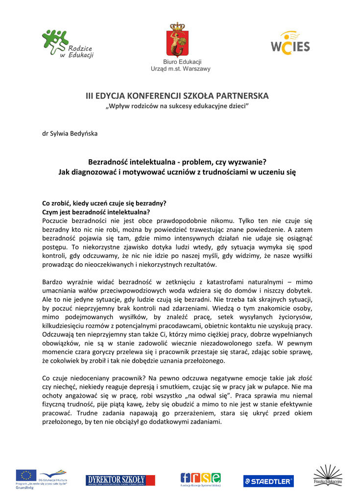Biuro Edukacji Urząd m.st. Warszawy III EDYCJA KONFERENCJI SZKOŁA PARTNERSKA „Wpływ rodziców na sukcesy edukacyjne dzieci” dr Sylwia Bedyńska Bezradność intelektualna - problem, czy wyzwanie? Jak diagnozować i motywować uczniów z trudnościami w uczeniu się Co zrobić, kiedy uczeń czuje się bezradny? Czym jest bezradność intelektualna? Poczucie bezradności nie jest obce prawdopodobnie nikomu. Tylko ten nie czuje się bezradny kto nic nie robi, można by powiedzieć trawestując znane powiedzenie. A zatem bezradność pojawia się tam, gdzie mimo intensywnych działań nie udaje się osiągnąć postępu. To niekorzystne zjawisko dotyka ludzi wtedy, gdy sytuacja wymyka się spod kontroli, gdy odczuwamy, że nic nie idzie po naszej myśli, gdy widzimy, że nasze wysiłki prowadząc do nieoczekiwanych i niekorzystnych rezultatów. Bardzo wyraźnie widać bezradność w zetknięciu z katastrofami naturalnymi – mimo umacniania wałów przeciwpowodziowych woda wdziera się do domów i niszczy dobytek. Ale to nie jedyne sytuacje, gdy ludzie czują się bezradni. Nie trzeba tak skrajnych sytuacji, by poczuć nieprzyjemny brak kontroli nad zdarzeniami. Wiedzą o tym znakomicie osoby, mimo podejmowanych wysiłków, by znaleźć pracę, setek wysyłanych życiorysów, kilkudziesięciu rozmów z potencjalnymi pracodawcami, obietnic kontaktu nie uzyskują pracy. Odczuwają ten nieprzyjemny stan także Ci, którzy mimo ciężkiej pracy, dobrze wypełnianych obowiązków, nie są w stanie zadowolić wiecznie niezadowolonego szefa. W pewnym momencie czara goryczy przelewa się i pracownik przestaje się starać, zdając sobie sprawę, że cokolwiek by zrobił i tak nie dobędzie uznania przełożonego. Co czuje niedoceniany pracownik? Na pewno odczuwa negatywne emocje takie jak złość czy niechęć, niekiedy reaguje depresją i smutkiem, czując się w pracy jak w pułapce. Nie ma ochoty angażować się w pracę, robi wszystko „na odwal się”. Praca sprawia mu niemal fizyczną trudność, pije piątą kawę, żeby się obudzić a mimo to nie jest w stanie efektywnie pracować. Trudne zadania napawają go przerażeniem, stara się ukryć przed okiem przełożonego, by ten nie obciążył go dodatkowymi zadaniami. Biuro Edukacji Urząd m.st. Warszawy Zajęcia szkolne wydają się być odległe od katastrof naturalnych, niemniej mają wiele wspólnego z sytuacją pracy. Uczeń przychodzi do szkoły codziennie i tez zmaga się z licznymi, często trudnymi zadaniami i wymaganiami nauczycieli. Choć jest „opłacany” ocenami szkolny a nie realnymi pieniędzmi, obciążenia z którymi się zmaga wcale nie są lżejsze. Gdy napotka na trudności łatwiej niż dorosły wpada w bezradność. Objawy tego poczucia są podobne jak u dorosłych. Uczeń czuje lęk, niechęć na lekcjach, próbuje ich unikać w skrajnych przypadkach wagaruje. Popełnia masę błędów na lekcjach, nie jest w stanie rozwiązać bardziej złożonych zadań czy problemów. Na lekcjach próbuje się chować za plecami kolegów, potakuje, szuka podpowiedzi, gdy musi odpowiadać przy tablicy. Uczeń bezradny nie jest mało inteligentny, czy mało zdolny. Jego bezradność widać zwykle tylko na jednym przedmiocie na przykład na matematyce. Jest w stanie logicznie myśleć, zapamiętywać materiał, wyciągać wnioski na biologii, a na matematyce traci zdrowy rozsadek i podaje jako poprawny wynik ujemną wartość obliczonego wzrostu. Czy moje dziecko jest bezradne? Jeśli zaobserwujesz u swojego dziecka następujące objawy możliwe, że to bezradność intelektualna: Dziecko czuje pustkę w głowie na lekcjach z tego przedmiotu. Dziecko w ogóle nic nie rozumie. Dziecko ma niskie oceny tylko z tego przedmiotu. Kiedyś lubiło się zajmować tym przedmiotem a teraz nie chce o nim słyszeć. Dziecko odczuwa lęk przed pójściem na lekcje. Dziecko przestało się interesować tym przedmiotem, choć wcześniej było nim zaciekawione. Dziecko rozwiązując zadania, czy problemy z tego przedmiotu robi to zupełnie bezrefleksyjnie, nie jest w stanie ocenić czy to co zrobiło jest sensowne, czy nie. Skąd bierze się bezradność? Bezradność intelektualna ma rozmaite źródła. Zwykle jest efektem nawarstwienia się drobnych trudności w zrozumieniu materiału z danego przedmiotu. Trudności te muszą być długotrwałe a więc może to być długa choroba dziecka, ale także zmiana szkoły (w poprzedniej danego materiału jeszcze nie było a w nowej już go omówiono i nauczyciel nie ma czasu, żeby pomóc). Niekiedy nauczyciele pod presją programu czy oczekiwań dyrekcji mało zrozumiale tłumaczą materiał nastawiając się głównie na zapamiętywanie treści przekazywanych na lekcjach. Czynnikiem, który może powodować bezradność ucznia jest niewłaściwy system oceny postępów dziecka. Jeśli uczeń widzi, że jest niesprawiedliwie, stronniczo oceniany to przestaje się starać bo i tak nie uzyska uznania nauczyciela. Biuro Edukacji Urząd m.st. Warszawy Co można zrobić? Najważniejsze to wcześnie zdiagnozować problem. Starajmy się rozmawiać z dzieckiem o tym, co się dzieje w szkole, zwłaszcza, gdy widać choćby lekką zmianę nastawienia do poszczególnych zajęć. Niekiedy zniechęcenie jakimś przedmiotem jest naturalne – dziecko próbuje różnych aktywności i po pewnym czasie je porzuca. To naturalne – by określić co sprawia przyjemność trzeba zacząć to robić i doświadczyć tego na własnej skórze. Stąd dzieci najpierw chodzą na zajęcia judo, potem kung fu, następnie do klubu piłkarskiego czy tenisowego. Nie należy się przejmować, gdy dziecko bardziej zaciekawia przyroda niż matematyka. Kiedy jednak słyszymy, że szkoła jest głupia, lub co gorsza, że nauczyciel jest głupi to pora by interweniować. Trzeba koniecznie dokładnie zdiagnozować problem i ustalić z jakimi zagadnieniami dziecko sobie nie radzi. Prof. Grzegorz Sędek, specjalista od bezradności w