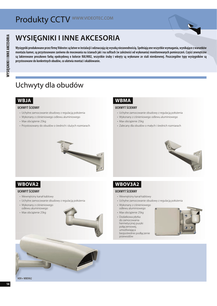 WYSIĘGNIKI I INNE AKCESORIA Produkty CCTV WWW.VIDEOTEC.COM WYSIĘGNIKI I INNE AKCESORIA Wysięgniki produkowane przez firmę Videotec są łatwe w instalacji i odznaczają się wysoką niezawodnością. Spełniają one wszystkie wymagania, wynikające z warunków montażu kamer, są przystosowane zarówno do mocowania na ścianach jak i na sufitach (w zależności od wykonania) monitorowanych pomieszczeń. Części zewnętrzne są lakierowane proszkowo farbą epoksydową o kolorze RAL9002, wszystkie śruby i wkręty są wykonane ze stali nierdzewnej. Poszczególne typy wysięgników są przystosowane do konkretnych obudów, co ułatwia montaż i okablowanie. Uchwyty dla obudów WBJA WBMA UCHWYT ŚCIENNY UCHWYT ŚCIENNY t Uchylne zamocowanie obudowy z regulacją położenia t Wykonany z ciśnieniowego odlewu aluminiowego t Max obciążenie 25kg t Przystosowany do obudów o średnich i dużych rozmiarach WBOVA2 WBOV3A2 UCHWYT ŚCIENNY UCHWYT ŚCIENNY t Wewnętrzny kanał kablowy t Uchylne zamocowanie obudowy z regulacją położenia t Wykonany z ciśnieniowego odlewu aluminiowego t Max obciążenie 25kg HOV+ WBOVA2 14 t Uchylne zamocowanie obudowy z regulacją położenia t Wykonany z ciśnieniowego odlewu aluminiowego t Max obciążenie 25kg t Zalecany dla obudów o małych i średnich rozmiarach t Wewnętrzny kanał kablowy t Uchylne zamocowanie obudowy z regulacją położenia t Wykonany z ciśnieniowego odlewu aluminiowego t Max obciążenie 25kg t Dodatkowa płytka do zamocowania hermetycznej puszki połączeniowej, umożliwiająca bezpośrednie podłączenie przewodów