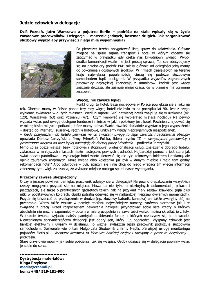 Jedzie człowiek w delegacje Dziś Poznań, jutro Warszawa a pojutrze Berlin – podróże na stałe wpisały się w życie zawodowe pracowników. Delegacja – marzenie jednych, koszmar drugich. Jak zorganizować służbowy wyjazd aby przywieść z niego miłe wspomnienia? Po pierwsze: trzeba przygotować listę spraw do załatwienia. Główne miejsce na spisie zajmie transport i hotel w którym chcemy się zatrzymać w przypadku gdy czeka nas kilkudniowy wyjazd. Wybór środka komunikacji wcale nie jest prostą sprawą. To, czy zdecydujemy się na przelot czy podróż PKP zależy głównie od odległości jaką mamy do pokonania i dostępnych środków. W firmach działających na terenie kraju największą popularnością cieszą się podróże służbowym samochodem bądź pociągami. W przypadku wyjazdów zagranicznych pracownicy najczęściej korzystają z samolotów. Podróż jest wtedy znacznie droższa, ale zajmuje mniej czasu, co w biznesie ma ogromne znaczenie. Więcej, nie zawsze lepiej Punkt drugi to hotel. Baza noclegowa w Polsce powiększa się z roku na rok. Obecnie mamy w Polsce ponad trzy razy więcej hoteli niż było to na początku lat 90. Jest z czego wybierać, zwłaszcza w dużych miastach. Według raportu GUS najwięcej hoteli znajduje się w Krakowie (ok. 120), Warszawie (63) oraz Poznaniu (47). Czym kierować się wybierając miejsce noclegu? Na pewno wypada wziąć pod uwagę dostępne fundusze i miejsce w jakim położony jest hotel. Powinien znajdować się w miarę blisko miejsca spotkania, które mamy odbyć. Warto również dokładnie wypytać o jego wyposażenie – dostęp do internetu, suszarkę, ręczniki hotelowe, unikniemy wtedy nieprzyjemnych niespodzianek. – Kiedy przyjeżdżam do hotelu pierwsze na co zwracam uwagę to jego czystość i zachowanie obsługi – opowiada Dariusz Jarczyński z firmy PrimeSoft Polska, lidera rynku IT. – sympatyczni pracownicy i przestronne wnętrza od razu lepiej nastrajają do dalszej pracy i działania – podkreśla Jarczyński. Mimo coraz obszerniejszej bazy hotelowej i stopniowej profesjonalizacji usług, znalezienie dobrego hotelu, zwłaszcza w mniejszych miastach może nastręczyć pewnych trudności. Najbardziej pomocna jest stara jak świat poczta pantoflowa – wybierając hotel warto kierować się nie tyle kolorowym folderem i reklamą, ale opinią zaufanych znajomych. Może kolega albo koleżanka już byli w danym mieście i mają tam godny rekomendacji hotel? Albo odwrotnie – byli, sparzyli się i nie chcą do niego wracać? Im więcej informacji zbierzemy tym, większa szansa, że wybrane miejsce noclegu spełni nasze wymagania. Przezorny zawsze ubezpieczony O czym jeszcze powinien pamiętać pracownik udający się w delegacje? Na pewno o spakowaniu wszystkich rzeczy mogących przydać się na miejscu. Mowa tu nie tylko o niezbędnych dokumentach, plikach i pieczątkach, ale także o praktycznych gadżetach takich, jak na przykład mały zestaw krawiecki (igła plus nitki w podstawowych kolorach. Guziki potrafią oderwać się w najbardziej nieprzewidywanych momentach). Przyda się także coś do przekąszenia w drodze (np. zbożowy batonik, kanapka) ale także awaryjny stój na przebranie. Warto także wpisać w pamięć telefonu najważniejsze numery, zarówno alarmowe jak i te związane z pracą. Przed rozpoczęciem pakowania najlepiej przygotować sobie listę rzeczy o których absolutnie nie można zapomnieć – potem w miarę uzupełniania zawartości walizki można skreślać je z listy. W trakcie trwania wyjazdu należy pamiętać o zbieraniu faktur, z których rozliczymy się po powrocie. Nieocenionym sprzymierzeńcem delegacji jest dobry sen, który ją poprzedza. Wyspany człowiek jest bardziej efektywny i uważny w działaniu. To ważne, zwłaszcza jeżeli pracownik podróżuje służbowym samochodem. Doskonale wie o tym Małgorzata Słodownik z firmy Neptis oferującej usługę monitoringu pojazdów Flotis.pl – Wyspany kierowca to kierowca bardziej czujny i rozsądny a przez to bezpieczny – podkreśla. Stare przysłowie mówi – jak sobie pościelisz, tak się wyśpisz. Osoby udające się w delegacje powinny wziąć je sobie do serca. ------------------------------Dystrybucja materiałów: Kinga Przybysz [email protected] kom./+48/ 519-181-900