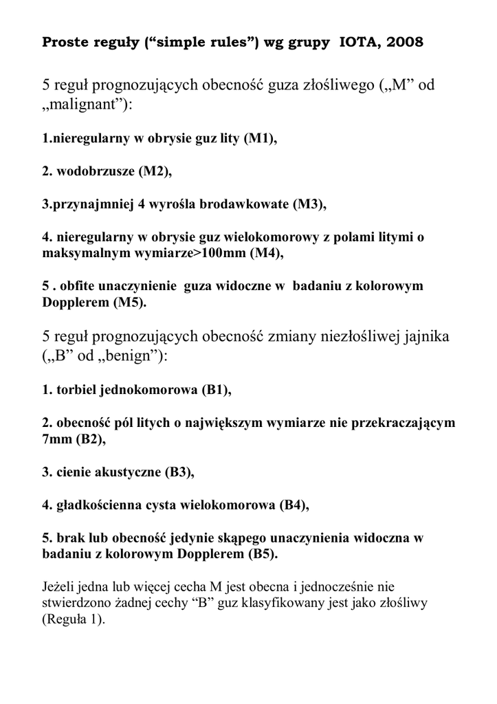 Proste reguły (“simple rules”) wg grupy IOTA, 2008 5 reguł prognozujących obecność guza złośliwego („M” od „malignant”): 1.nieregularny w obrysie guz lity (M1), 2. wodobrzusze (M2), 3.przynajmniej 4 wyrośla brodawkowate (M3), 4. nieregularny w obrysie guz wielokomorowy z polami litymi o maksymalnym wymiarze>100mm (M4), 5 . obfite unaczynienie guza widoczne w badaniu z kolorowym Dopplerem (M5). 5 reguł prognozujących obecność zmiany niezłośliwej jajnika („B” od „benign”): 1. torbiel jednokomorowa (B1), 2. obecność pól litych o największym wymiarze nie przekraczającym 7mm (B2), 3. cienie akustyczne (B3), 4. gładkościenna cysta wielokomorowa (B4), 5. brak lub obecność jedynie skąpego unaczynienia widoczna w badaniu z kolorowym Dopplerem (B5). Jeżeli jedna lub więcej cecha M jest obecna i jednocześnie nie stwierdzono żadnej cechy “B” guz klasyfikowany jest jako złośliwy (Reguła 1). Jeżeli jest obecna jedna lub więcej cech B przy jednoczesnym braku cechy M to guz klasyfikowany jest jako niezłośliwy (Reguła 2). Jeżeli obecne są jednocześnie cechy M oraz B lub żadna z tych cech nie jest obecna, to metoda ta nie daje jednoznacznego wyniku (Reguła 3).