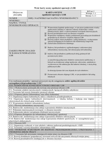 Wzór karty oceny zgodności operacji z LSR Miejsce na pieczątkę KARTA OCENY zgodności operacji z LSR KO nr 1 Wersja: 1.1 Strona 1 z 1 NUMER IMIĘ i NAZWISKO lub NAZWA WNIOSKODAWCY: WNIOSKU: NAZWA / TYTUŁ WNIOSKOWANEJ OPERACJI: Wzmocnienie kapitału społecznego, w tym przez podnoszenie wiedzy społeczności lokalnej w zakresie ochrony środowiska i zmian klimatycznych, także z wykorzystaniem rozwiązań innowacyjnych; Rozwój przedsiębiorczości na obszarze wiejskim Wspierania współpracy między podmiotami prowadzącymi działalność gospodarczą na obszarze wiejskim objętym LSR Rozwój rynków zbytu produktów i usług lokalnych, z wyłączeniem operacji polegającym na budowie lub modernizacji targowisk Zachowania dziedzictwa lokalnego. Budowy lub przebudowy ogólnodostępnej i niekomercyjnej ZAKRES PROW 2014-2020 W RAMACH WDRAŻANIA LSR infrastruktury turystycznej, lub rekreacyjnej lub kulturalnej. budowy lub przebudowy publicznych dróg gminnych lub powiatowych, które: a) umożliwiają połączenie obiektów użyteczności publicznej, w których są świadczone usługi społeczne, zdrowotne, opiekuńczowychowawcze lub edukacyjne dla ludności lokalnej, z siecią dróg publicznych albo b) skracają dystans lub czas dojazdu do tych obiektów; Promowanie obszaru objętego LSR, w tym produktów lub usług lokalnych Czy realizacja projektu / operacji przyczyni się do osiągnięcia celów ogólnych/celów szczegółowych/przedsięwzięć LSR? CO1: WZMOCNIENIE KONKURENCYJNOŚCI OBSZARU LSR CS.1.1 Wykorzystanie potencjału dla rozwoju oraz promocji obszaru LSR P.1. Tworzenie szlaków turystycznych i tematycznych łączących obiekty zabytkowe P.2.Tworzenie lub rozwój elementów promocji obszaru CS.1.2 Poprawa jakości infrastruktury oraz oferty kulturalnej P.3. Organizacja imprez kulturalnych, także o charakterze ponadregionalnym P.4. Organizacja imprez kulturalnych niezwiązanych z lokalną kulturą i tradycją oraz imprez skierowanych do różnych grup wiekowych P.5. Wyposażenia obiektów infrastruktury kultury CS.1.3 Rozwój infrastruktury turystycznej P.6. Budowa lub modernizacja oraz zakup wyposażenia obiektów turystycznych P.7. Wdrażanie innowacyjnych rozwiązań w obszarze turystyki P.8. Podnoszenie jakości zarządzania obiektami turystycznymi CS.1.4 Poprawa dostępności do infrastruktury rekreacyjnej i sportowej P.9. Budowa lub modernizacja oraz zakup wyposażenia obiektów rekreacyjnych P.10. Budowa lub modernizacja oraz zakup wyposażenia obiektów sportowych, w szczególności przy placówkach edukacyjnych CS.1.5 Rozwój OZE P.11. Organizacja wydarzeń, w tym szkoleń z zakresu zachowań proekologicznych i OZE P.12. Tworzenie i rozwój elementów infrastruktury OZE CO2: TWORZENIE WARUNKÓW DO ROZWOJU PRZEDSIĘBIORCZOŚCI, UTRZYMANIA I TWORZENIA MIEJSC PRACY CS.2.1 Tworzenie lub utrzymanie istniejących miejsc pracy na obszarze LSR P.13. Rozwój działalności gospodarczej, tworzenie nowych lub utrzymanie obecnych miejsc pracy P.14. Rozwój przedsiębiorstw działających w obszarze turystyki P.15. Tworzenie inkubatorów przetwórstwa lokalnego P.16. Wsparcie doradcze, szkoleniowe dla działających firm oraz osób zamierzających rozpocząć działalność gospodarczą CS.2.2 Wsparcie działań na rzecz podniesienia poziomu innowacyjności przedsiębiorstw niezwiązanych z turystyką P.17. Wdrażanie innowacyjnych rozwiązań w firmach niezwiązanych z turystyką CS.2.3 Rozwój nowoczesnych form wsparcia instytucji rynku pracy dla osób poszukujących pracy P.18. Projekty doradcze i kształceniowe dla osób poszukujących pracy CO3: WZMACNIANIE KAPITAŁU SPOŁECZNEGO NA OBSZARZE LSR CS.3.1 Przeciwdziałanie różnym formom wykluczenia na obszarze LSR P.19. Projekty służące przeciwdziałaniu wykluczeniu społecznemu, w tym poprzez podnoszenie kompetencji CS.3.2 Poprawa stanu infrastruktury drogowej w zakresie włączenia społecznego P. 20. Budowa lub przebudowa publicznych dróg gminnych lub powiatowych UZASADNIENIE NIEZGODNOŚCI PROJEKTU/OPERACJI Z ZAZNACZONYMI PRZEDSIĘWZIĘCIAMI W LSR: IMIĘ i NAZWISKO CZŁONKA RADY : Głosuję za uznaniem/nie uznaniem* operacji za zgodną z LSR (niepotrzebne skreślić) CZYTELNY MIEJSCE: DATA: PODPIS: PODPIS SEKRETARZA POSIEDZENIA OD INSTRUKCJA WYPEŁNIANIA KARTY: Pola zaciemnione wypełnia biuro LGD przed rozpoczęciem procesu oceny Pola białe wypełnia Członek RADY LGD biorący udział w ocenie zgodności a) Kartę należy wypełnić piórem lub długopisem b) Ocena zgodności polega na wpisaniu znaku „x” w kratce po prawej stronie przy każdym celu/przedsięwzięciu, z którym dana operacja jest zgodna. Zgodność operacji z LSR może występować w więcej niż jednym punkcie (można zaznaczyć więcej kwadracików) Operacja zostanie uznana za zgodną z LSR jeżeli będzie zgodna z: co najmniej jednym celem ogólnym, co najmniej jednym celem szczegółowym oraz co najmniej jednym przedsięwzięciem zapisanym w LSR. c) Nie wpisanie imienia, nazwiska, miejsca, daty i czytelnego podpisu skutkuje nieważnością karty.