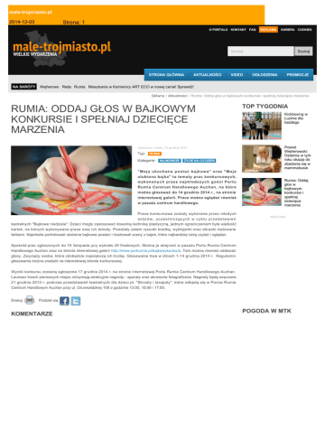 male-trojmiasto.pl 2014-12-03 Strona: 1 O PORTALU KONTAKT FAQ REKLAMA KARIERA COOKIES Szukaj STRONA GŁÓWNA NA SKRÓTY AKTUALNOŚCI VIDEO Szukaj OGŁOSZENIA PROMOCJE Wejherowo Reda Rumia Mieszkania w Kamienicy ART ECO w nowej cenie! Sprawdź! Główna / Aktualności / Rumia: Oddaj głos w bajkowym konkursie i spełniaj dziecięce marzenia RUMIA: ODDAJ GŁOS W BAJKOWYM KONKURSIE I SPEŁNIAJ DZIECIĘCE MARZENIA Utworzono: środa, 03 grudnia 2014 Typ: RUMIA Kategorie: NAJNOWSZE ŻYCIE NA CO DZIEŃ "Moja ukochana postać bajkowa" oraz "Moja ulubiona bajka" to tematy prac konkursowych, wykonanych przez najmłodszych gości Portu Rumia Centrum Handlowego Auchan, na które można głosować do 14 grudnia 2014 r., na stronie internetowej galerii. Prace można oglądać również w pasażu centrum handlowego. Prace konkursowe zostały wykonane przez młodych widzów, uczestniczących w cyklu przedstawień teatralnych "Bajkowe niedziele". Dzieci mogły zastosować dowolną technikę plastyczną, jednym ograniczeniem była wielkość kartek, na których wykonywano prace oraz ich tematy. Powstały zatem rysunki kredką, wyklejanki oraz obrazki malowane farbami. Najmłodsi portretowali ulubione bajkowe postaci i ilustrowali sceny z bajek, które najbardziej lubią czytać i oglądać. TOP TYGODNIA Kickboxing w Luzinie dla każdego Powiat Wejherowski: Ostatnia w tym roku okazja do zbadania się w mammobusie Rumia: Oddaj głos w bajkowym konkursie i spełniaj dziecięce marzenia REKLAMA Spośród prac zgłoszonych do 16 listopada jury wybrało 20 finałowych. Można je obejrzeć w pasażu Portu Rumia Centrum Handlowego Auchan oraz na stronie internetowej galerii http://www.portrumia.pl/bajkowykonkurs. Tam można również oddawać głosy. Zwycięży osoba, która zdobędzie największą ich liczbę. Głosowanie trwa w dniach 1-14 grudnia 2014 r. Regulamin głosowania można znaleźć na internetowej stronie konkursowej. Wyniki konkursu zostaną ogłoszone 17 grudnia 2014 r. na stronie internetowej Portu Rumia Centrum Handlowego Auchan. Laureaci trzech pierwszych miejsc otrzymają atrakcyjne nagrody - aparaty oraz akcesoria fotograficzne. Nagrody będą wręczane 21 grudnia 2014 r. podczas przedstawień teatralnych dla dzieci pt. "Skrzaty i tarapaty", które odbędą się w Porcie Rumia Centrum Handlowym Auchan przy ul. Grunwaldzkiej 108 o godzinie 13:00, 15:00 i 17:00. Drukuj Podziel się KOMENTARZE POGODA W MTK male-trojmiasto.pl 2014-12-03 Strona: 2 REKLAMA Dziś: -2° -9° słonecznie Czwartek: 0° -4° przeważnie słonecznie Piątek: 2° -1° przeważnie słonecznie REKLAMA NOTOWANIA WALUT Data: piątek, 26 września 2014 USD 3,28 0,07% AUD 2,88 0,42% EUR 4,18 0,05% CHF 3,46 -0,02% GBP 5,35 -0,03% JPY 3,01 -0,23% CZK 0,15 -1,25% AKTUALNOŚCI NA SKRÓTY Strona główna Aktualności Video Ogłoszenia Promocje Wejherowo Reda Rumia Mieszkania w Kamienicy ART ECO w nowej cenie! Sprawdź! INFORMACJE O portalu Kontakt FAQ Reklama Kariera Cookies Korzystamy z plików cookies i umożliwiamy zamieszczanie ich osobom trzecim. Pliki cookie pozwalają na poznanie twoich preferencji na podstawie zachowań w serwisie. Uznajemy, że jeżeli kontynuujesz korzystanie z Copyrights 2013 male-trojmiasto.pl serwisu, wyrażasz na to zgodę. (x) Zamknij