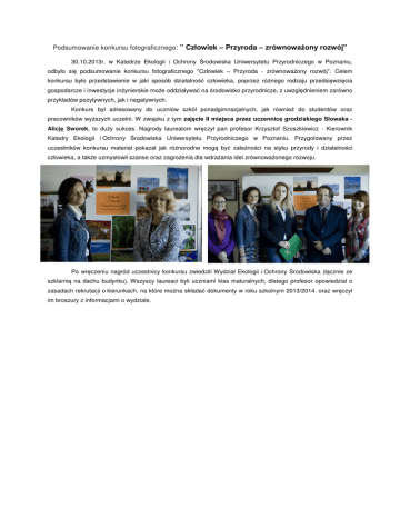Podsumowanie konkursu fotograficznego: " Człowiek – Przyroda – zrównoważony rozwój" 30.10.2013r. w Katedrze Ekologii i Ochrony Środowiska Uniwersytetu Przyrodniczego w Poznaniu, odbyło się podsumowanie konkursu fotograficznego "Człowiek – Przyroda - zrównoważony rozwój". Celem konkursu było przedstawienie w jaki sposób działalność człowieka, poprzez różnego rodzaju przedsięwzięcia gospodarcze i inwestycje inżynierskie może oddziaływać na środowisko przyrodnicze, z uwzględnieniem zarówno przykładów pozytywnych, jak i negatywnych. Konkurs był adresowany do uczniów szkół ponadgimnazjalnych, jak również do studentów oraz pracowników wyższych uczelni. W związku z tym zajęcie II miejsca przez uczennicę grodziskiego Słowaka Alicję Sworek, to duży sukces. Nagrody laureatom wręczył pan profesor Krzysztof Szoszkiewicz - Kierownik Katedry Ekologii i Ochrony Środowiska Uniwersytetu Przyrodniczego w Poznaniu. Przygotowany przez uczestników konkursu materiał pokazał jak różnorodne mogą być zależności na styku przyrody i działalności człowieka, a także uzmysłowił szanse oraz zagrożenia dla wdrażania idei zrównoważonego rozwoju. Po wręczeniu nagród uczestnicy konkursu zwiedzili Wydział Ekologii i Ochrony Środowiska (łącznie ze szklarnią na dachu budynku). Wszyscy laureaci byli uczniami klas maturalnych, dlatego profesor opowiedział o zasadach rekrutacji o kierunkach, na które można składać dokumenty w roku szkolnym 2013/2014. oraz wręczył im broszury z informacjami o wydziale.